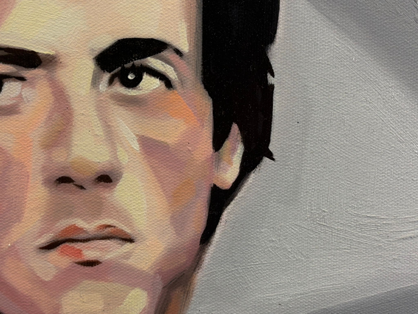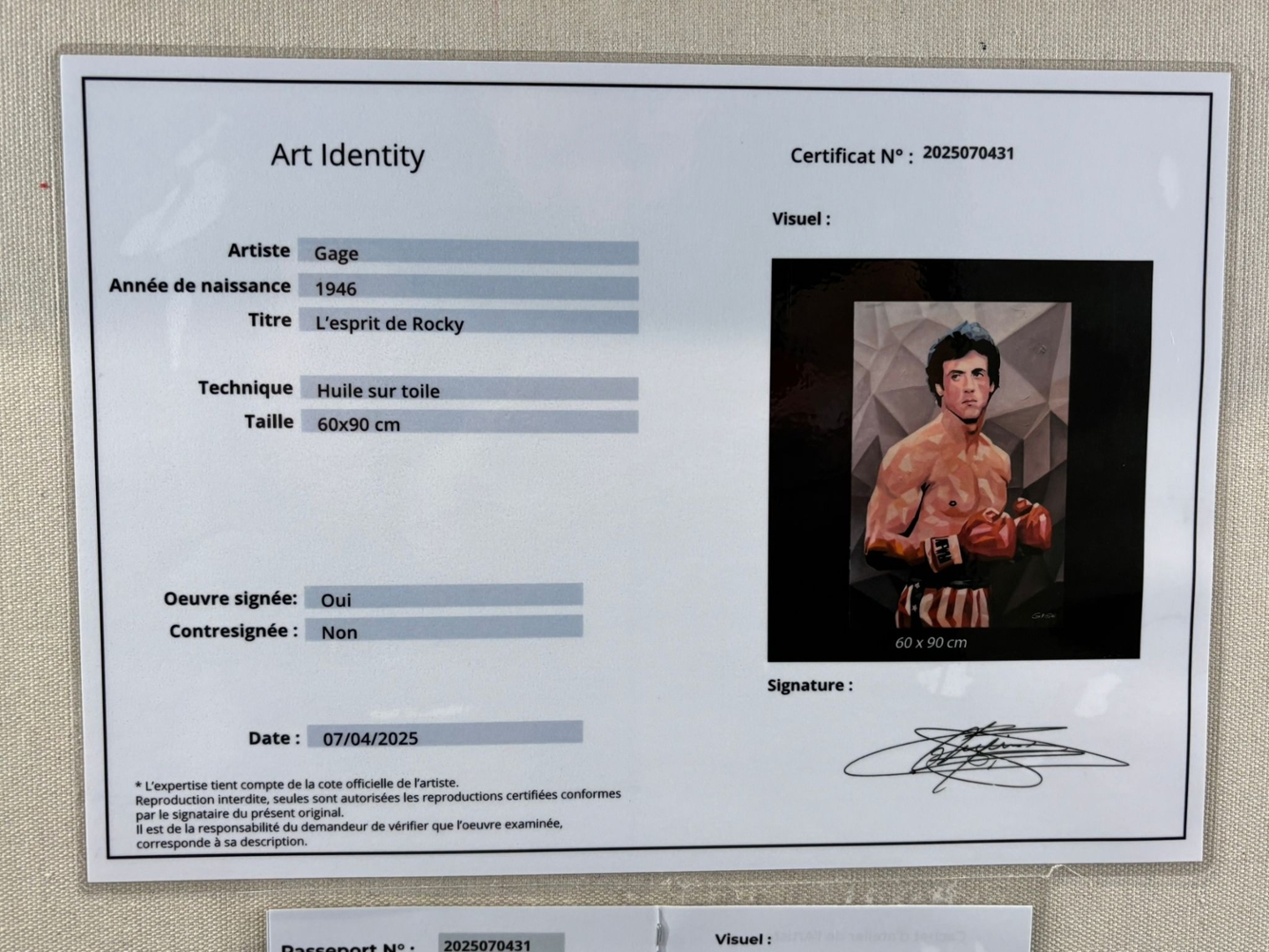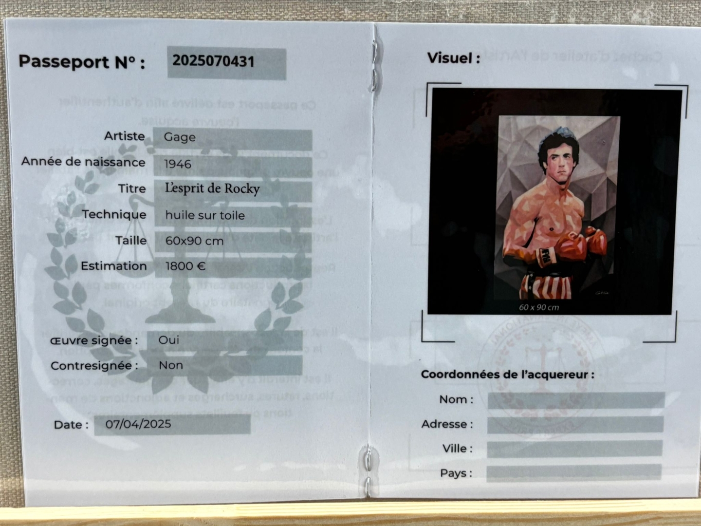 A white-framed original oil painting by the talented artist Gage, L’esprit de Rocky is a bold and modern tribute to one of cinema’s most iconic underdogs. Measuring 90cm x 60cm, this dynamic piece captures Rocky Balboa in his signature pose—gloves up, eyes focused, ready to fight. Rendered in a faceted, geometric style, Gage reinterprets the classic character with a fresh, contemporary edge.