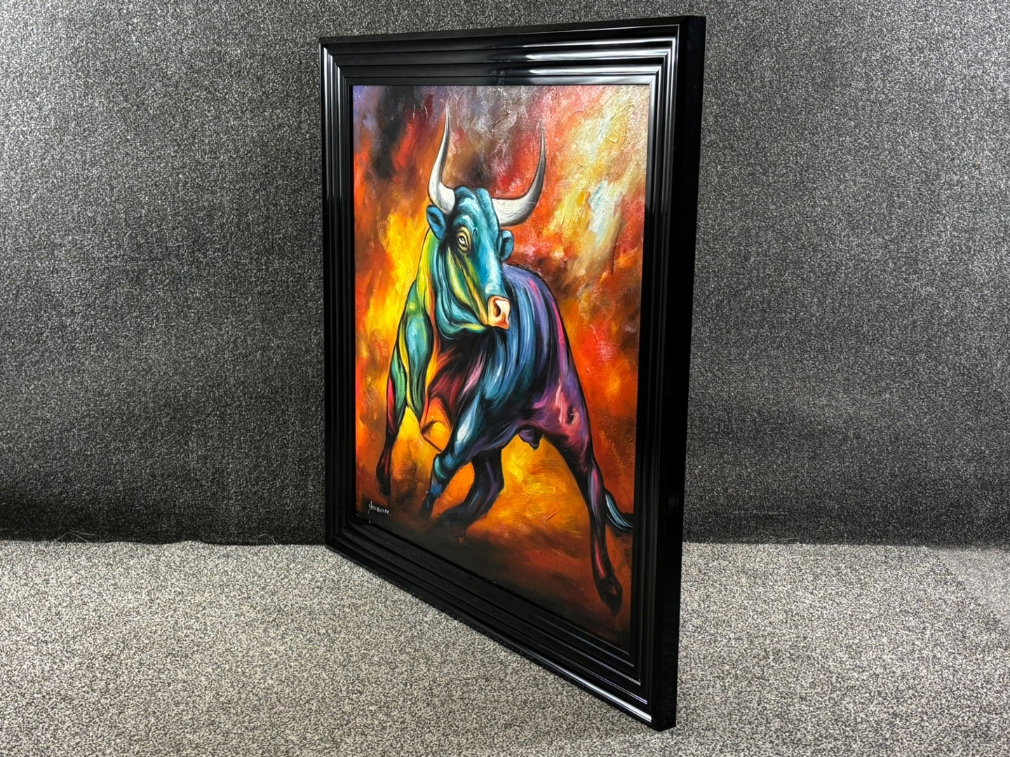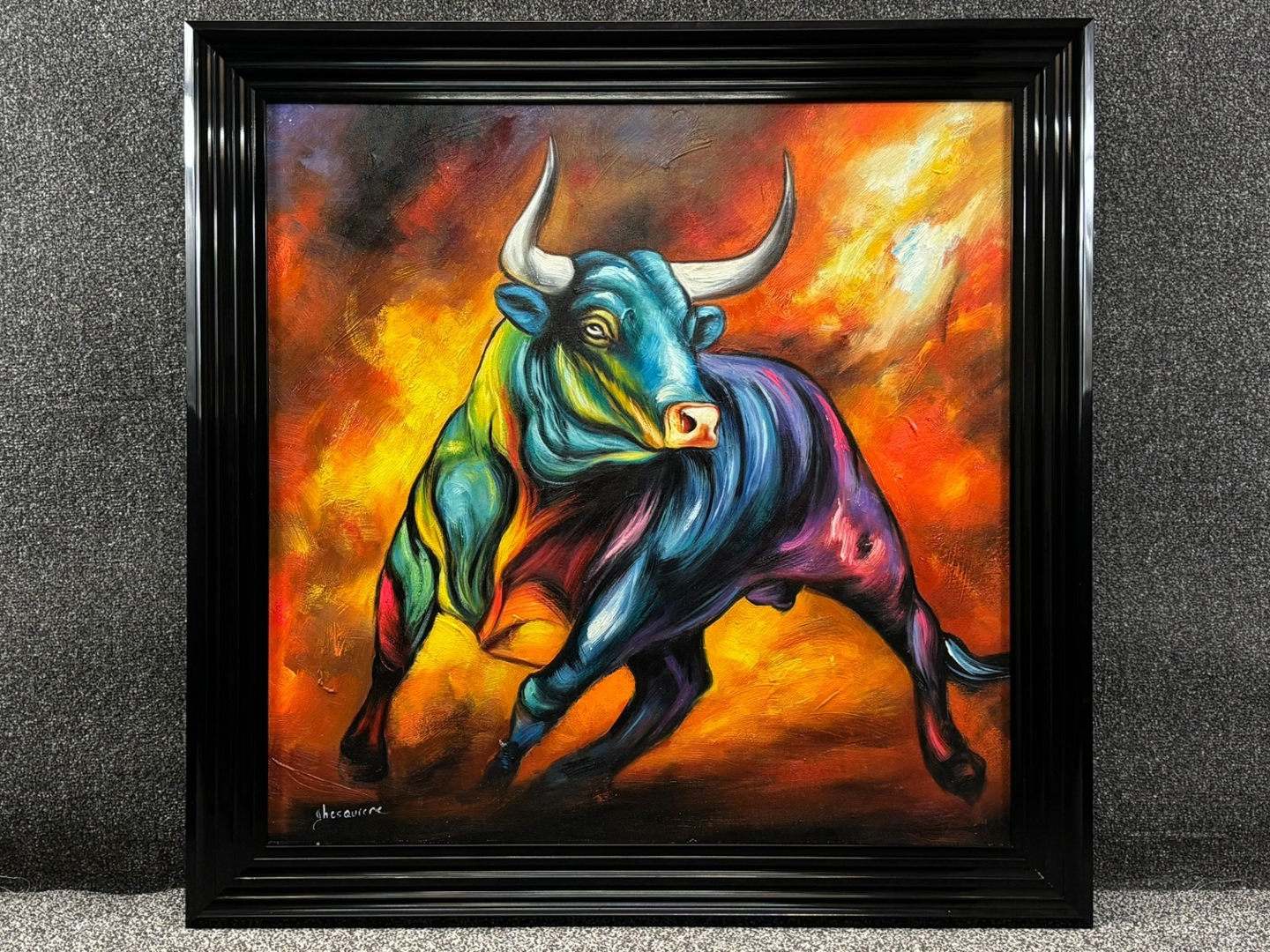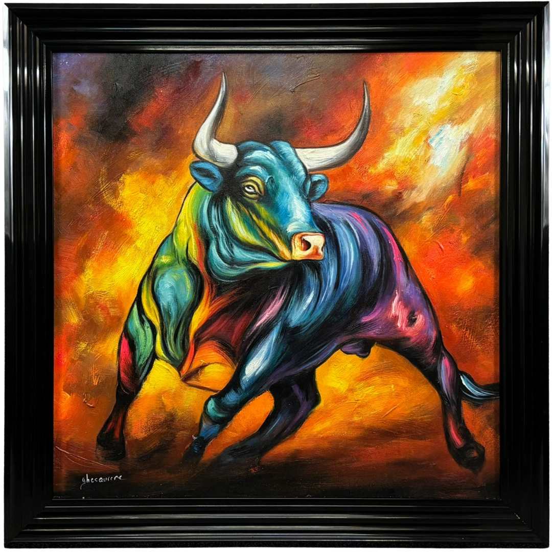 A black framed original oil painting by the bold and expressive artist Ghesquiere, Expression Taurine is a visual explosion of colour and raw power. Measuring 80cm x 80cm, this masterpiece captures a dynamic bull in motion—its muscular form bursting with movement, energy, and spirit.