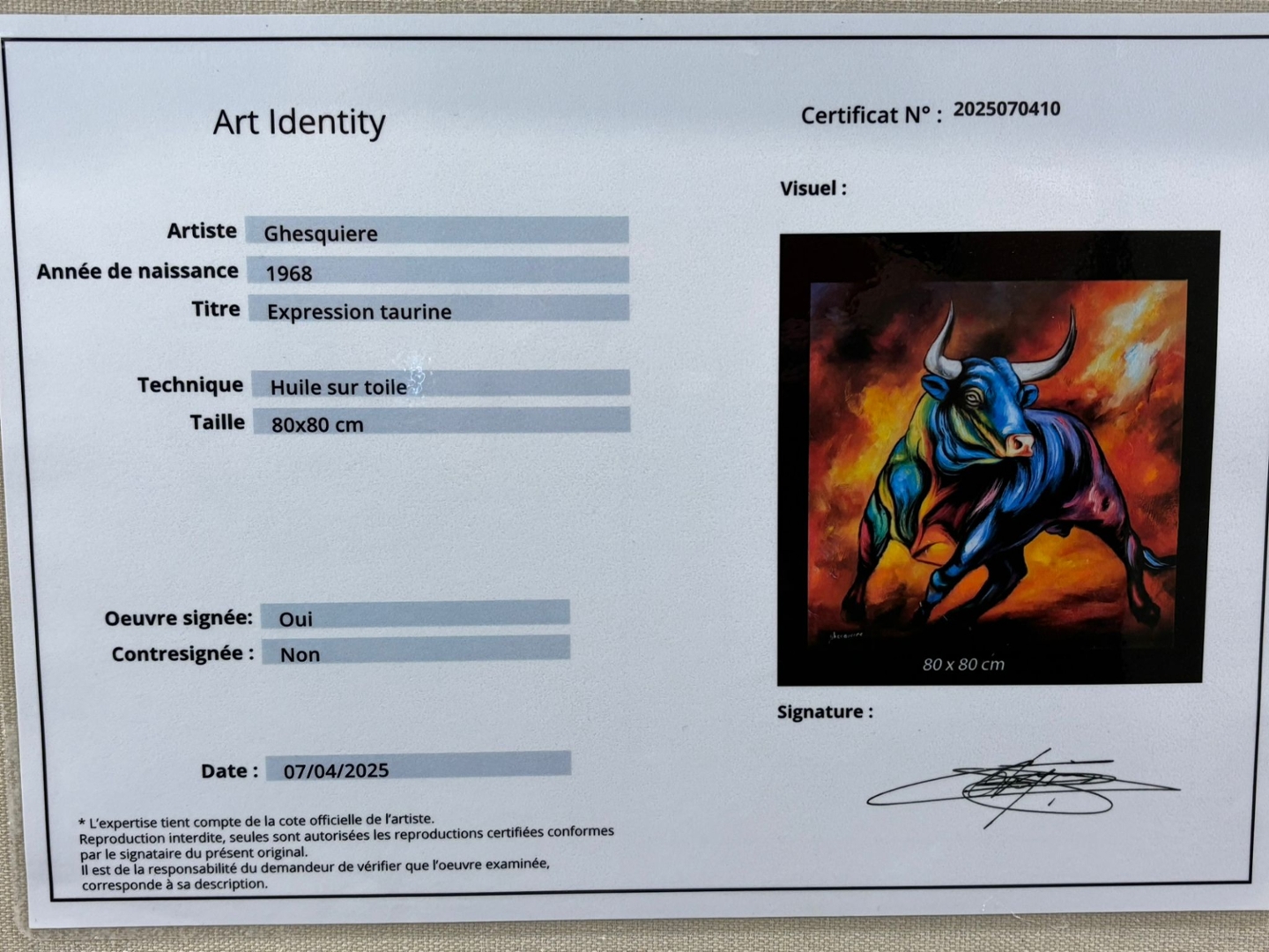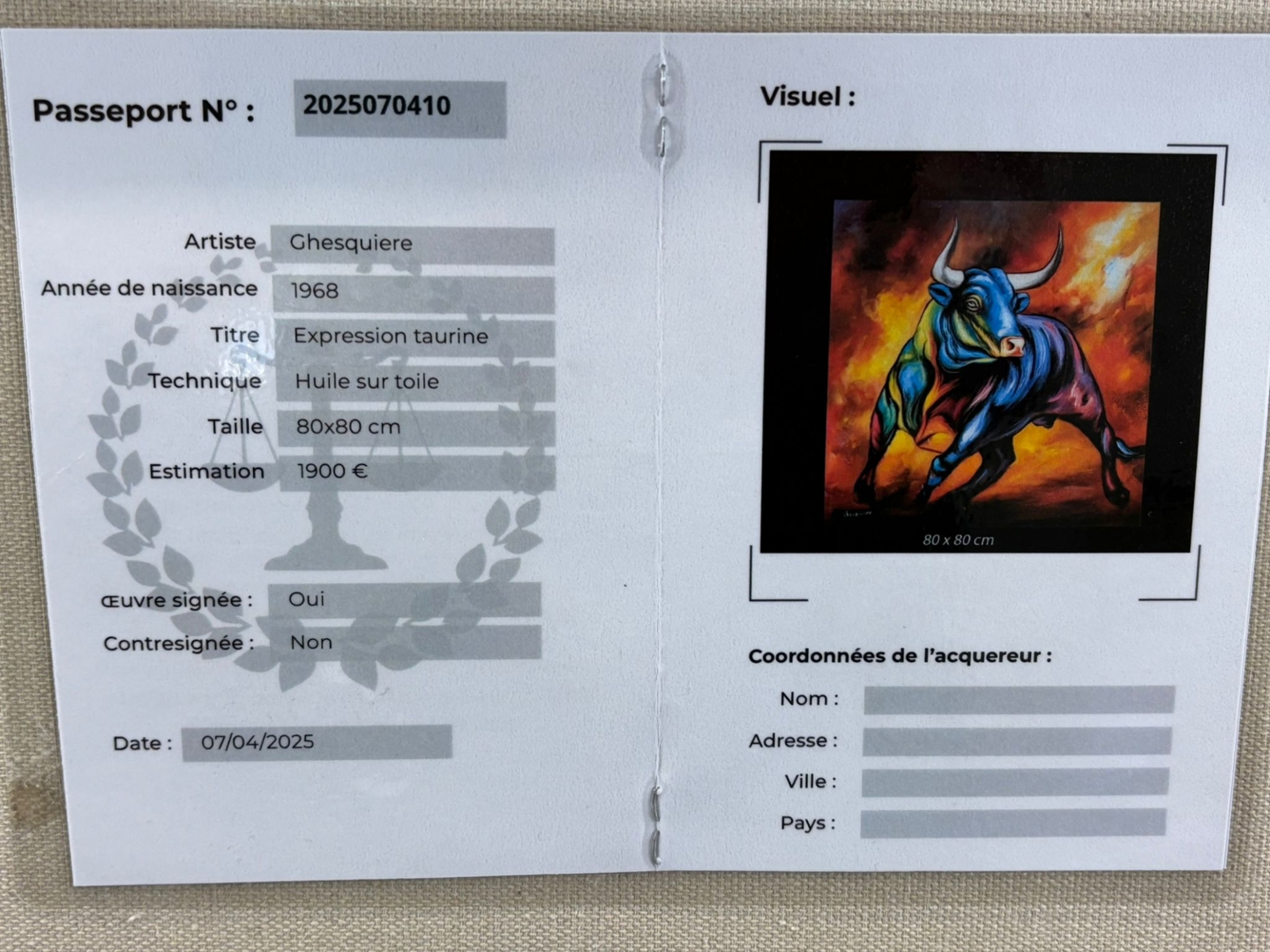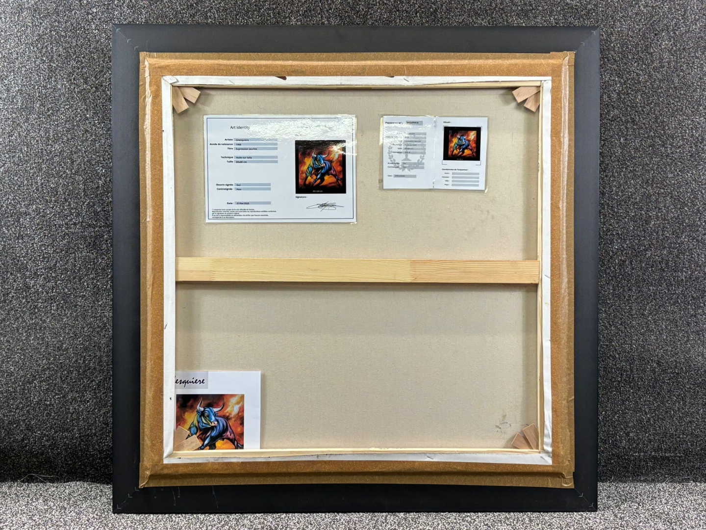 Encased in a sleek black frame that intensifies its dramatic presence, this piece roars with emotion and confidence. Valued at €1900, Expression Taurine is a celebration of power and individuality—perfect for collectors seeking an artwork that refuses to be ignored.