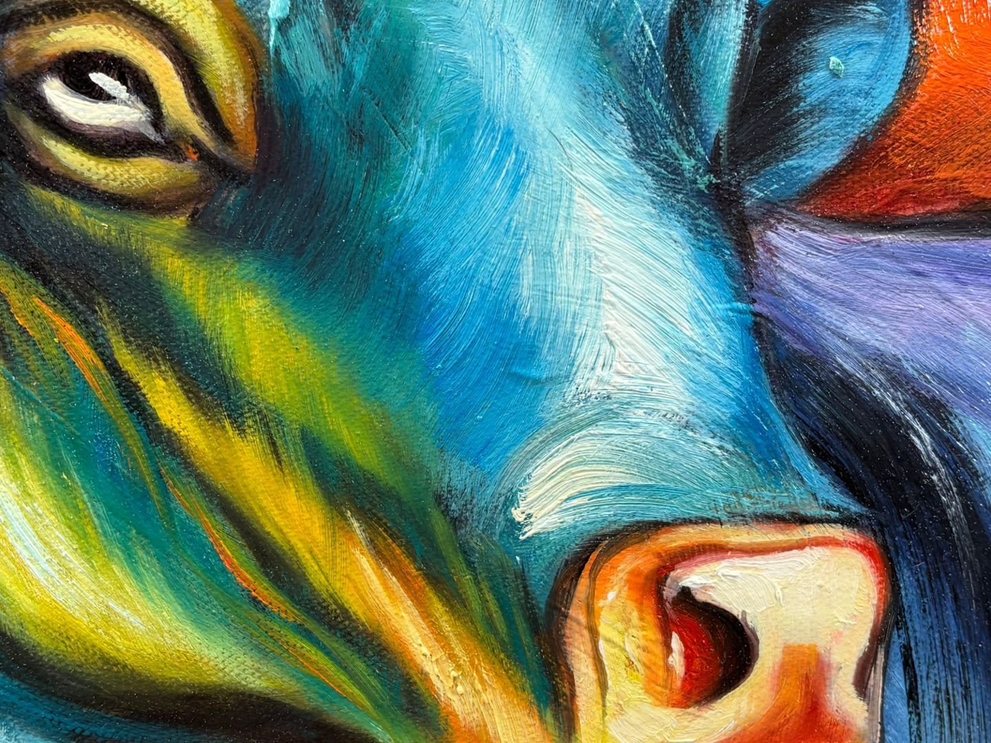 Bathed in a blaze of fiery oranges and molten yellows, the background evokes passion, tension, and drama. Against this backdrop, the bull itself is a kaleidoscope of electric blues, radiant purples, vivid greens and hot pinks—each brushstroke a testament to strength, pride, and unstoppable vitality.