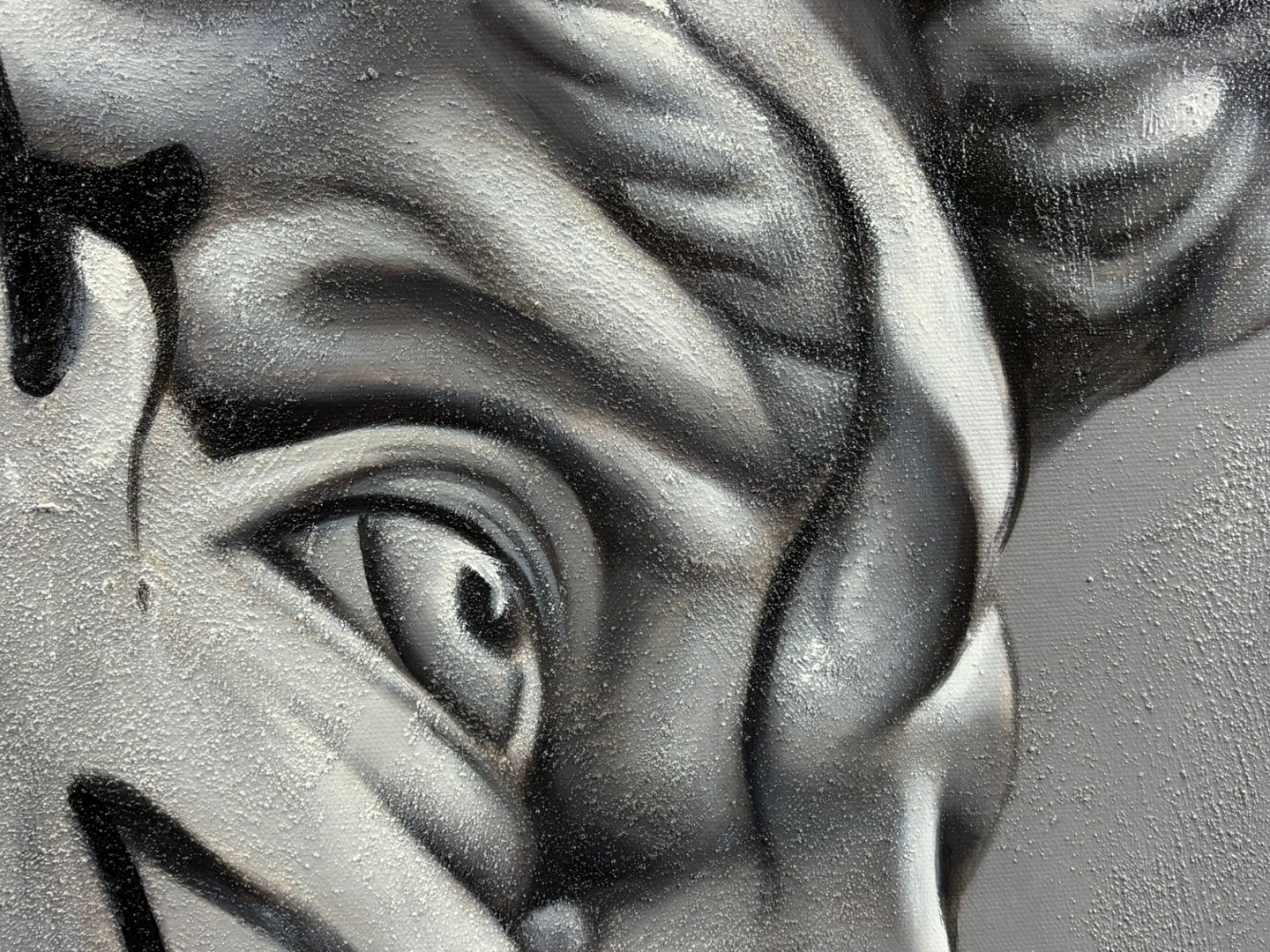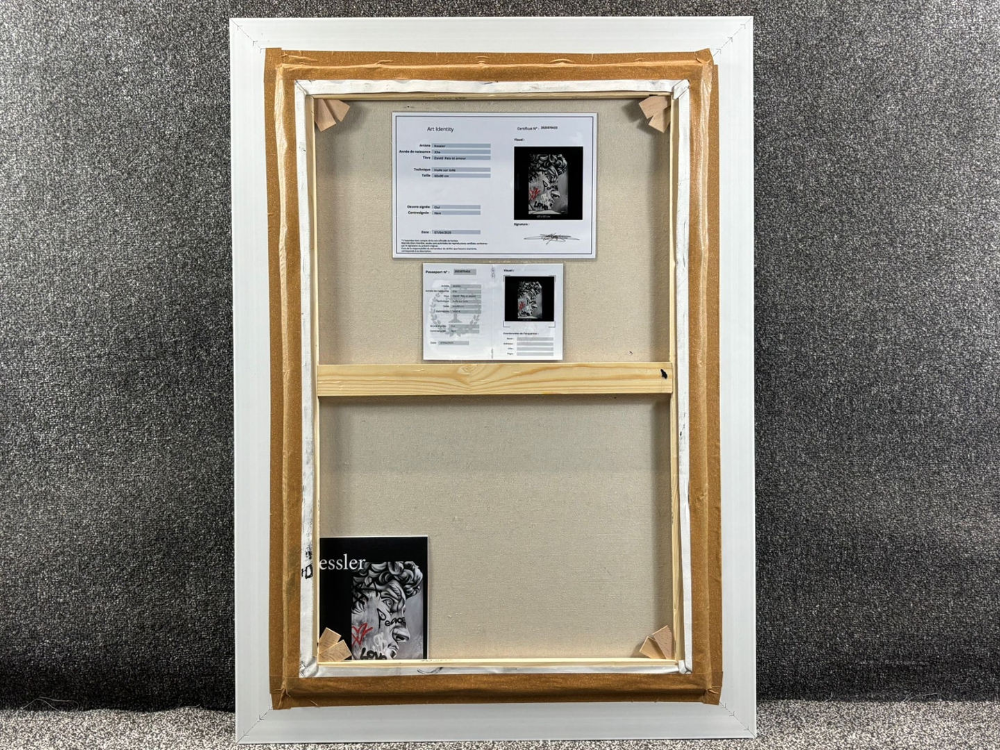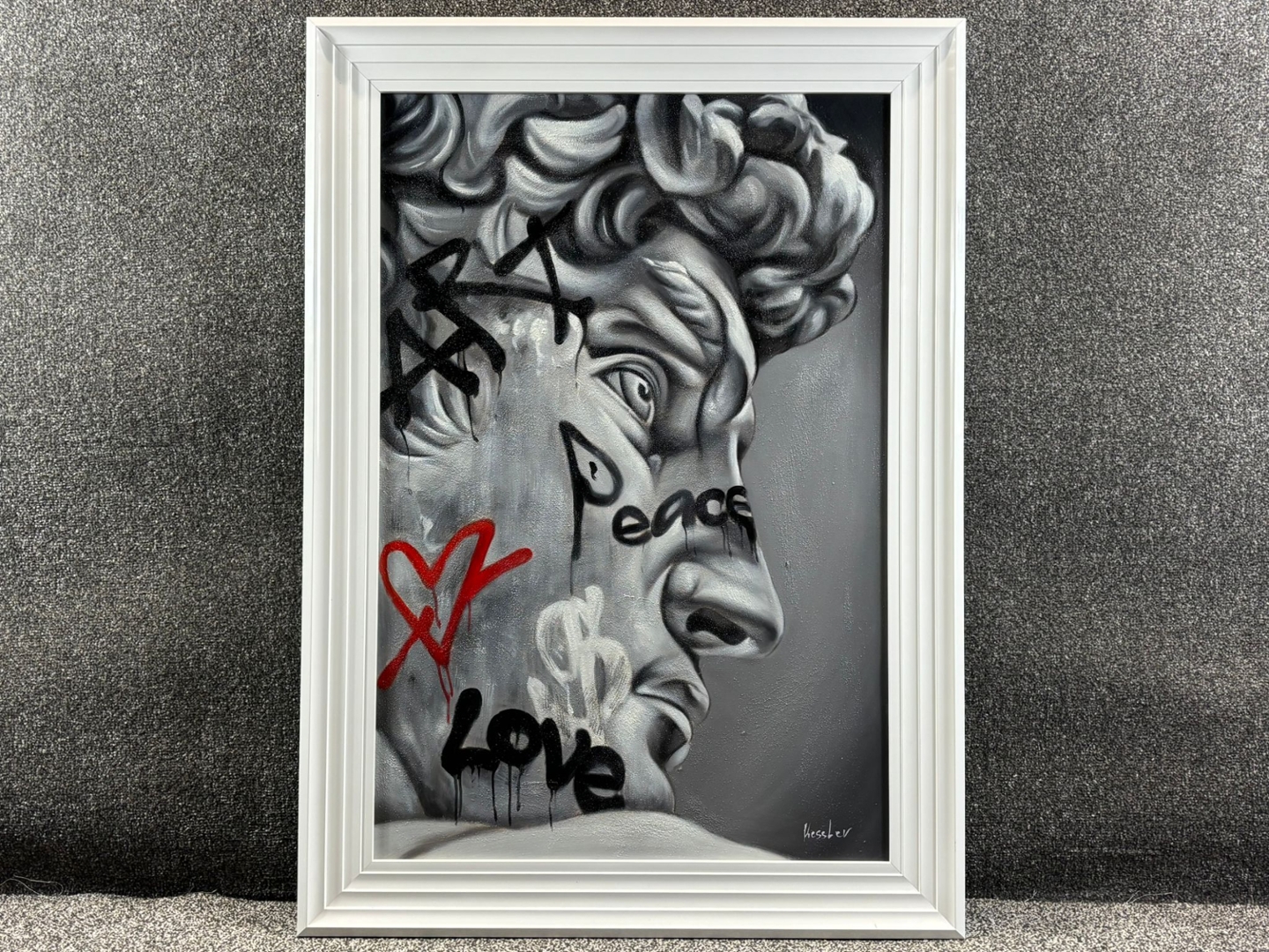 A white-framed original oil painting by the artist Kessler, David Paix et Amour is a bold and compelling reinterpretation of classical art through a contemporary, urban lens. Measuring 90cm x 60cm, this striking piece depicts the iconic profile of Michelangelo’s David, rendered in monochromatic detail and layered with expressive graffiti tags that speak of peace, love, and artistic rebellion.