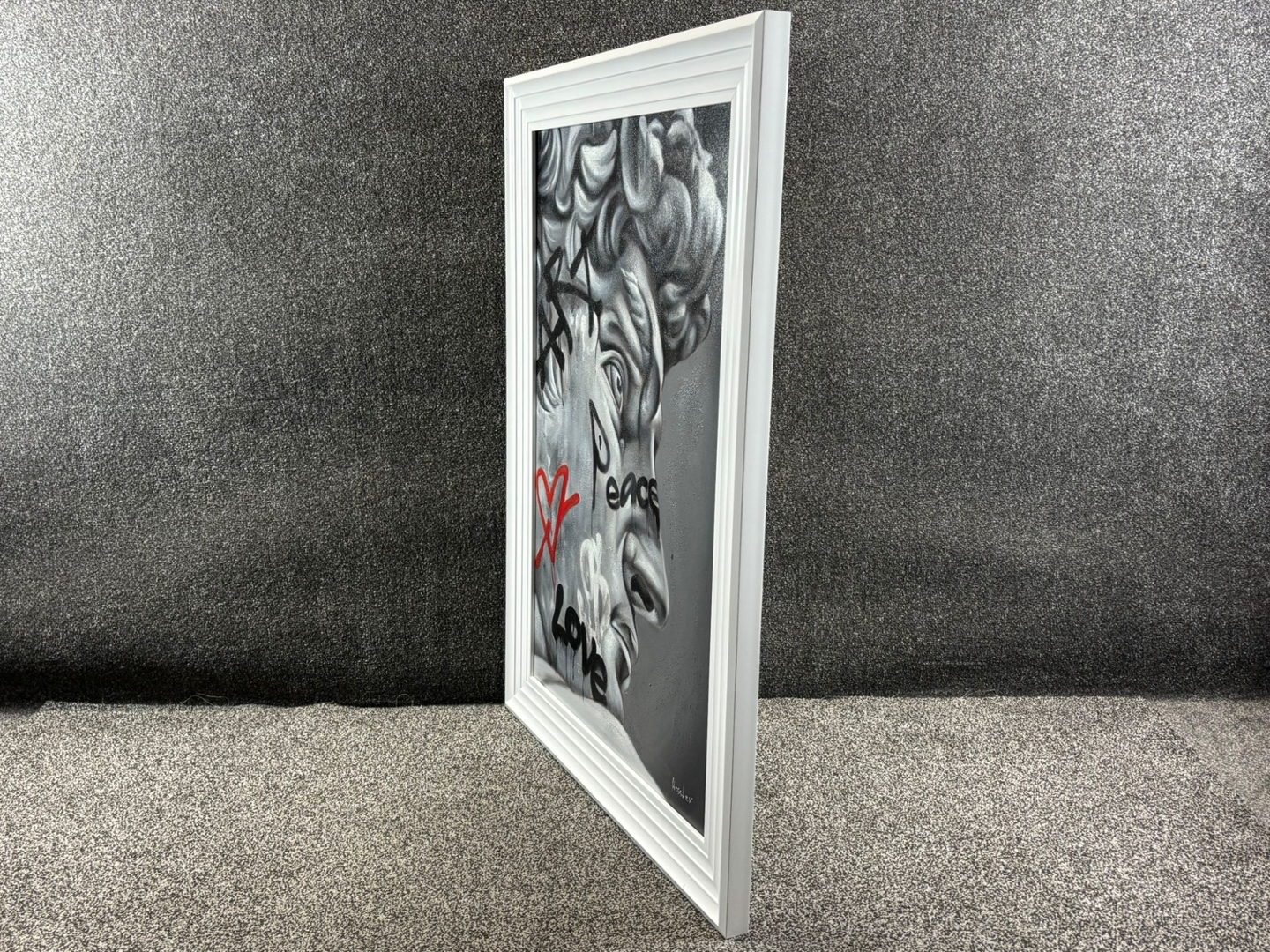 Kessler infuses the timeless marble visage with vibrant street-art elements—dripping black and red spray paint spelling out “ART,” “Peace,” “Love,” and symbols of currency and emotion. The raw, defaced elegance of David's expression contrasts powerfully with the underlying message of hope and resistance. The crisp white frame brings a modern finish that enhances the work’s provocative impact.