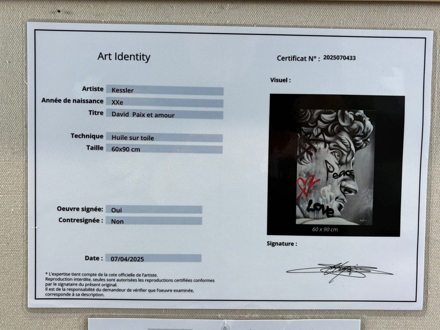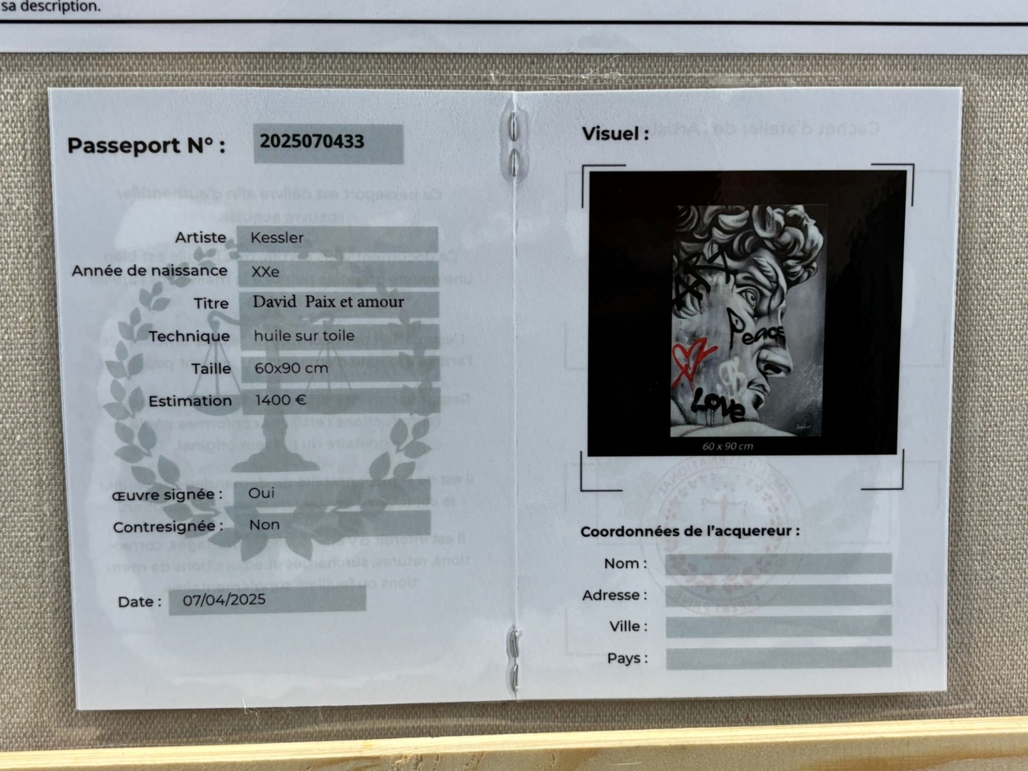 Valued at €1400, David Paix et Amour is a fearless statement piece that bridges the old world and the new, making it a must-have for collectors of contemporary, message-driven art.