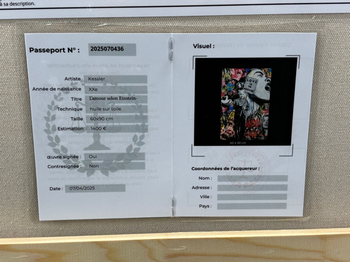 Valued at €1400, L’amour Selon Einstein is a compelling, statement-making artwork—perfect for collectors who seek meaning, emotion, and cultural depth in contemporary art.