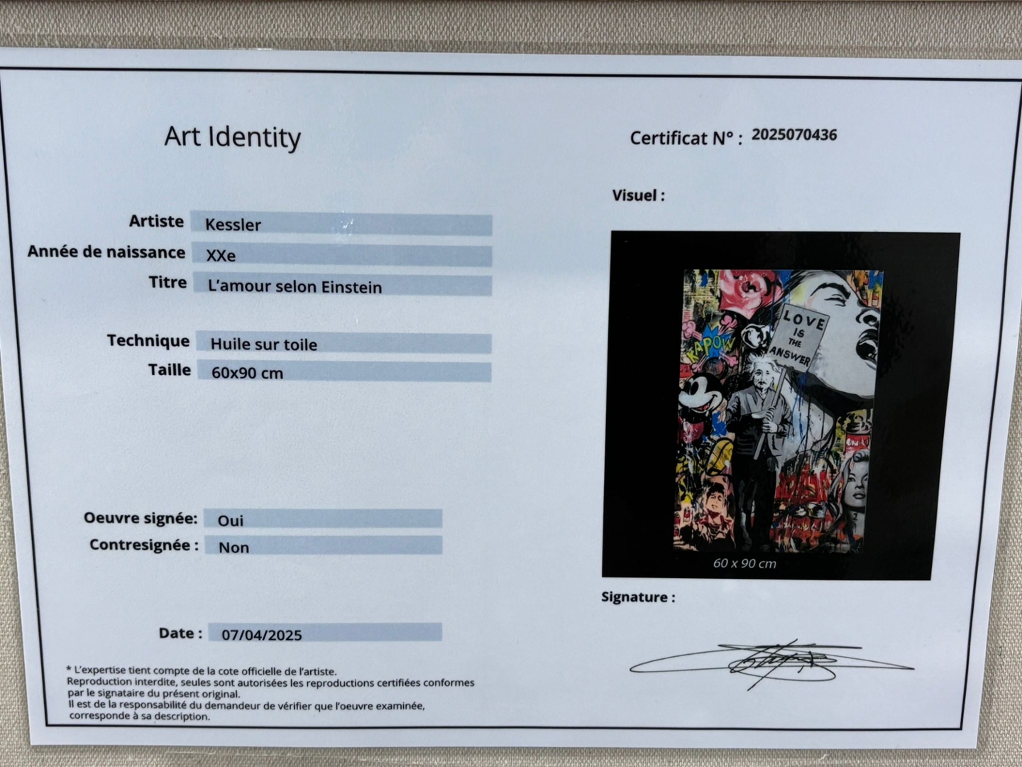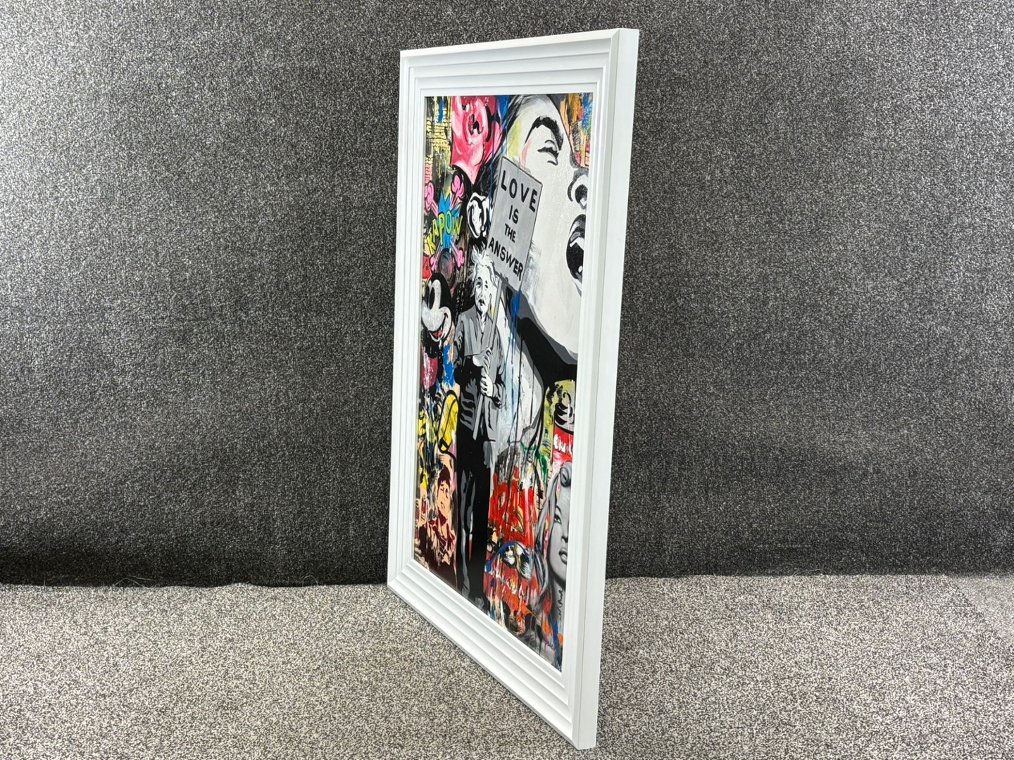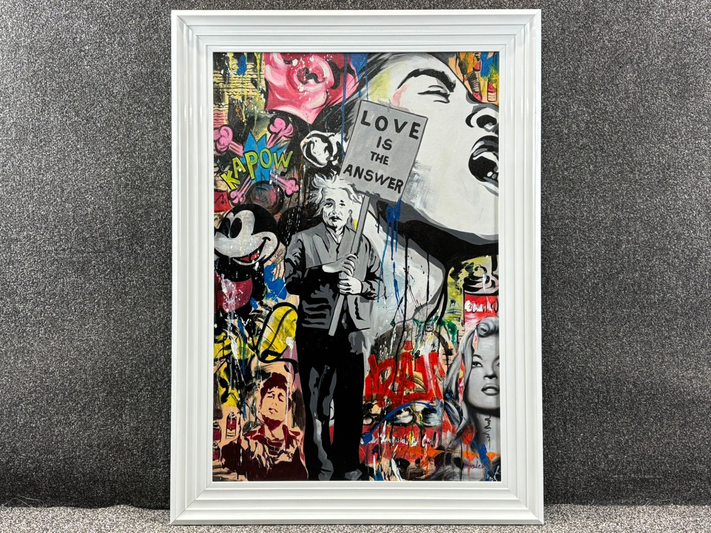 A white-framed original oil painting by the bold and expressive artist Kessler, L’amour Selon Einstein is a vivid pop-art masterpiece that combines street-style aesthetics with an inspiring message. Measuring 90cm x 60cm, this dynamic work features Albert Einstein holding a placard that reads “LOVE IS THE ANSWER,” set against a riot of colour, graffiti, and iconic imagery from pop culture.