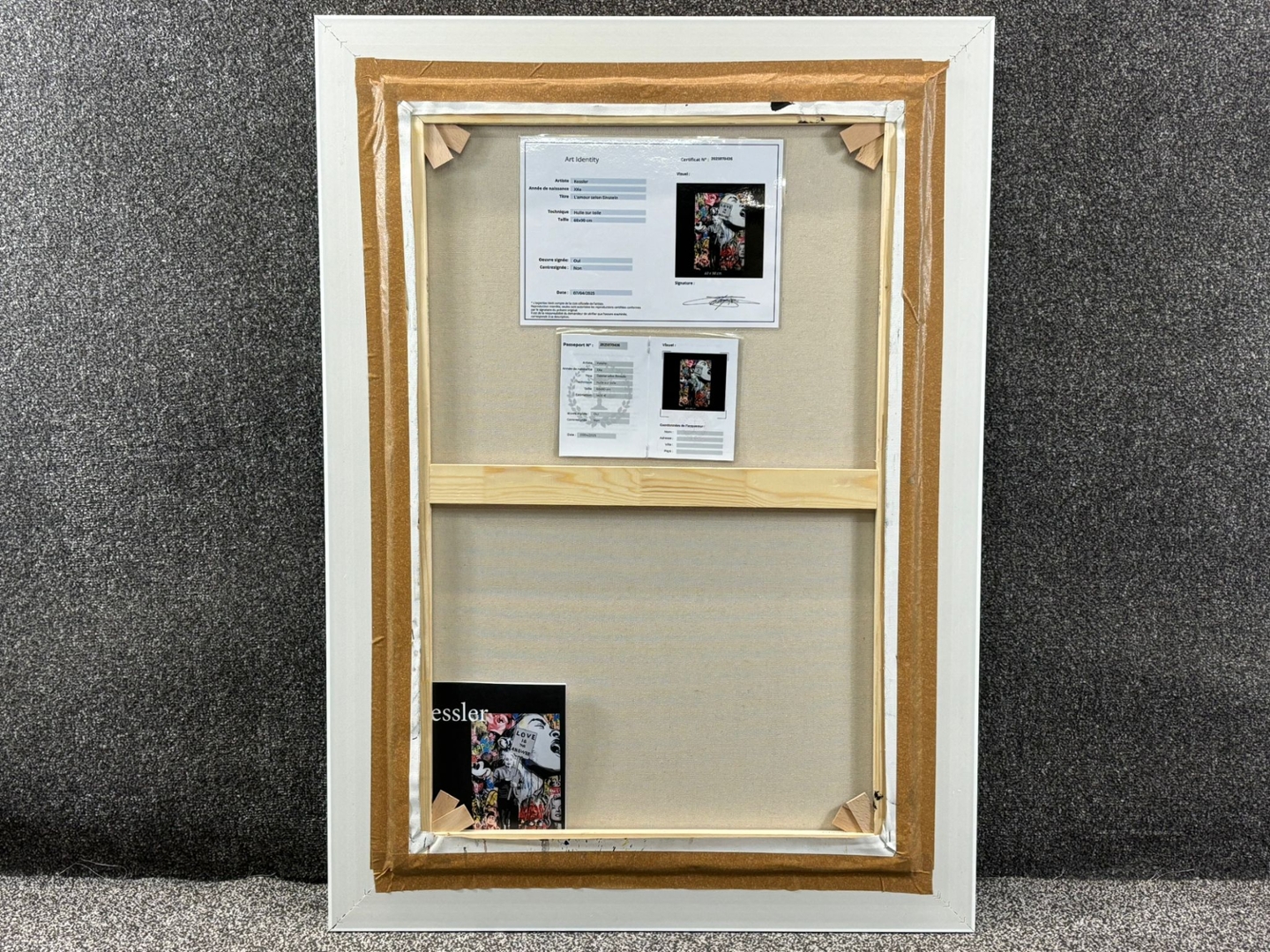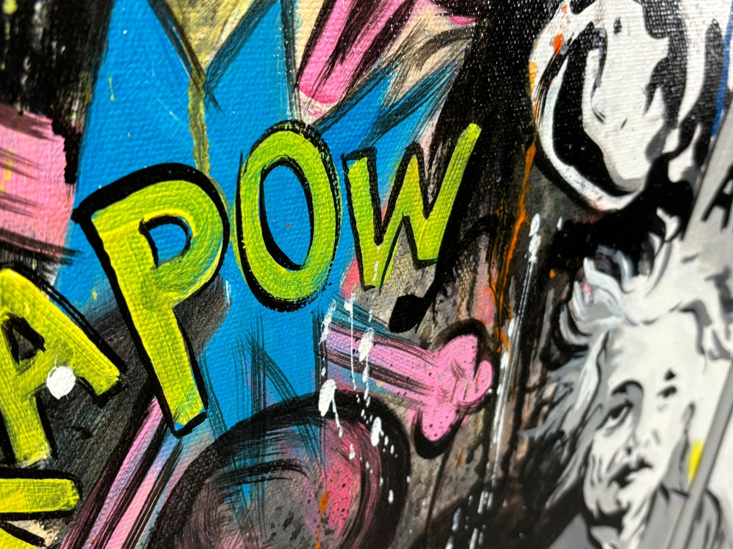 From cartoon characters and urban textures to the soulful portrait of a woman in mid-song, Kessler’s layered composition creates an energetic visual tapestry. Einstein’s grayscale figure provides a calm, grounded centre amid the chaos, reinforcing the power of his message. The blend of fine art and street art techniques gives the piece an edgy, modern vibe, while the clean white frame offers a sleek contrast that brings all the vibrant elements together.