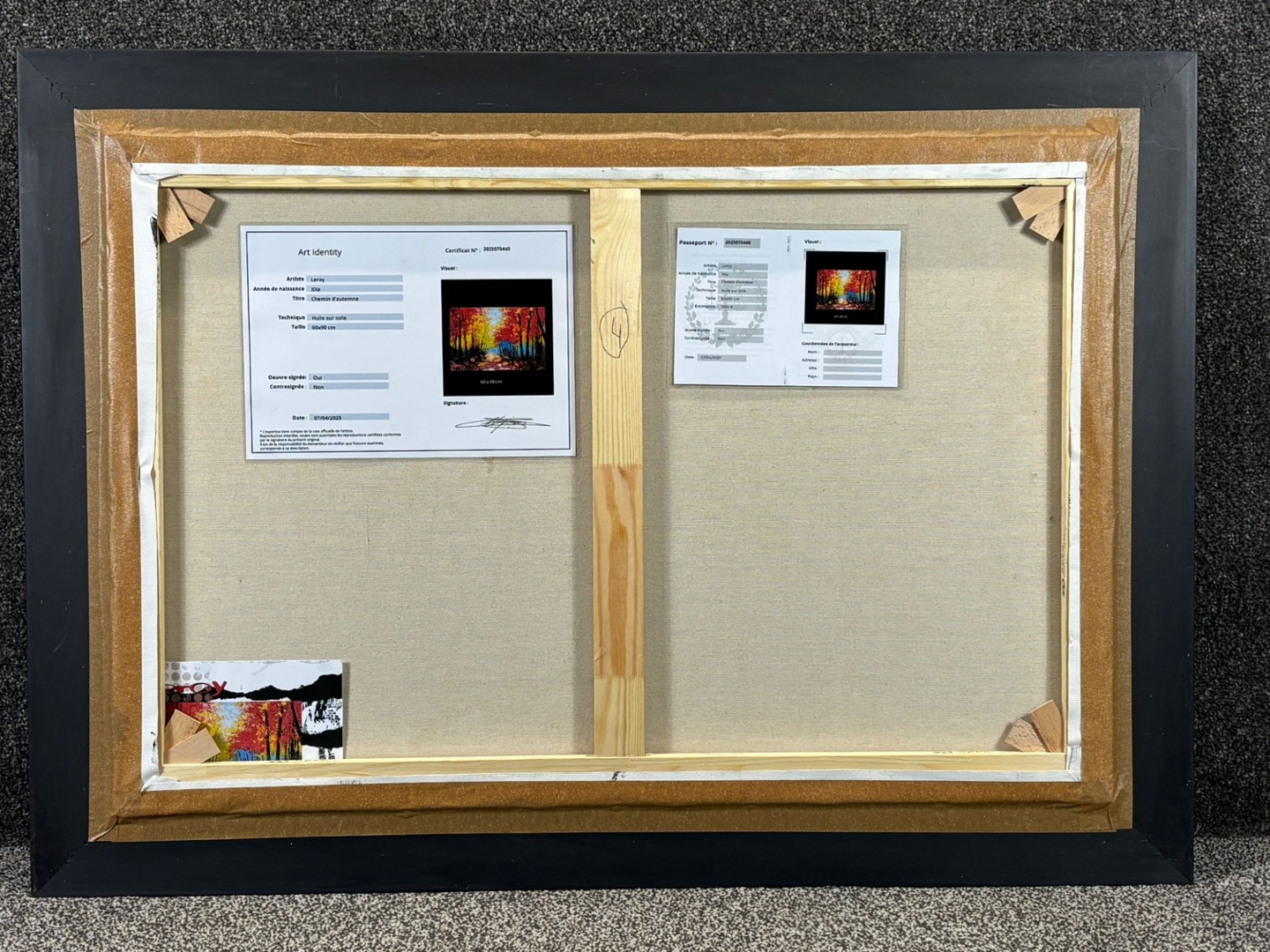 A black framed original oil painting by the artist Leroy titled Chemin D'automne.