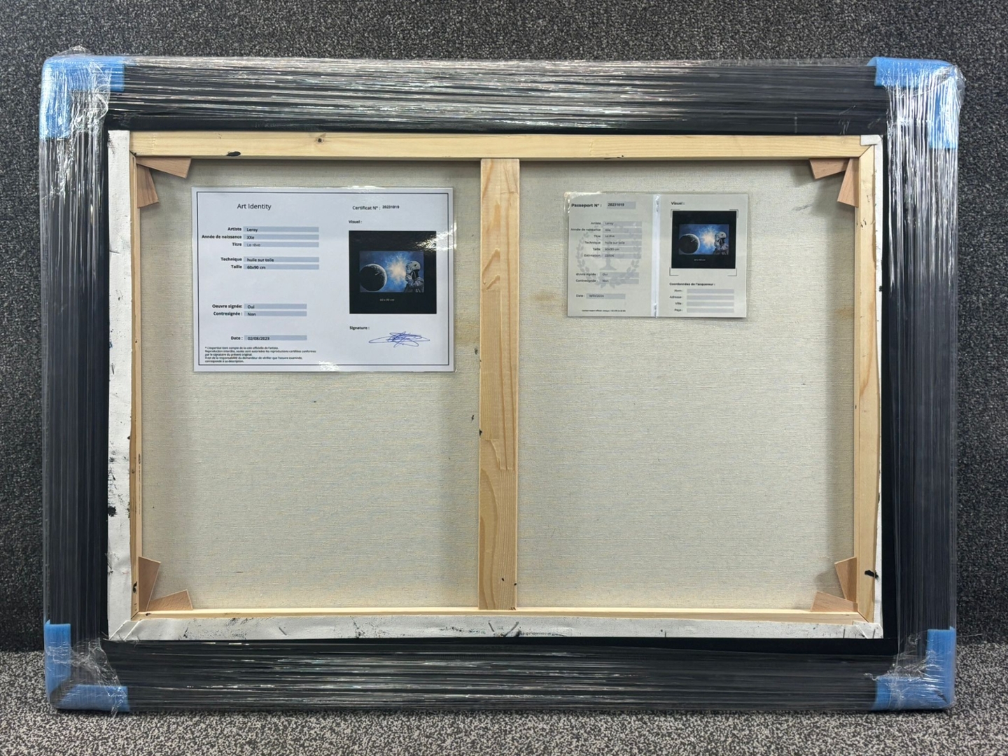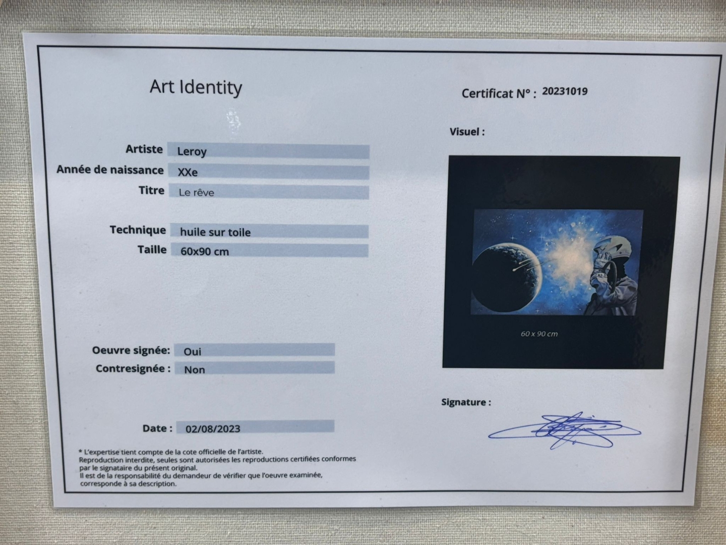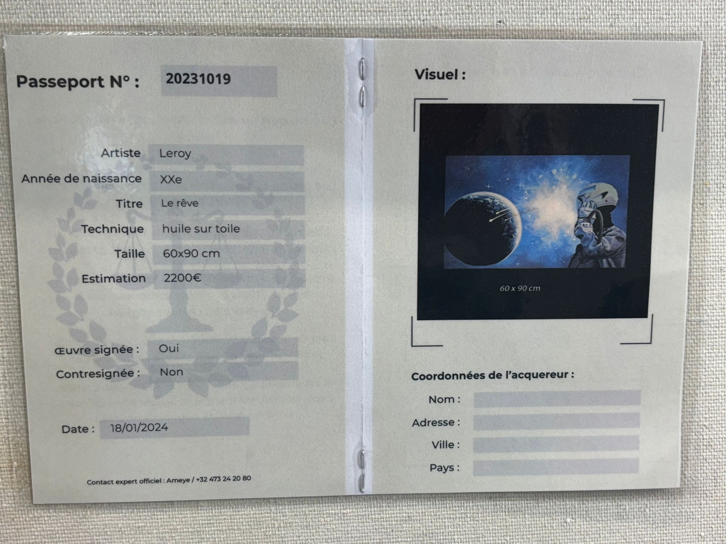 The silver frame enhances the painting’s cool, ethereal palette, giving it a sleek, contemporary finish that perfectly complements the futuristic theme. With a title that translates to “The Dream,” La Rêve evokes a sense of exploration not just through space, but through the imagination itself. Valued at €2200, this original piece by Leroy is an extraordinary collector’s artwork—perfect for those seeking beauty, mystery, and a touch of the infinite.