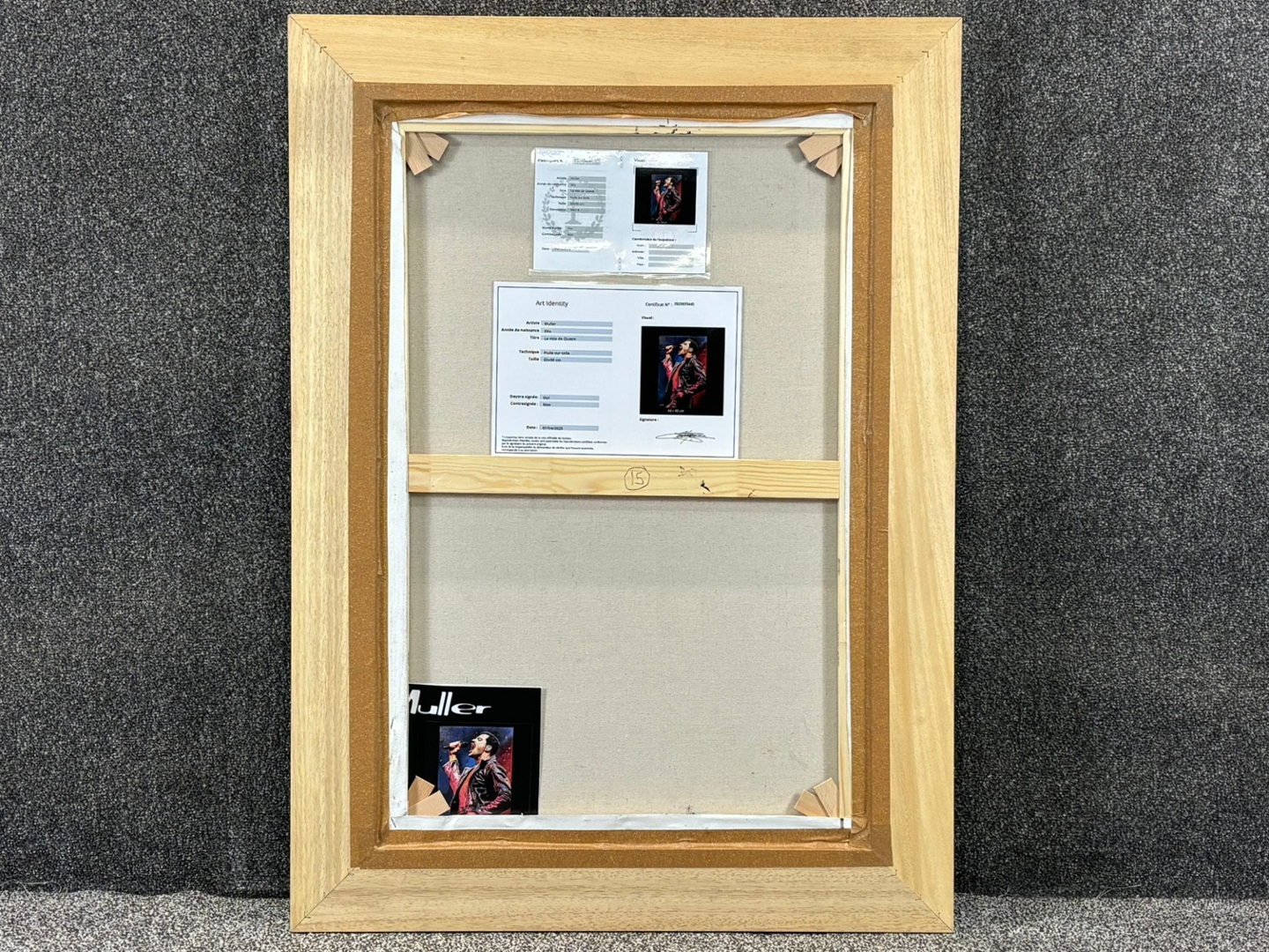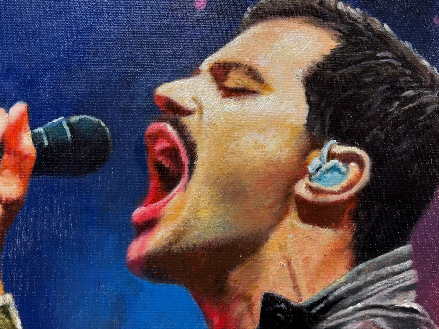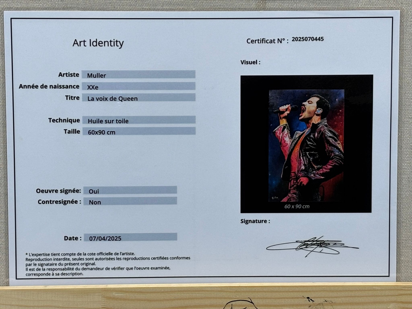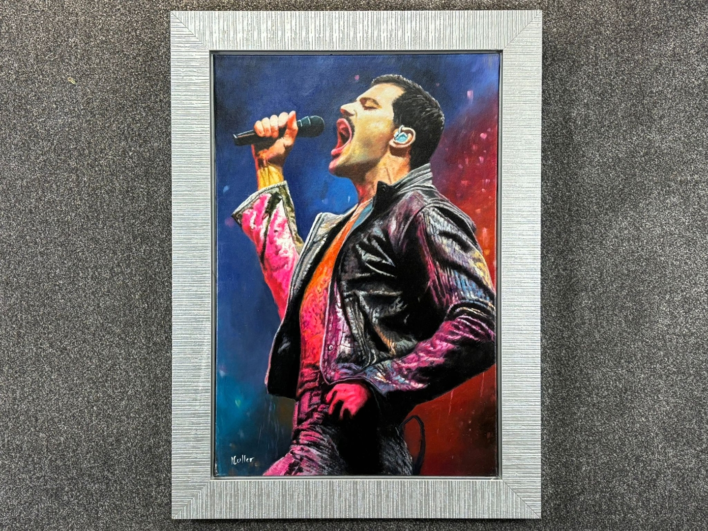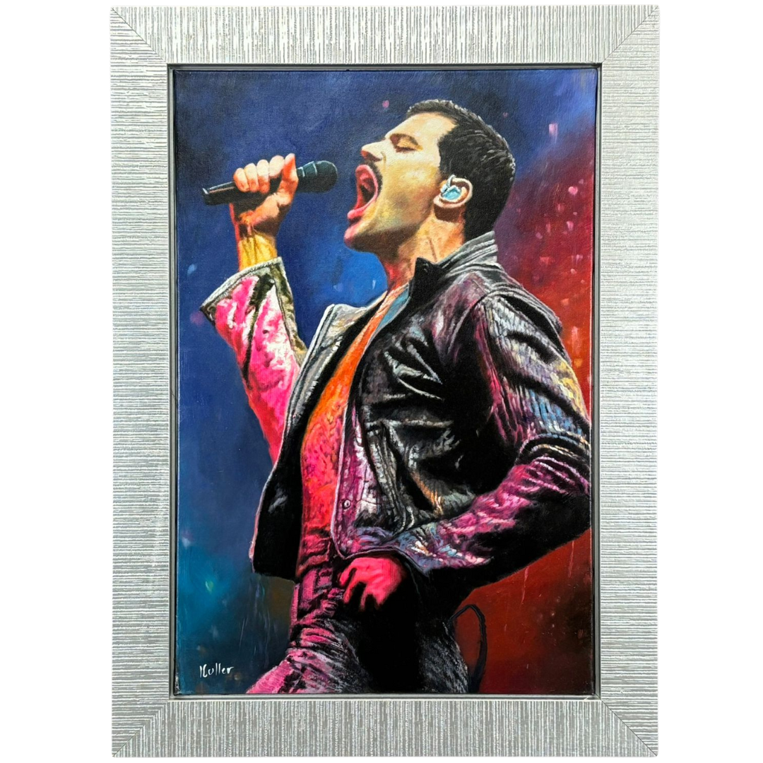 An original oil painting by the artist Muller, titled La Voix de Queen, is a vibrant tribute to the legendary Freddie Mercury. Measuring 90cm x 60cm, the piece captures the magnetic stage presence and commanding energy of one of rock’s greatest icons. With a microphone in hand and passion etched across his face, Mercury is immortalised mid-performance — a moment that embodies his fearless artistry and unmistakable charisma.
