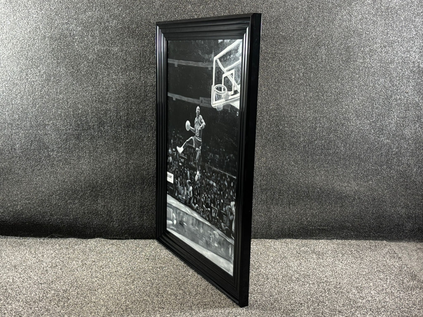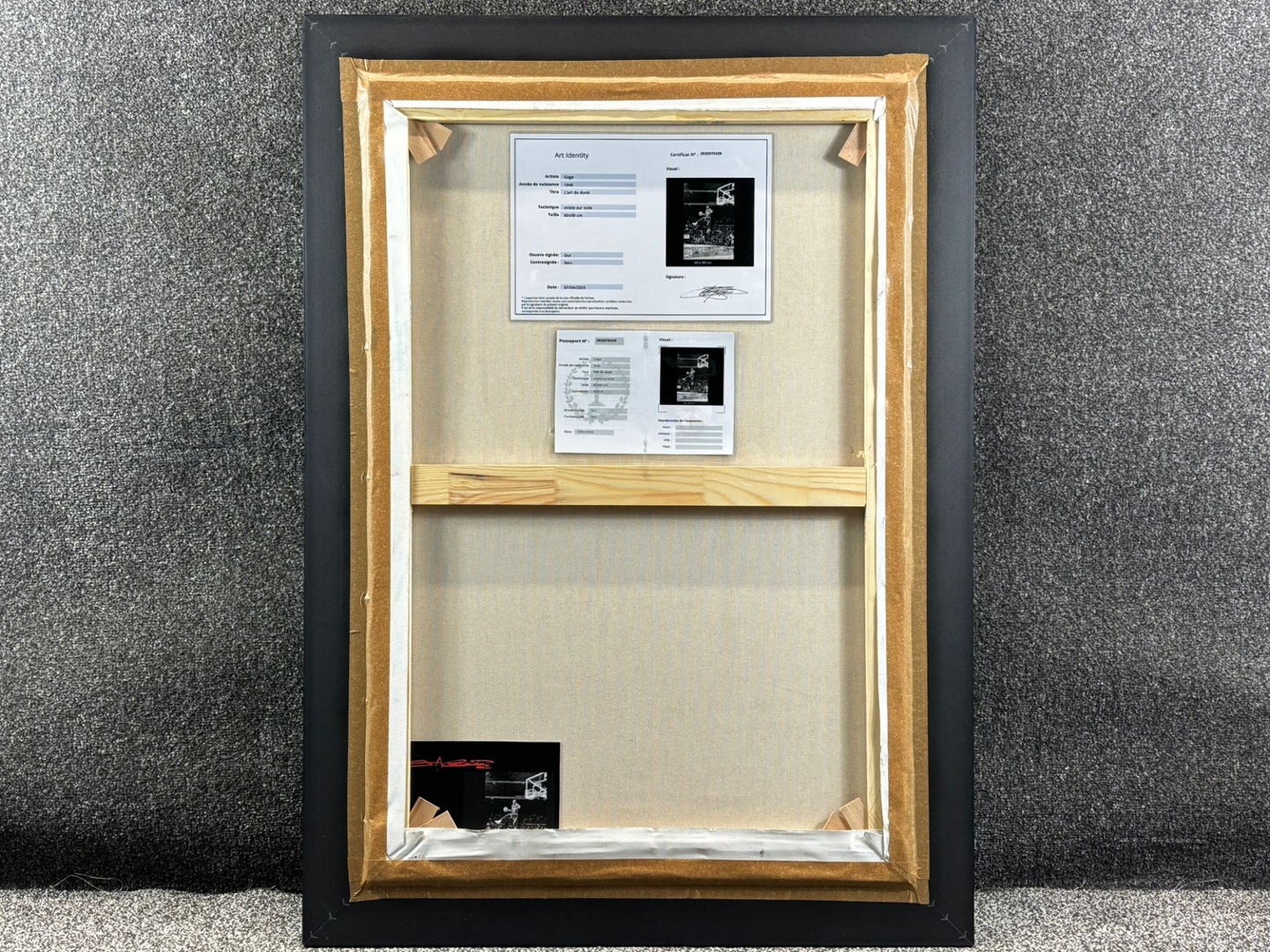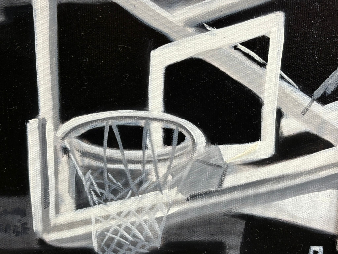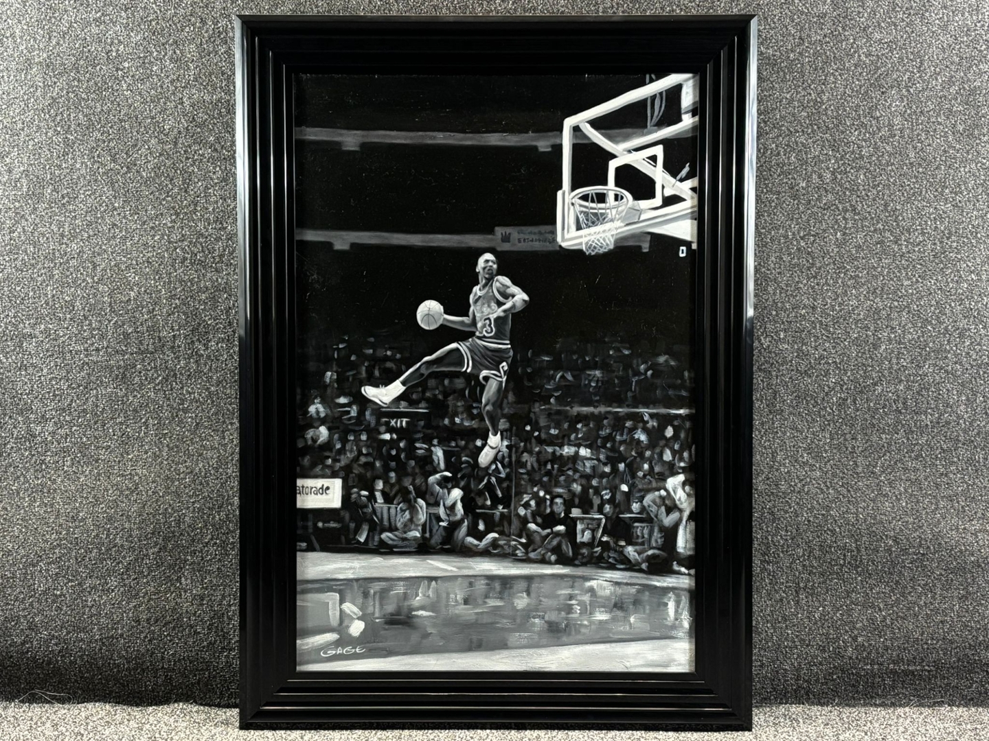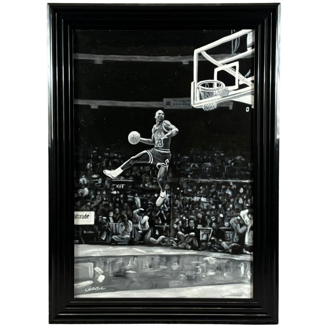 A black-framed original oil painting by the artist Gage, L’art du Dunk is a dynamic monochrome tribute to the electrifying artistry of basketball. Measuring 90cm x 60cm, this striking piece captures a gravity-defying moment mid-flight, as the iconic figure soars toward the hoop with poise, power, and precision. The composition celebrates not only the athleticism of the player but also the poetry of the sport itself.