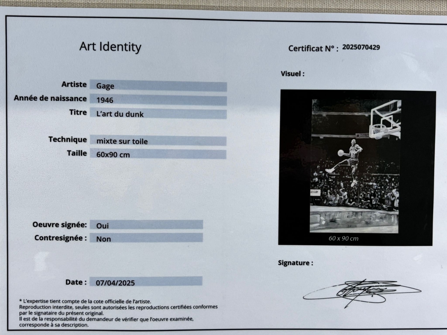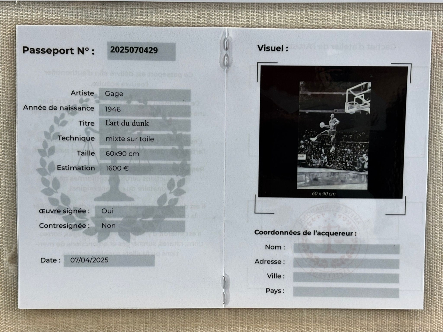 A black framed original oil painting by the artist Gage titled L'art du Dunk.