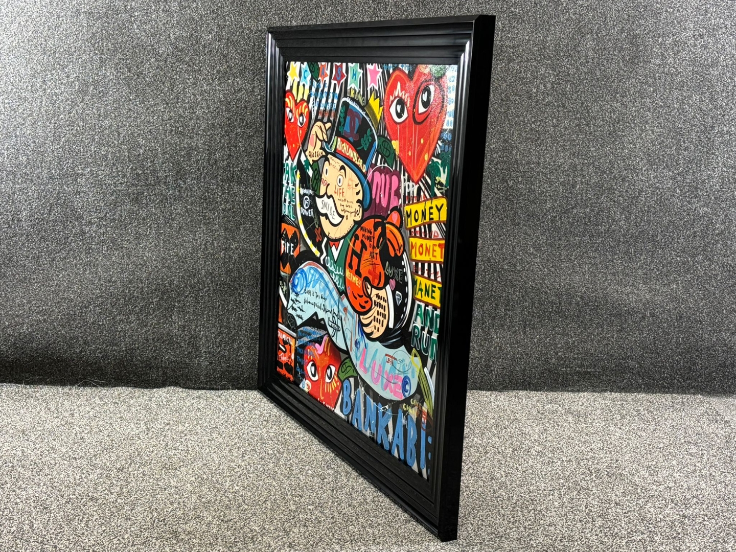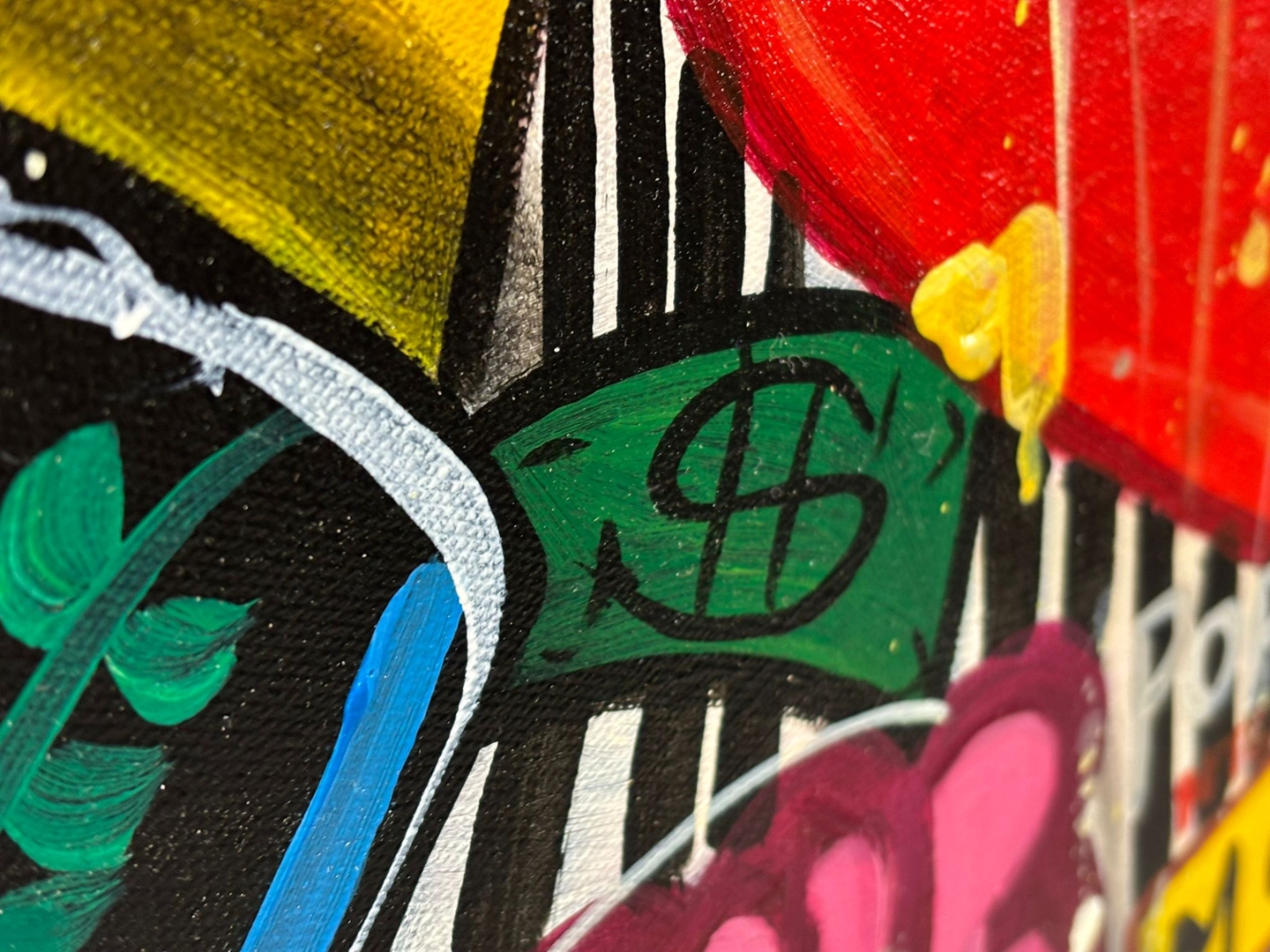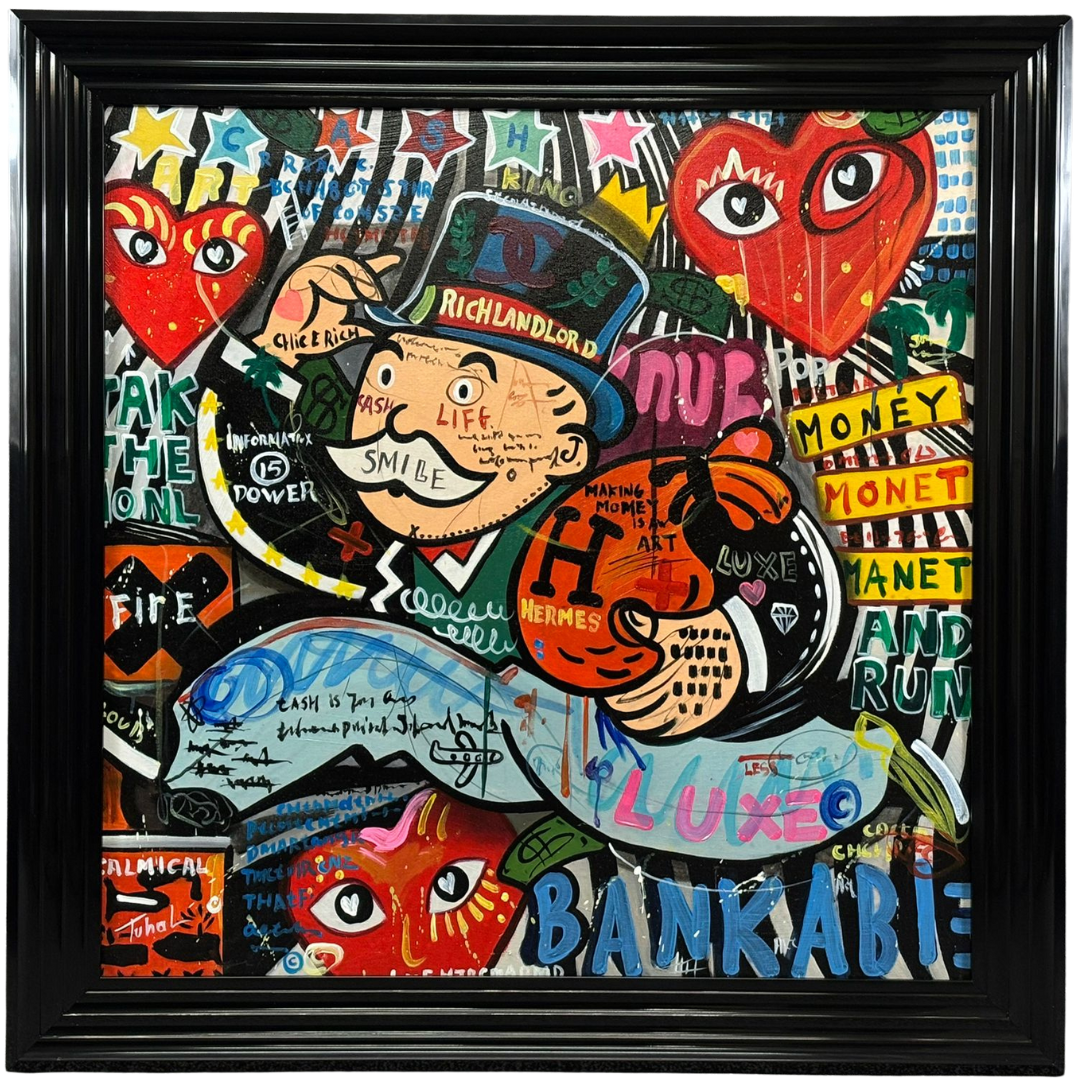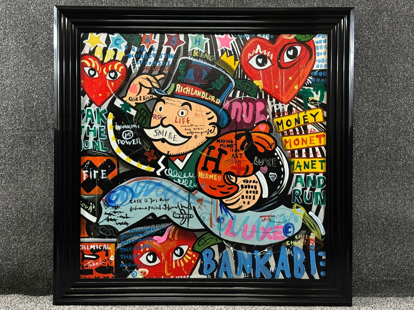 A black-framed original oil painting by the fearless contemporary artist Tuhal, Luxe et Graffiti is a vibrant explosion of pop culture, street art, and capitalist satire. Measuring 80cm x 80cm, this bold, graffiti-inspired work is bursting with colour, text, and iconic imagery—from the Monopoly man clutching a Hermes bag to heart motifs, brand names, and cryptic slogans like “Money Monet Manet” and “Making Money is Art.”
