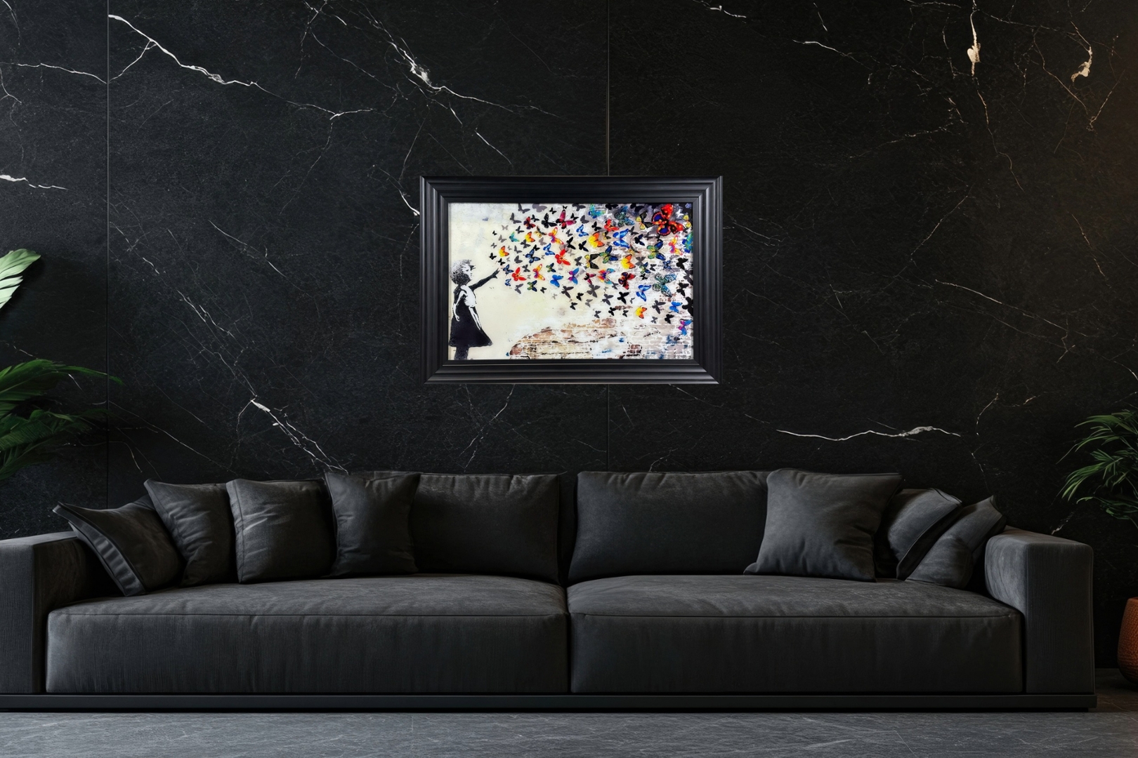A brand new black-framed liquid art picture, inspired by Banksy's iconic style—featuring the beloved Girl with a Balloon motif reimagined as a girl releasing a flurry of vibrant butterflies. Measuring 72cm in height and 102cm in width, this stunning piece merges monochrome stencil art with a burst of colourful energy, as multicoloured butterflies soar across a textured backdrop resembling a weathered brick wall.