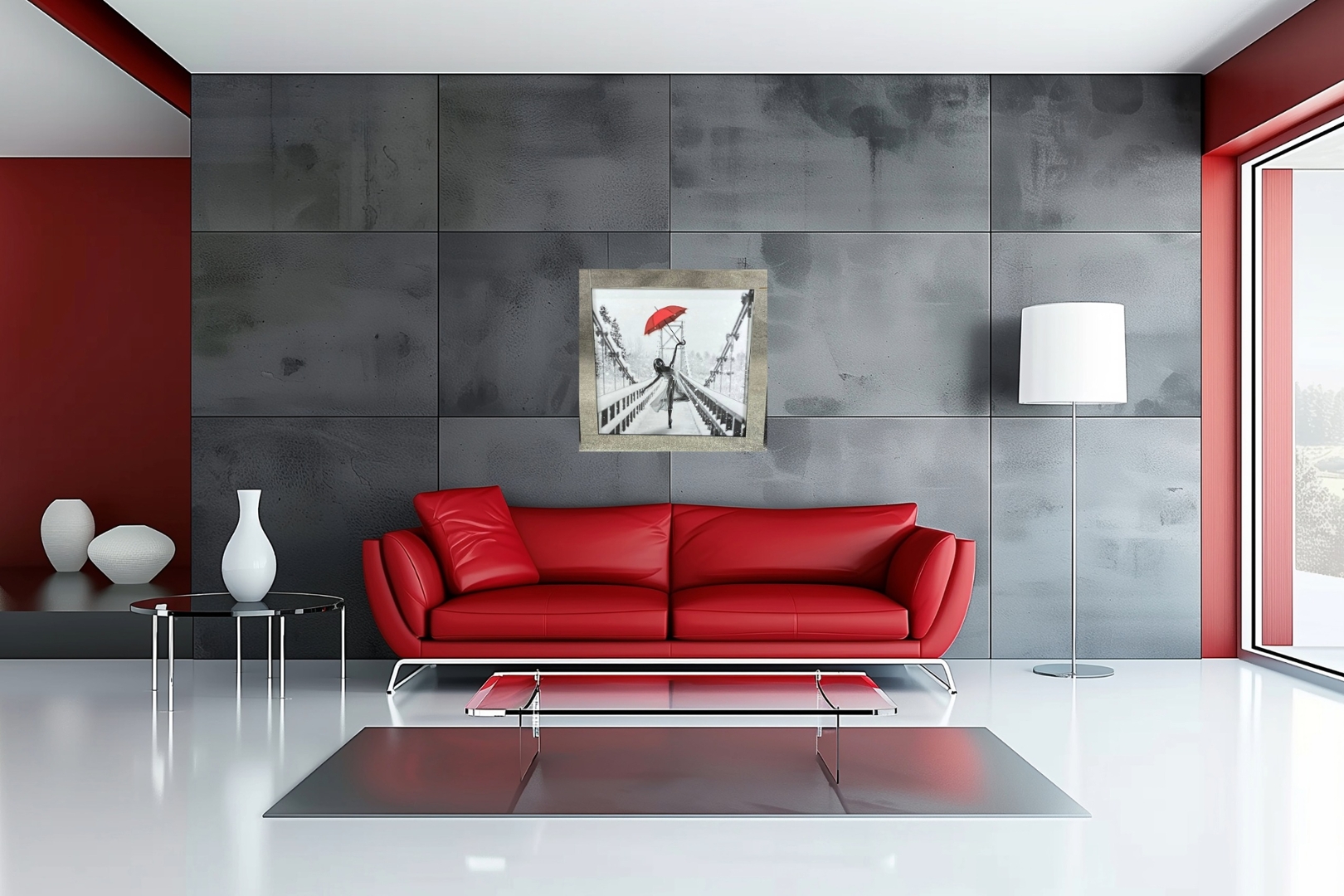 The liquid art technique infuses dynamic movement into the scene, bringing the girl and her vibrant red umbrella to life against the backdrop of a picturesque bridge. Encased within a sleek mirror frame, this piece adds a touch of elegance to any room.