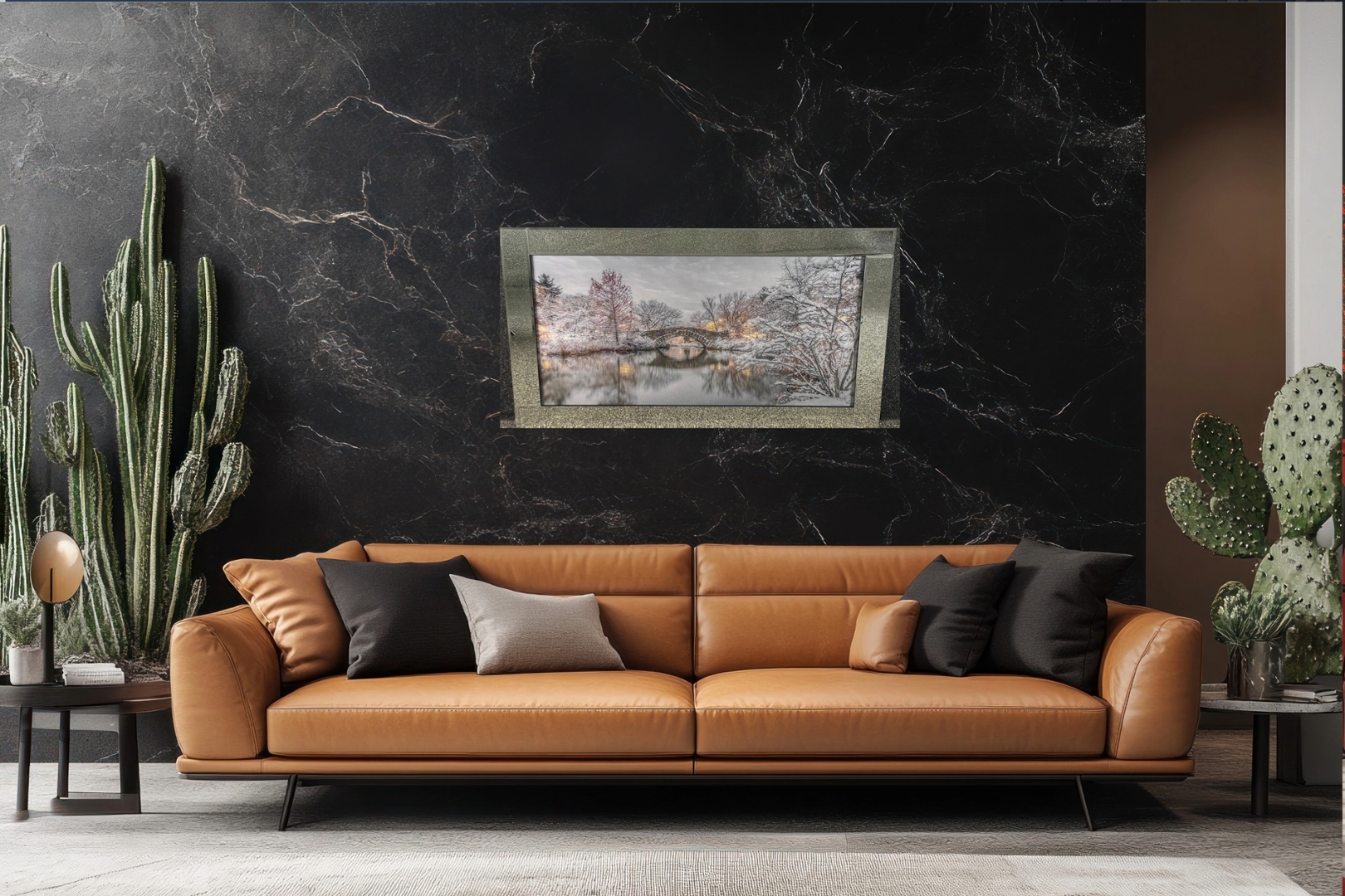 A bevelled edge mirror-framed liquid art picture showcasing a serene Winter Bridge Scene. Measuring 26 inches in height and 46 inches in width, this artwork captures the tranquil beauty of a snow-covered bridge enveloped in a hushed winter landscape.