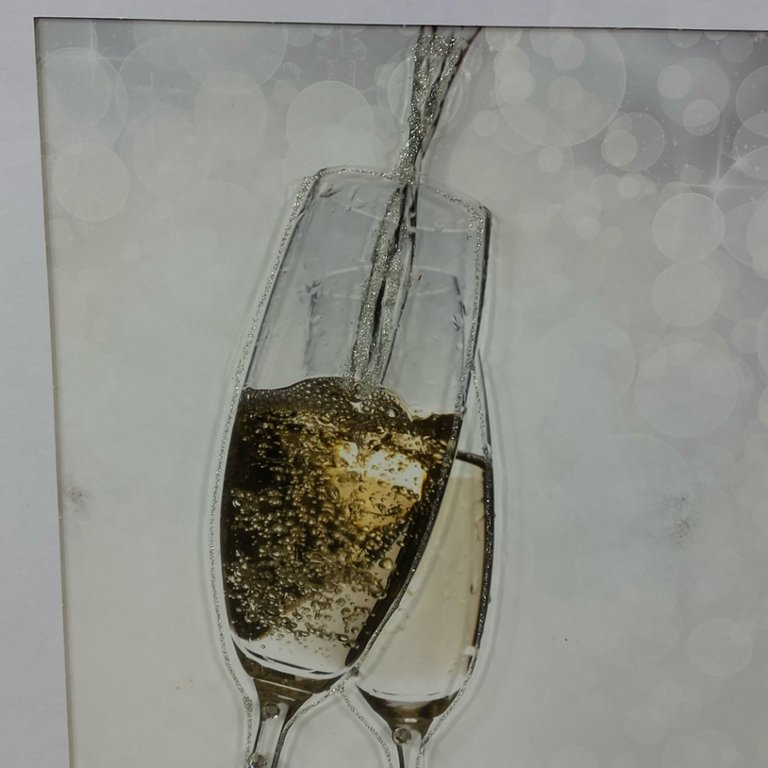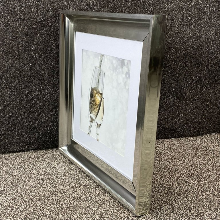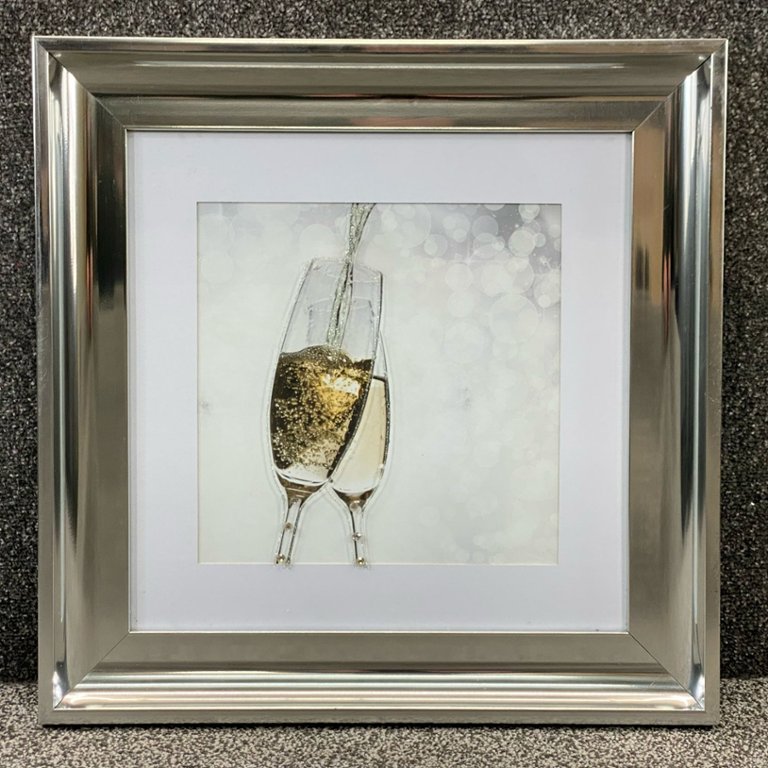 A chrome-framed liquid art picture of Champagne Flutes. Approximately 21" height, 21" width.