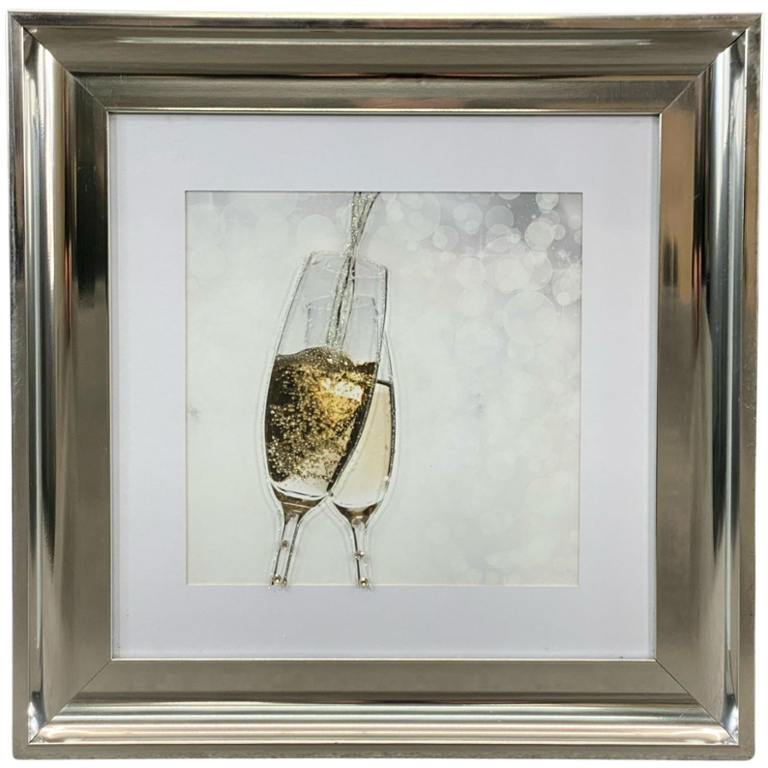 Elevate your decor with the timeless allure of champagne and the artistic brilliance of liquid art. Perfect for adding a touch of glamour to any setting, our chrome-framed picture of champagne flutes is sure to dazzle and delight guests while serving as a stunning focal point in your home. Cheers to beauty, elegance, and the joy of shared moments.