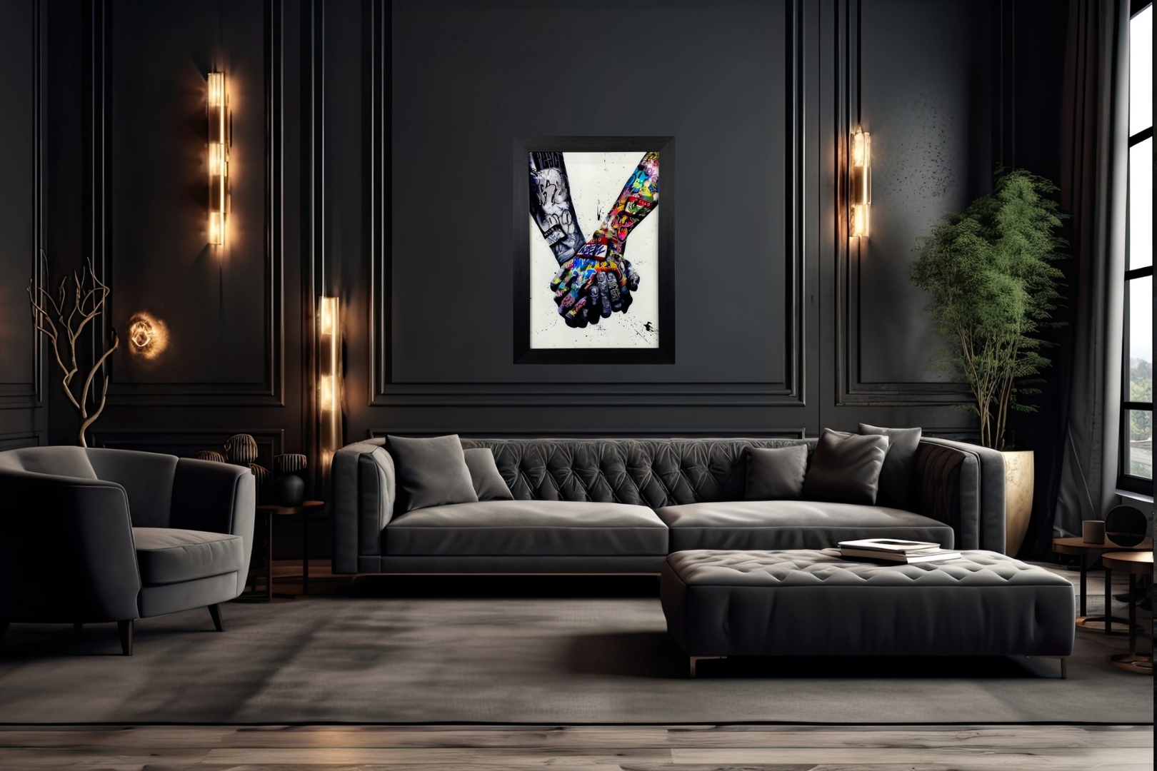 A brand new black framed liquid art picture that bursts with colour and attitude, this electrifying piece showcases two clasped hands covered in vibrant graffiti-style artwork. Every inch is packed with bold lettering, neon splashes, urban textures, and energetic street-art motifs, creating a dynamic visual celebration of unity, peace, and modern culture. The liquid art finish amplifies the depth and shine, giving the colours a striking, almost wet-look intensity that brings the entire image to life.