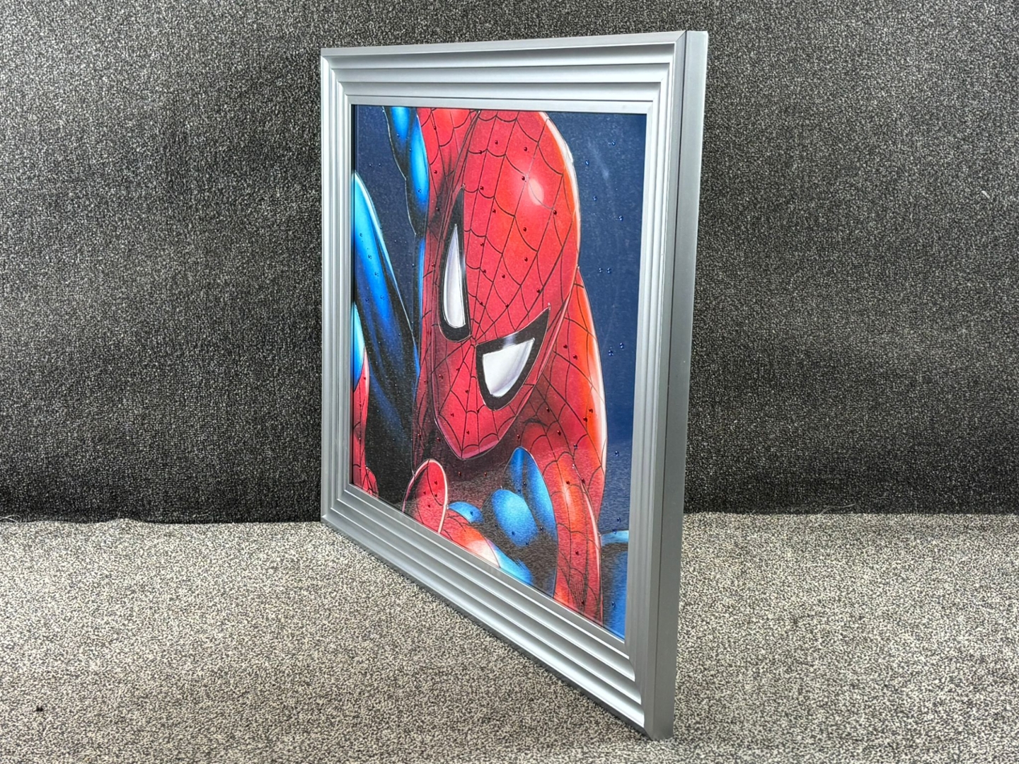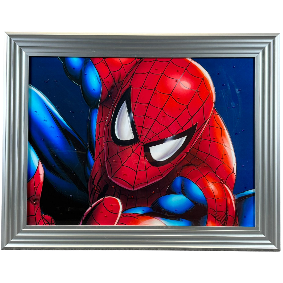 A silver framed liquid art picture of Spiderman.