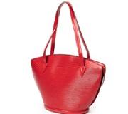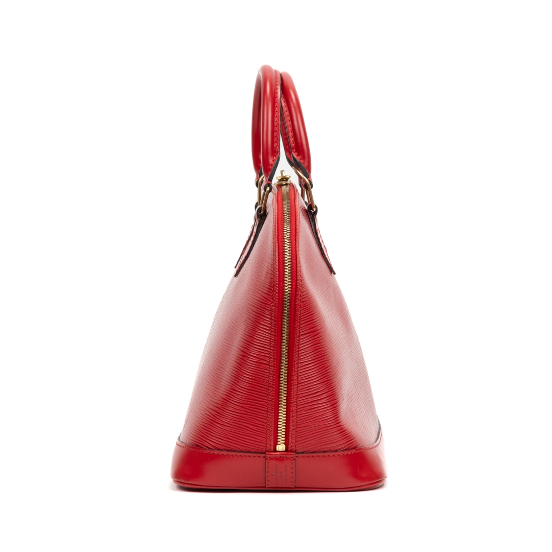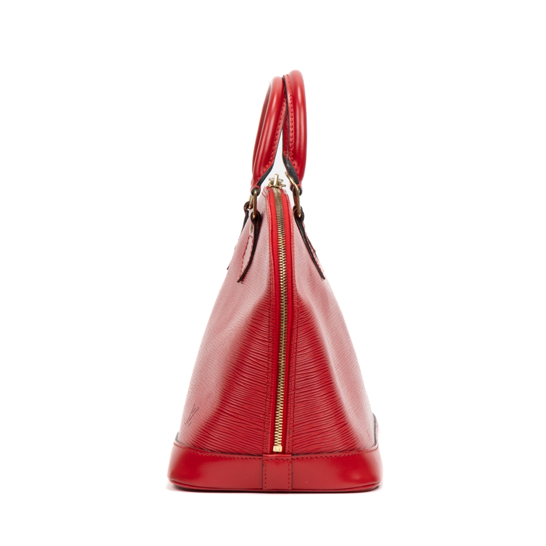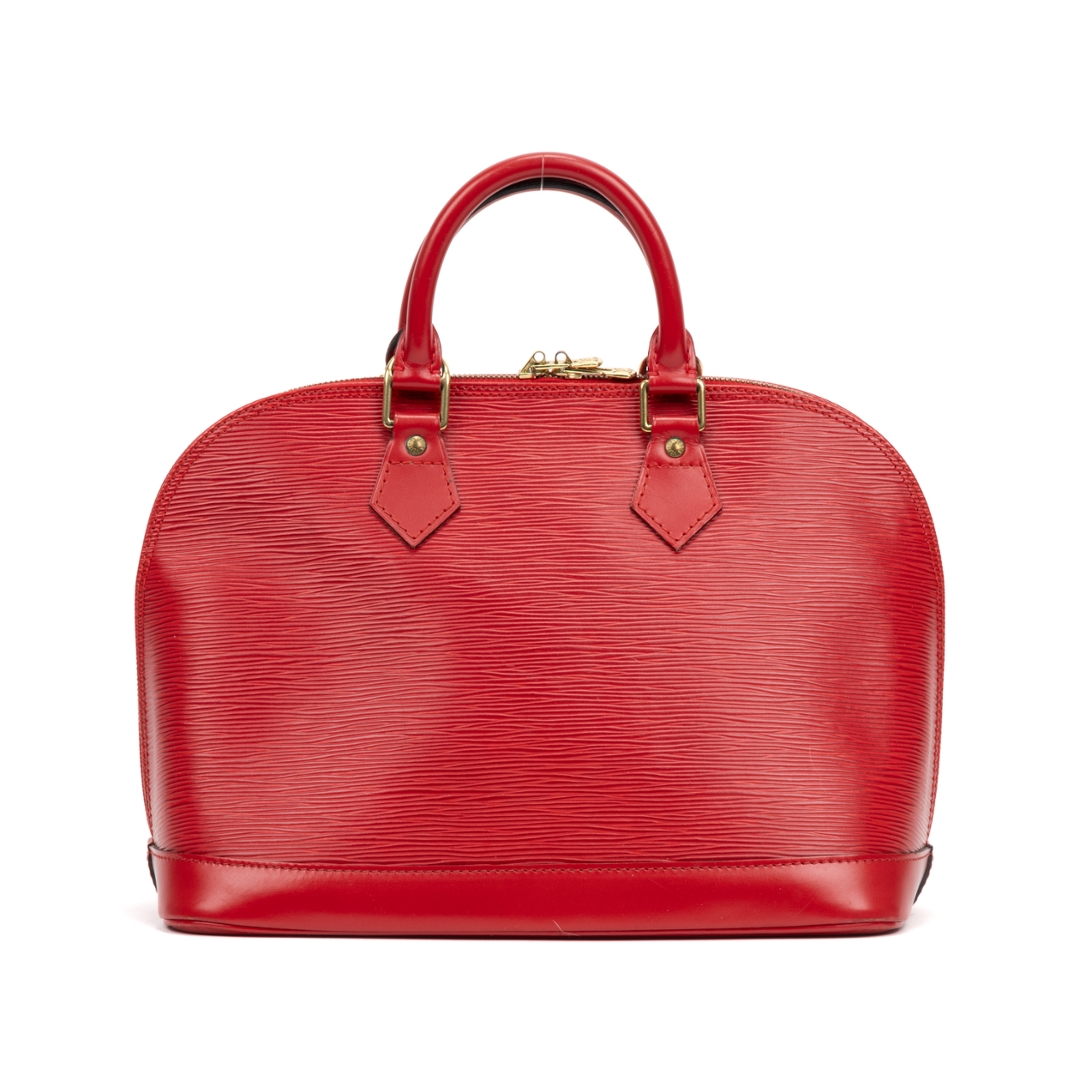 A vintage Louis Vuitton red calf leather Alma bag with a certificate of authenticity. Approximately 23cm height, 30cm width.