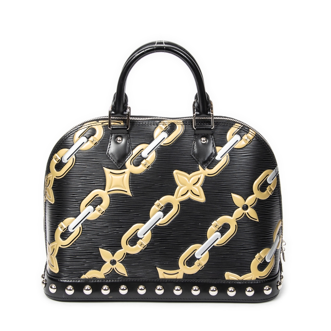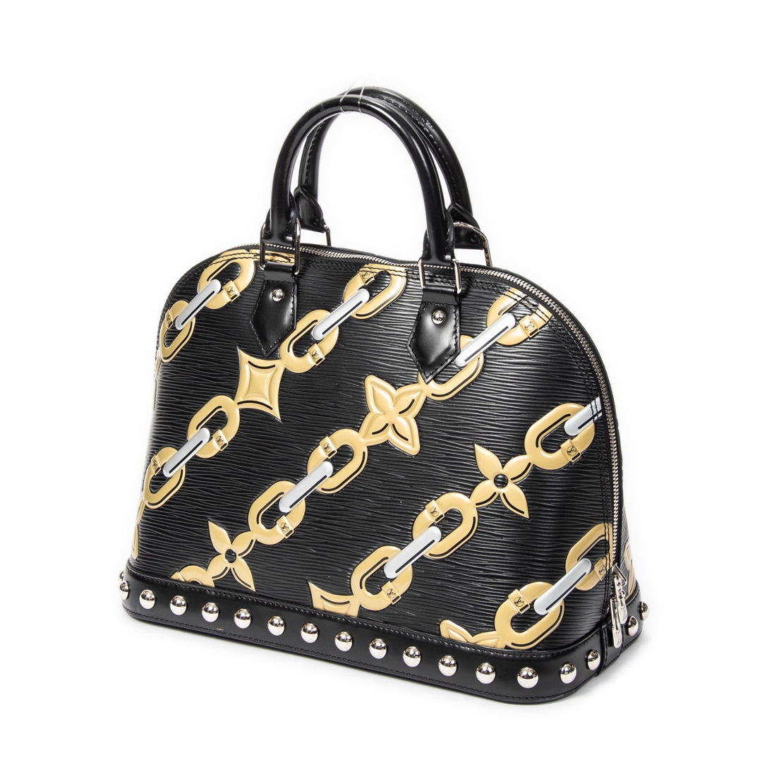 A vintage Louis Vuitton Alma bag crafted in striking black calf leather, elevated with bold gold-tone chain motif detailing that delivers a distinctive and contemporary interpretation of the house’s classic design. The textured leather exterior is complemented by structured top handles, silver-tone hardware accents, and stud detailing along the base, creating a confident and eye-catching statement piece.