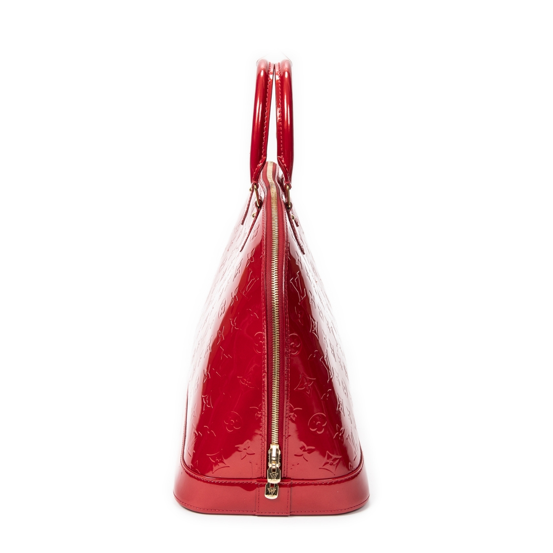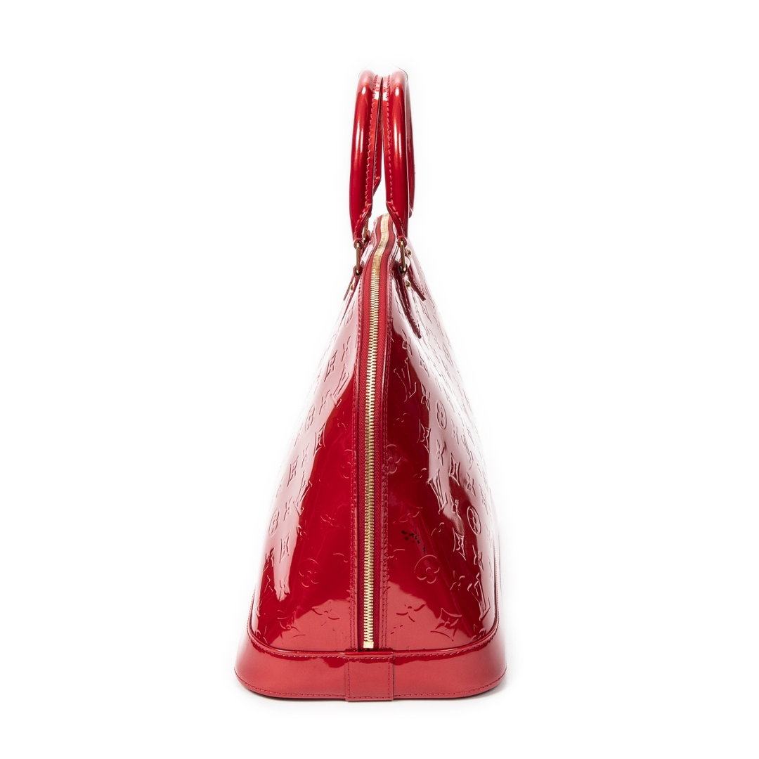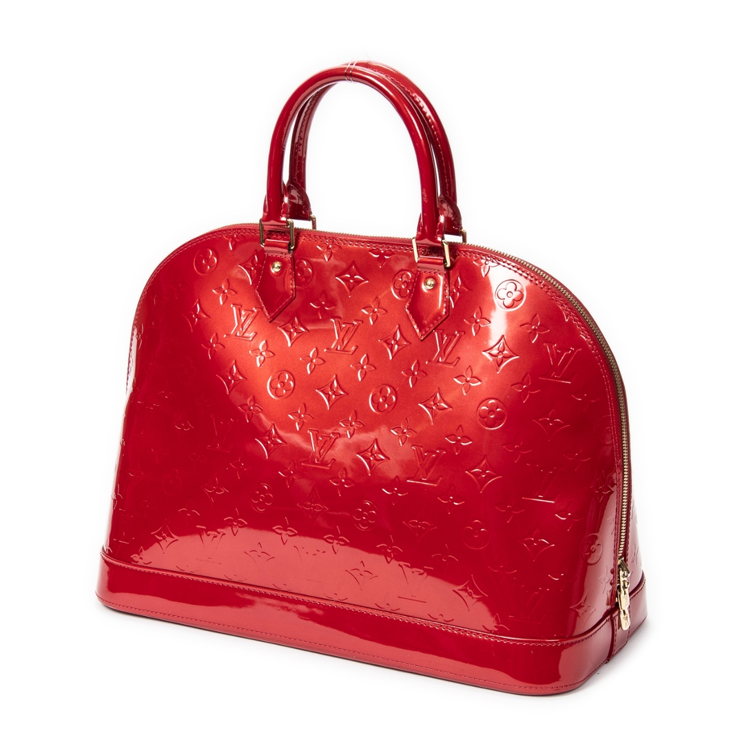 A vintage Louis Vuitton red calf leather Alma bag with a certificate of authenticity. Approximately 29cm height, 38cm width.