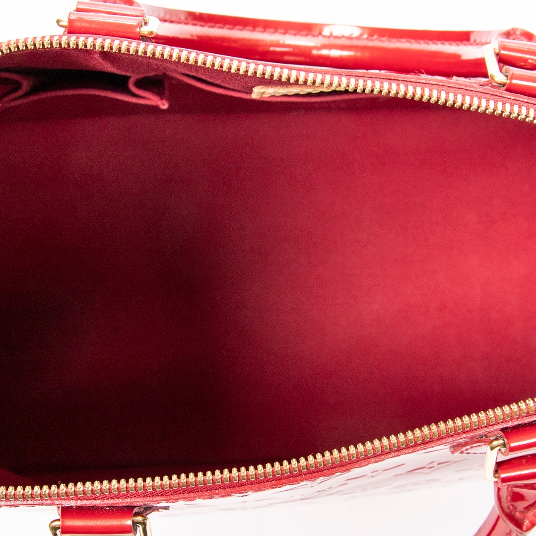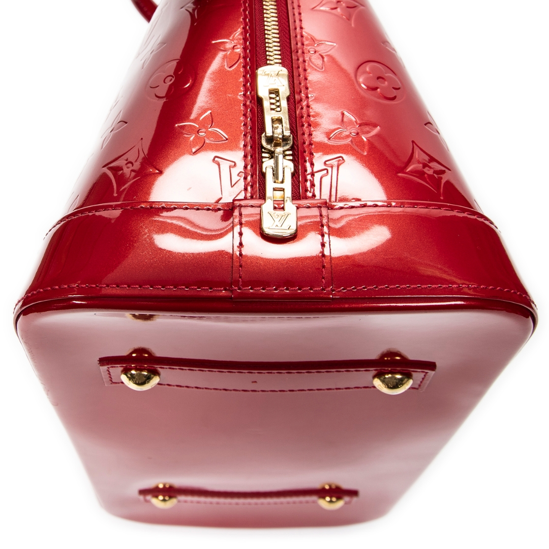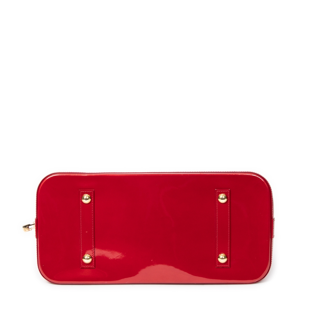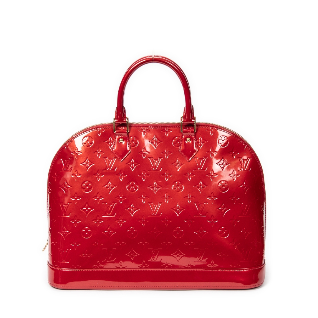 A vintage Louis Vuitton red calf leather Alma bag with a certificate of authenticity. Approximately 29cm height, 38cm width.