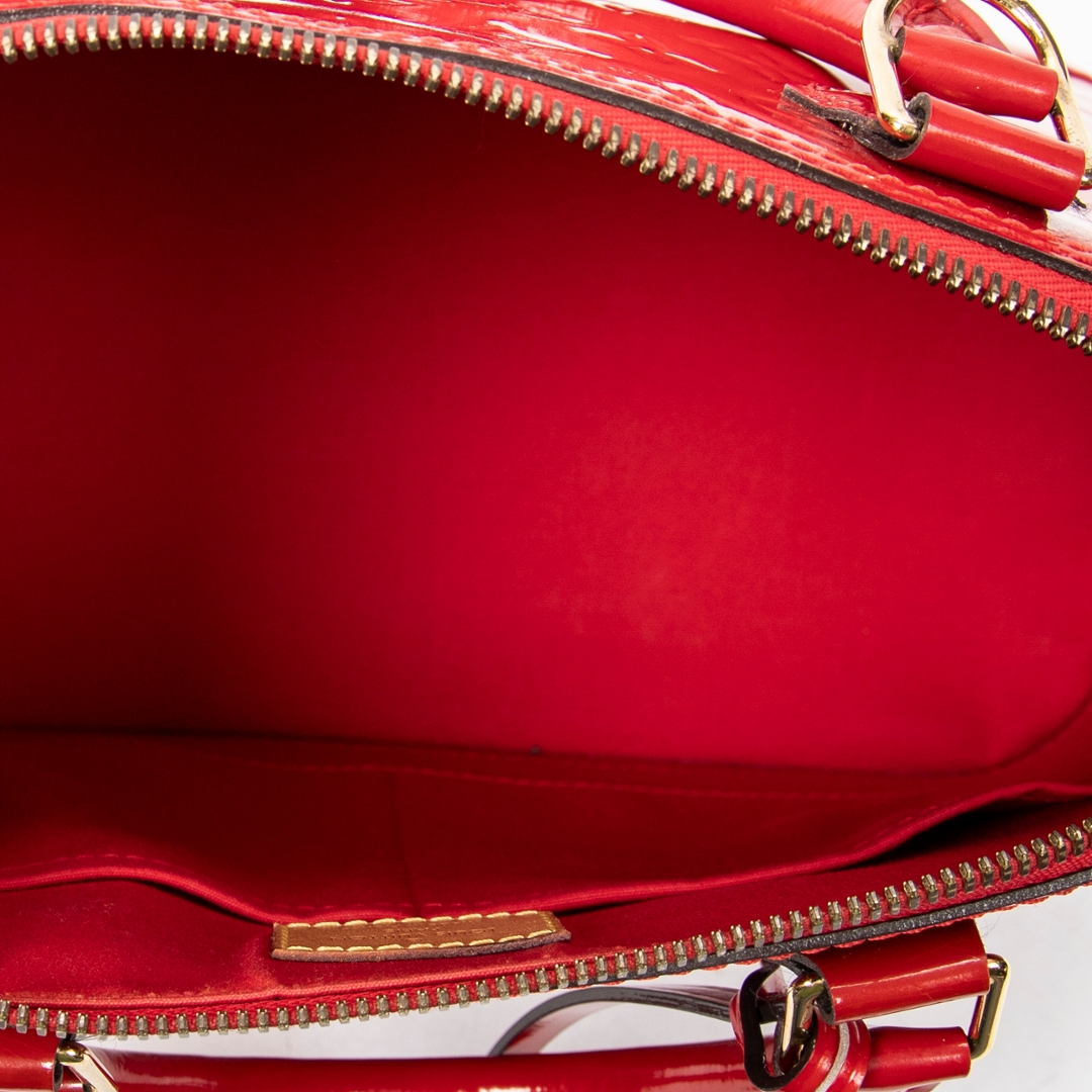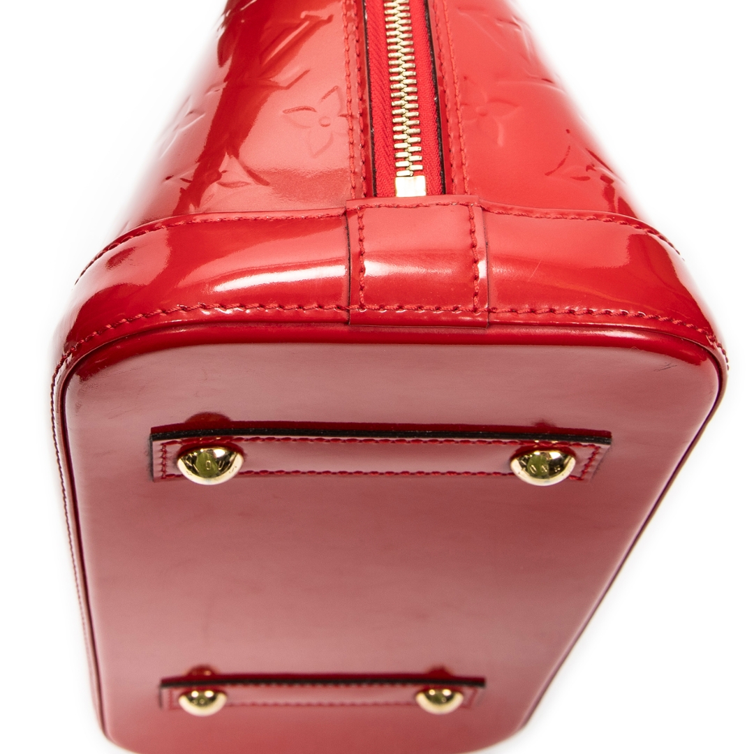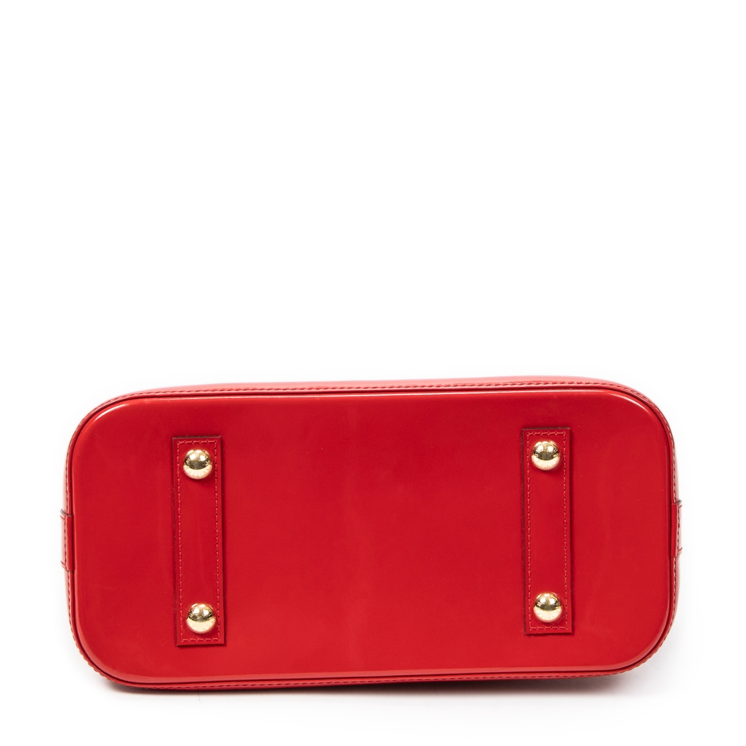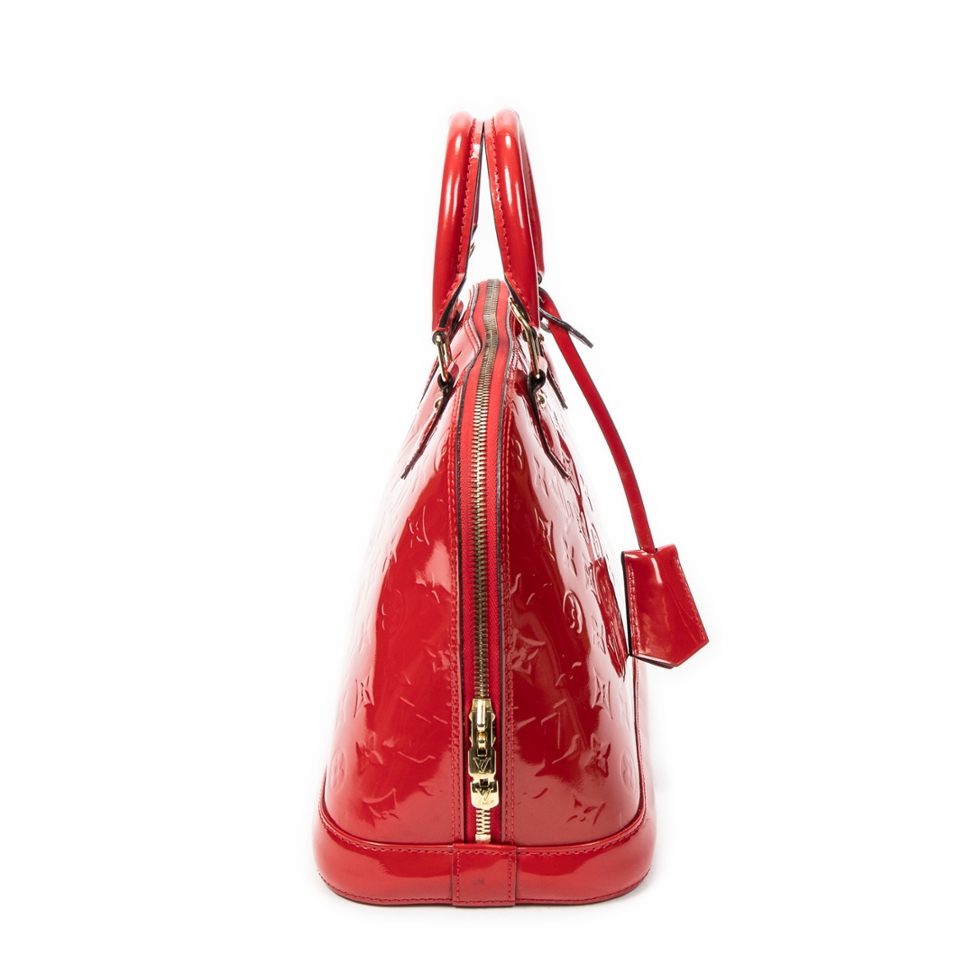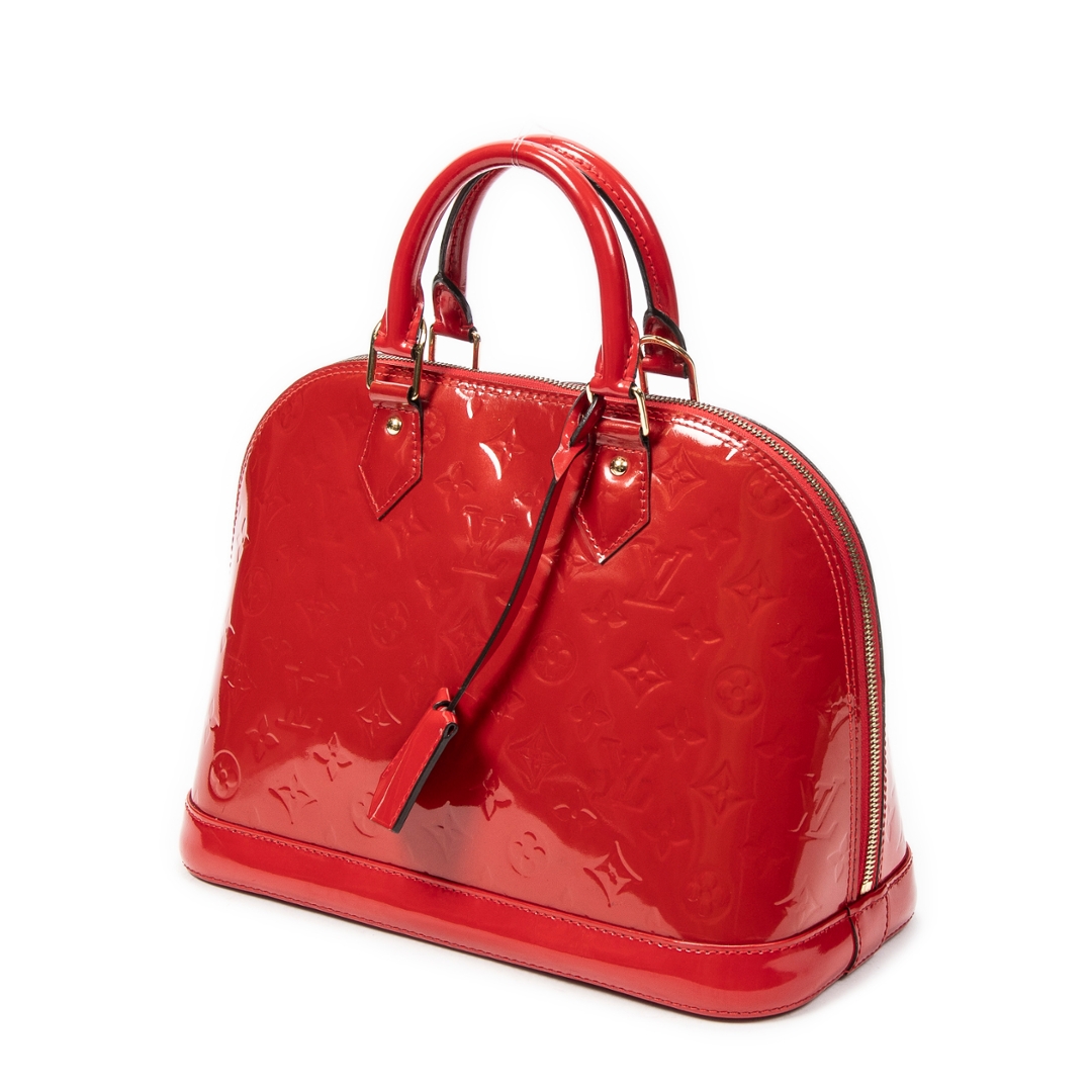 A vintage Louis Vuitton Alma bag crafted in striking Cerise calf leather, offering a bold and luxurious take on the house’s iconic structured silhouette. The vibrant red tone is enhanced by a high-gloss finish and subtle embossed Monogram detailing, complemented by dual rolled top handles, gold-tone hardware, and a secure double zip closure. Measuring approximately 23cm in height and 30cm in width, it provides a well-balanced and versatile size suited to everyday use.