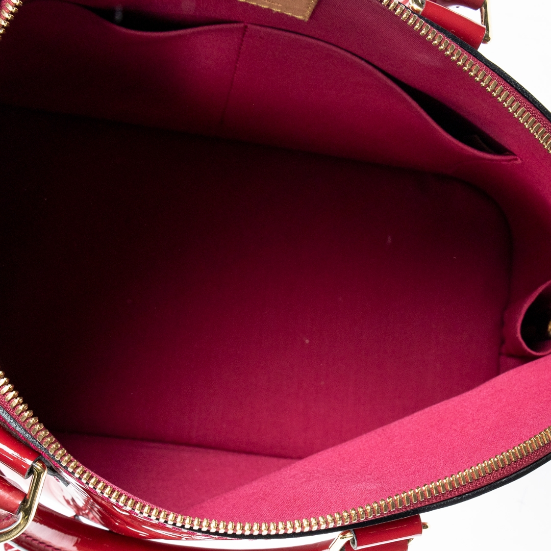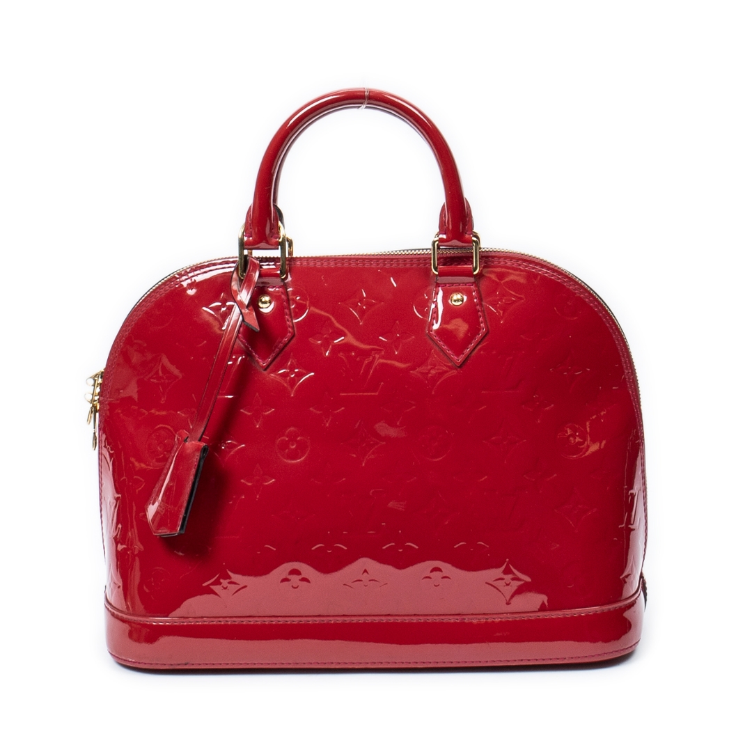 A vintage Louis Vuitton Alma bag crafted in striking Indian Rose Vernis calf leather, featuring a high-gloss finish embossed with the iconic monogram pattern. This elegant and feminine colourway enhances the classic domed silhouette, while gold-tone hardware and smooth leather detailing complete the refined, statement look.
