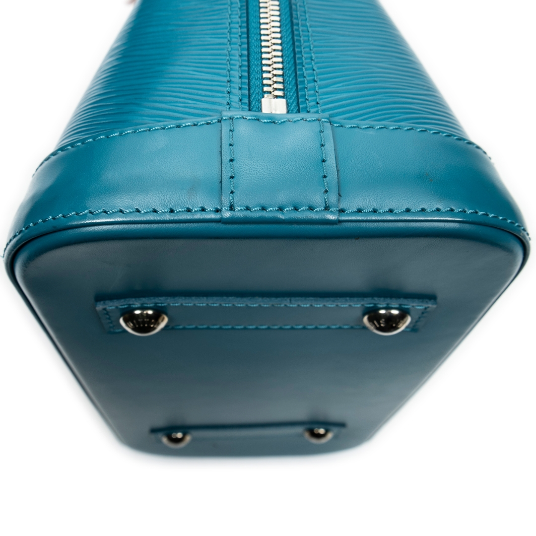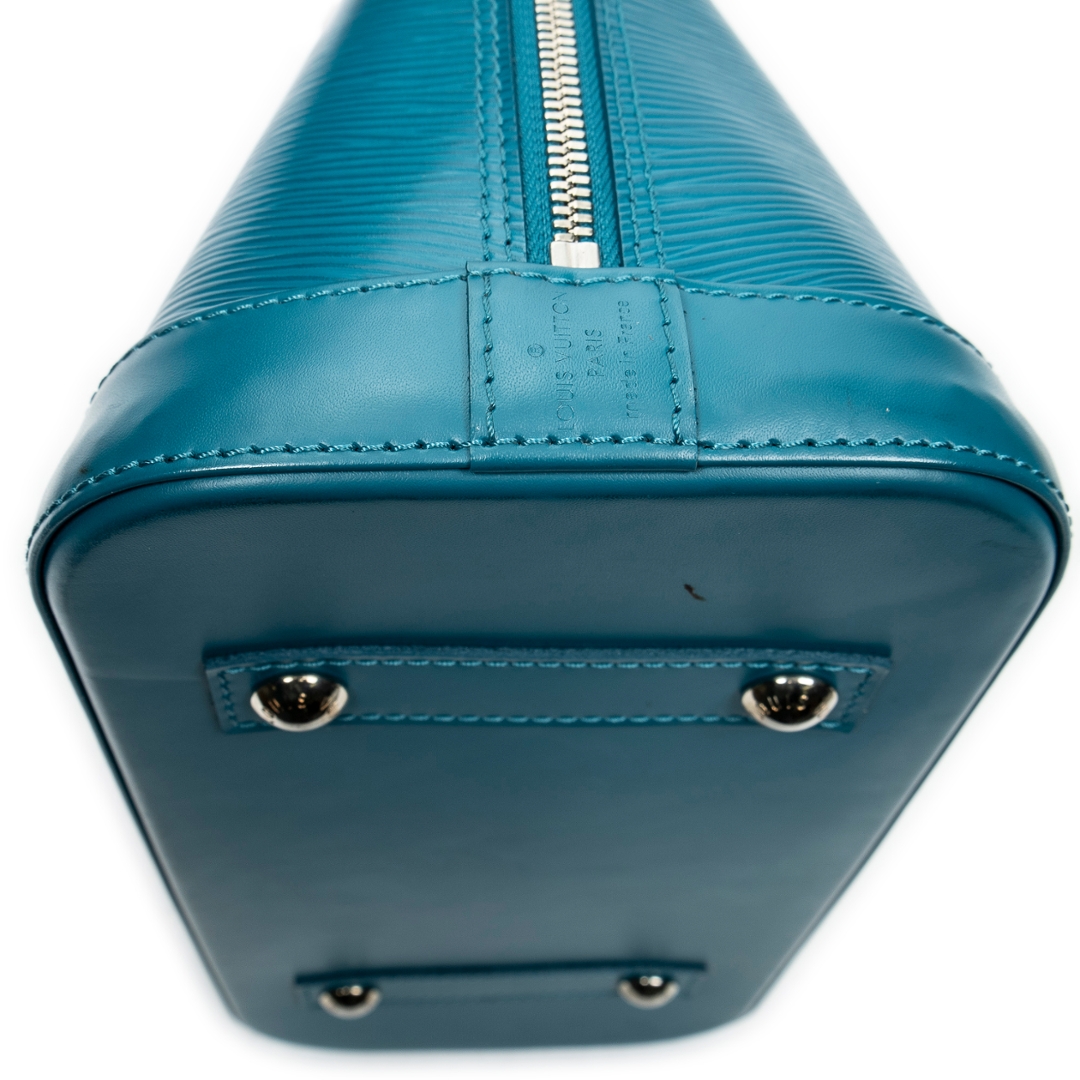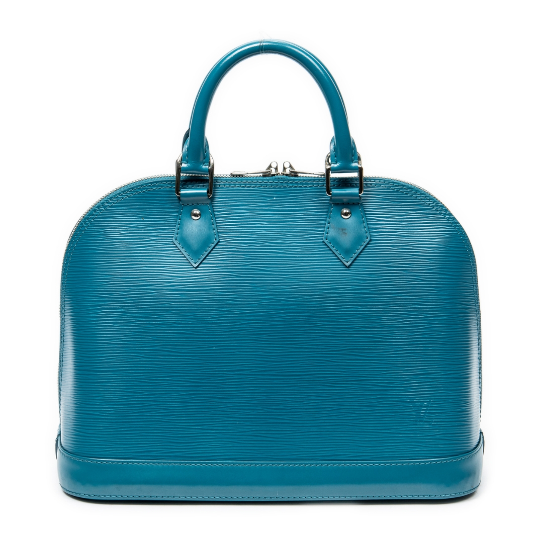 A vintage Louis Vuitton Alma bag crafted in striking turquoise calf leather, offering a bold and contemporary interpretation of the house’s iconic structured silhouette. The elegant dome-shaped design is enhanced by the distinctive textured finish, complemented by dual rolled top handles, silver-tone hardware, and a secure double zip closure. Measuring approximately 23cm in height and 30cm in width, it provides a well-balanced size suited to everyday use.