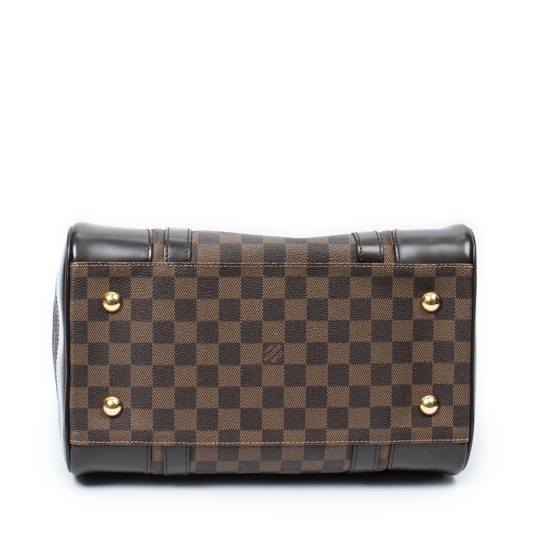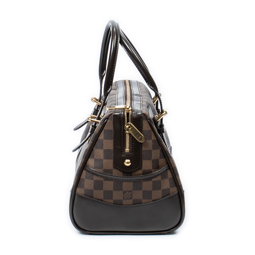 A vintage Louis Vuitton Berkeley bag crafted in the signature brown coated canvas with the iconic Damier Ebene pattern, elevated by smooth dark leather trim and gold-tone hardware. The structured silhouette is defined by its elegant top handles and distinctive front plaque, creating a refined and instantly recognisable Louis Vuitton aesthetic.