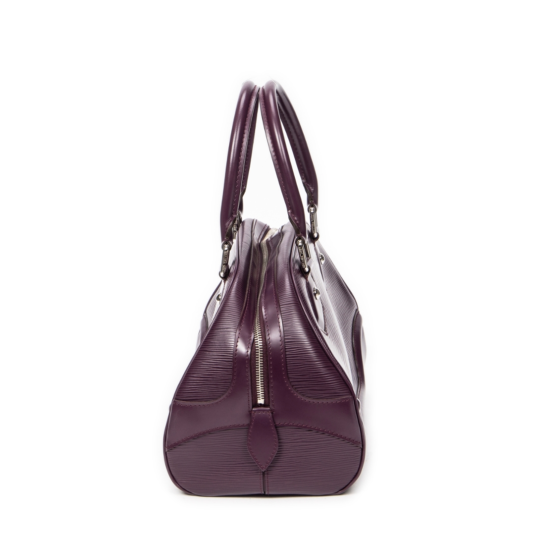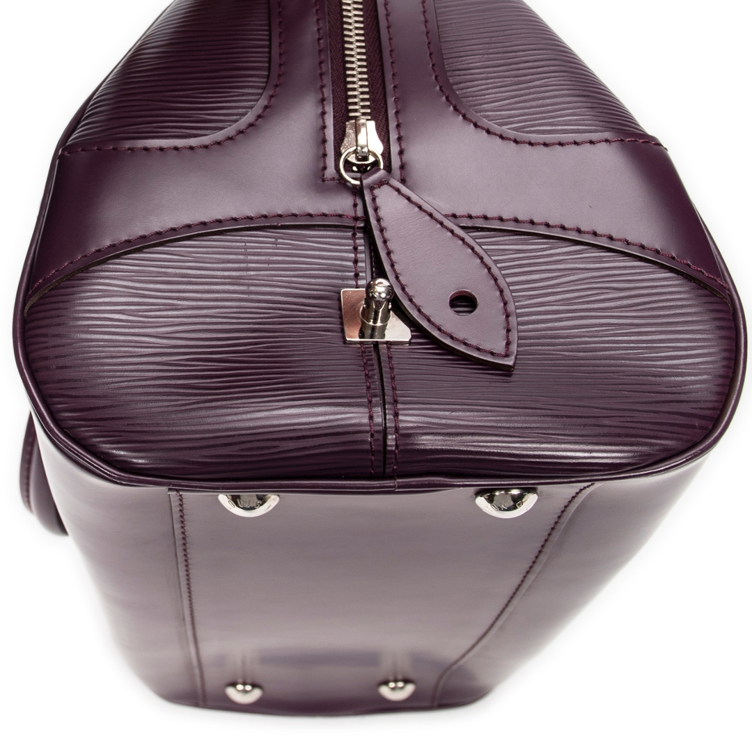 A vintage Louis Vuitton purple magenta calf leather Bowling Montaigne bag with a certificate of authenticity. Approximately 20cm height, 32cm width.