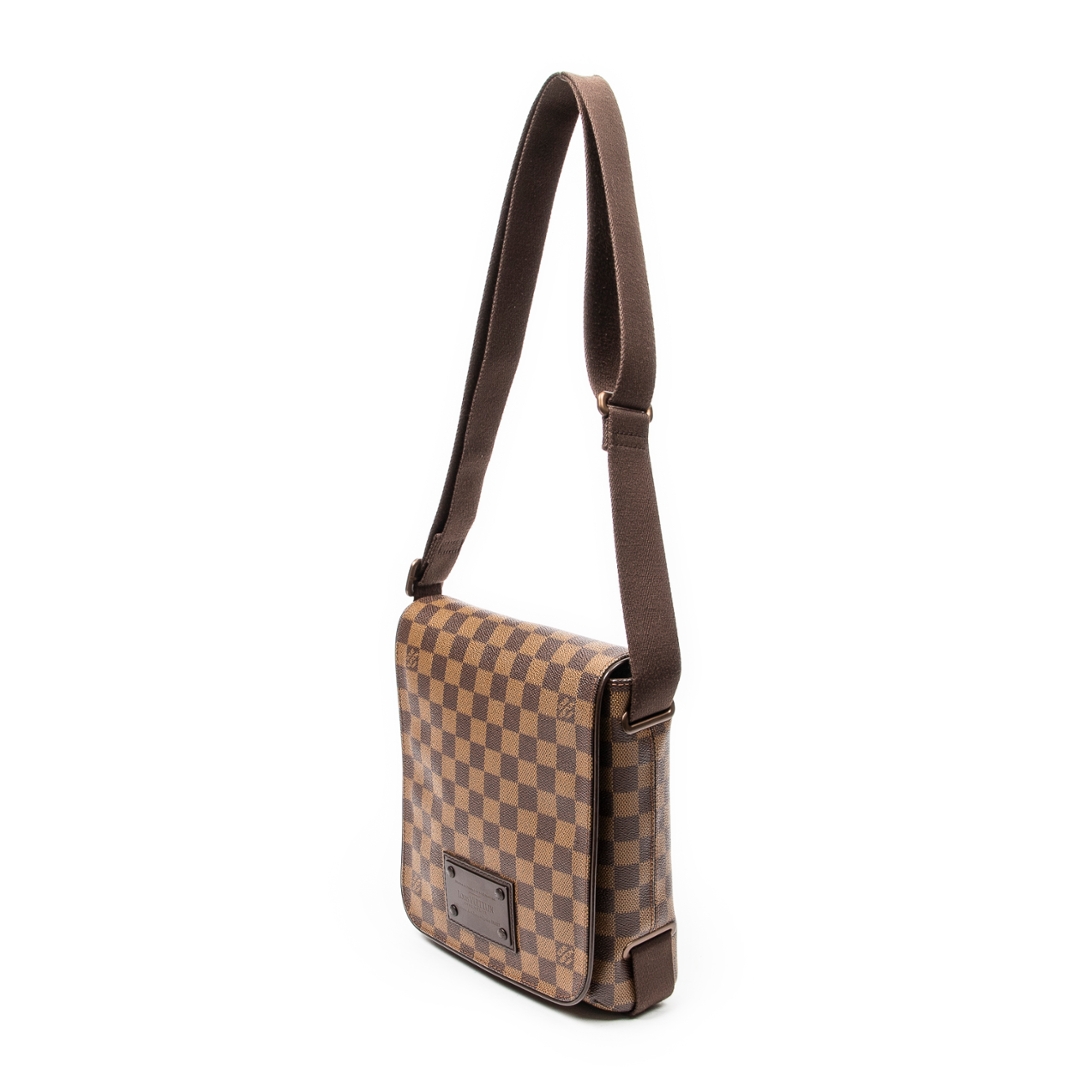 A vintage Louis Vuitton Brooklyn bag crafted in the signature brown coated canvas with the iconic Damier Ebene pattern, finished with coordinating dark leather trim and understated hardware. The structured, compact silhouette is complemented by a front flap design and subtle Louis Vuitton plaque, delivering a refined yet practical everyday style.