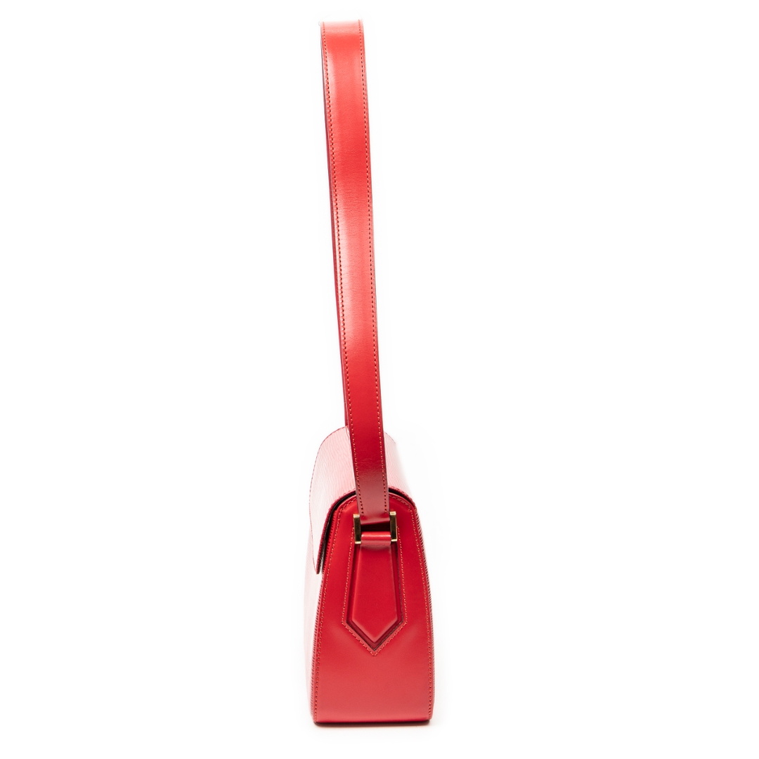 A vintage Louis Vuitton Buci bag crafted in striking red calf leather, featuring the signature textured finish that adds depth and a refined tactile quality. The compact, structured silhouette is complemented by smooth leather side panels and subtle gold-tone hardware, creating a bold yet elegant statement piece within the Louis Vuitton collection.