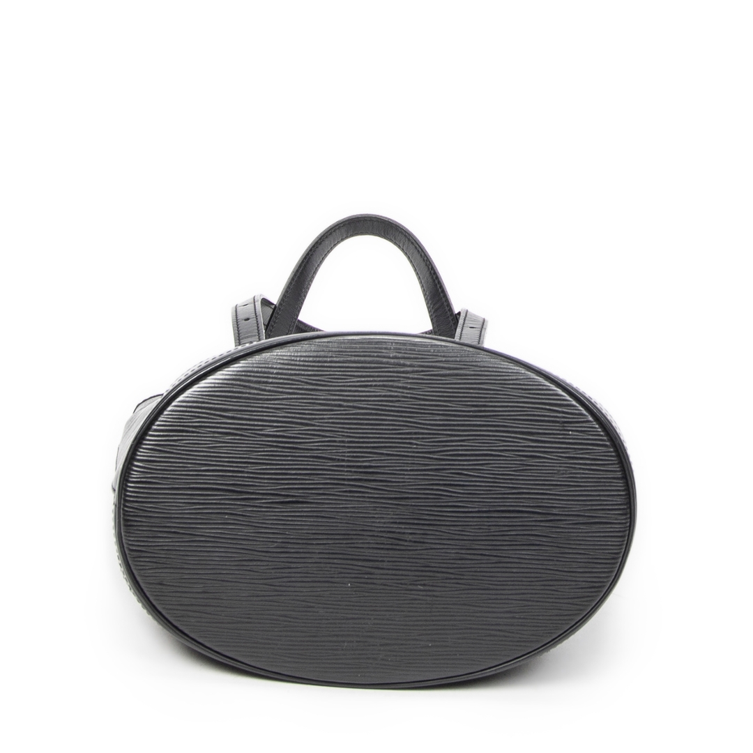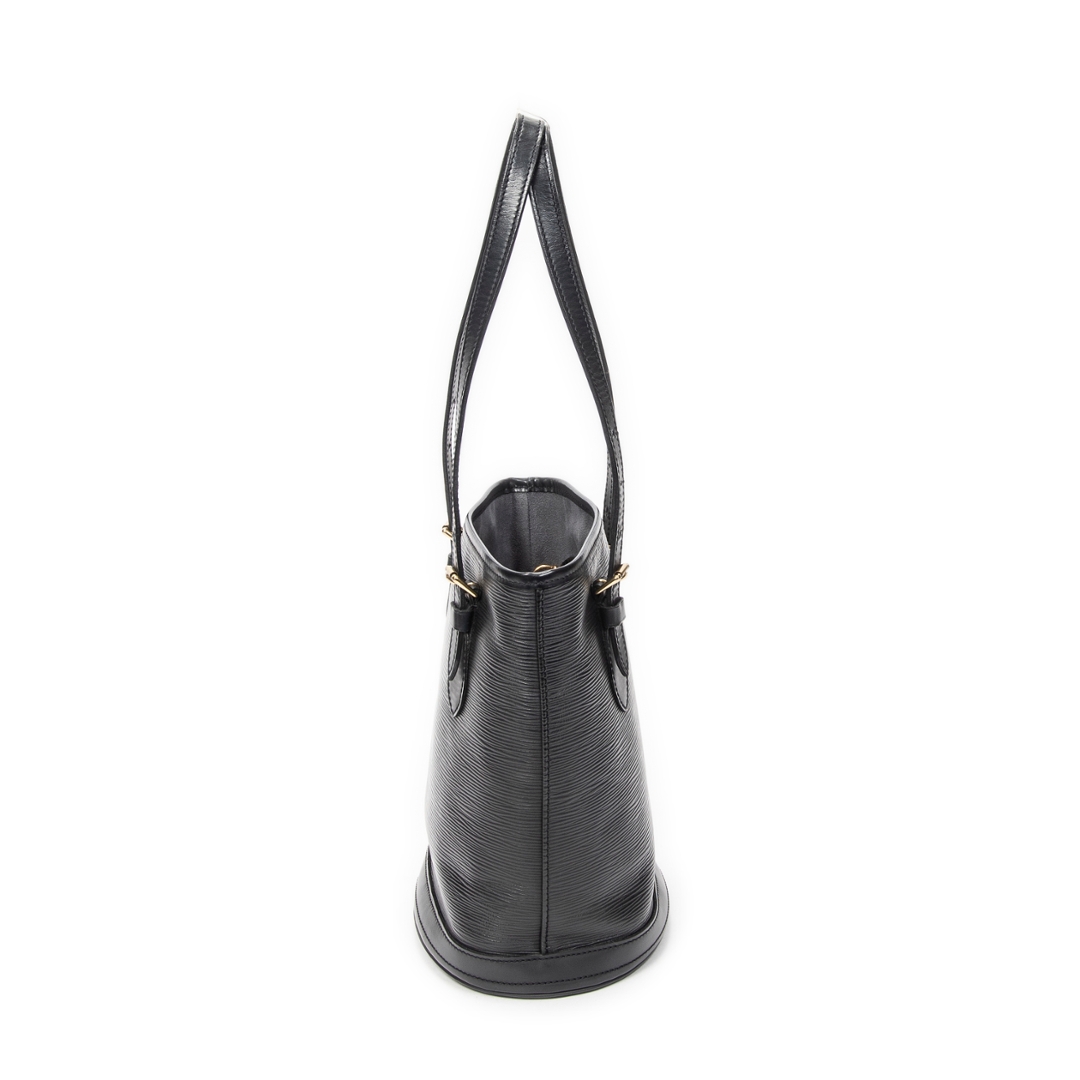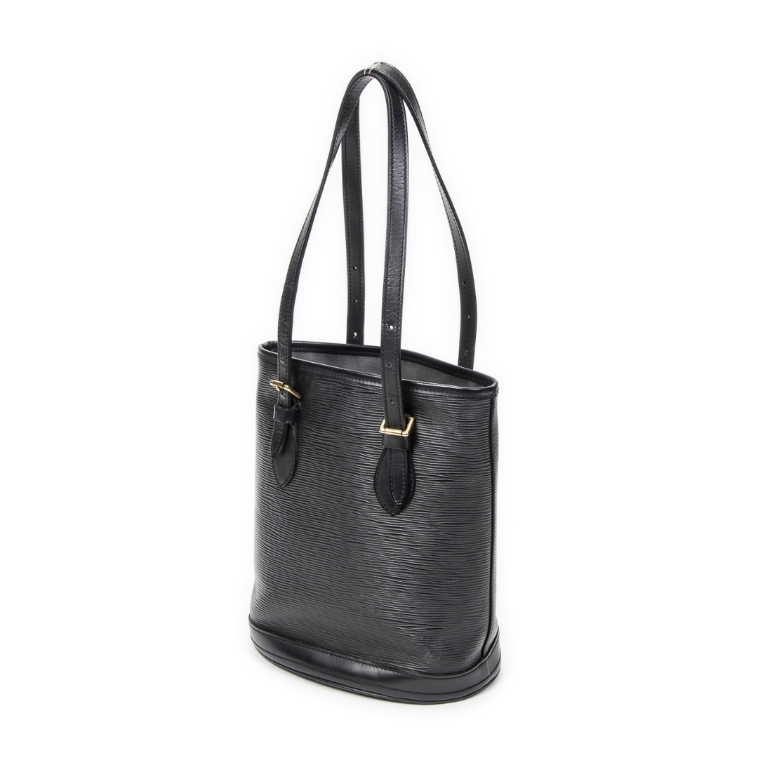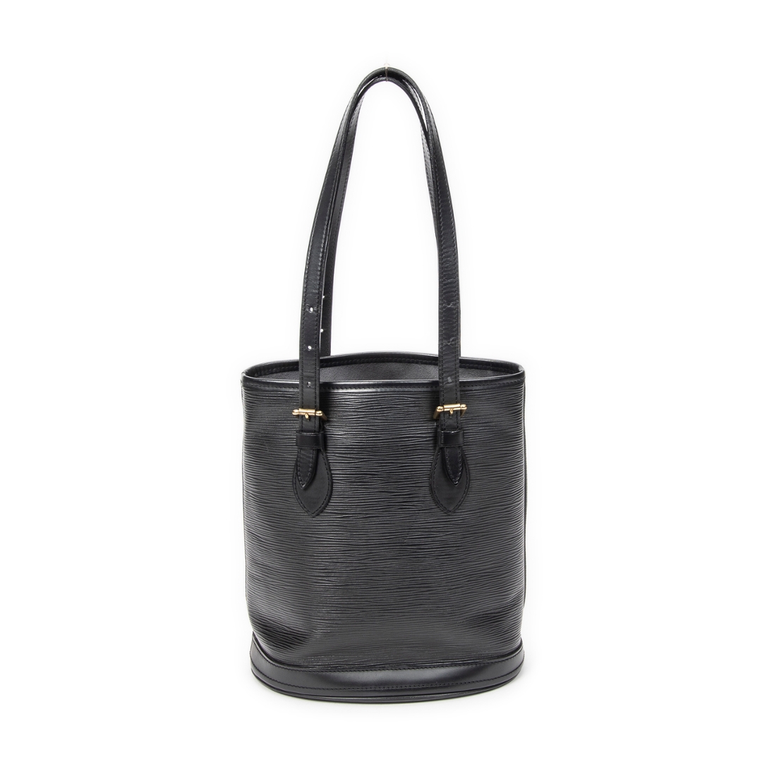A vintage Louis Vuitton Black Calf Leather Bucket bag with a certificate of authenticity. Approximately 26cm height, 23cm width.