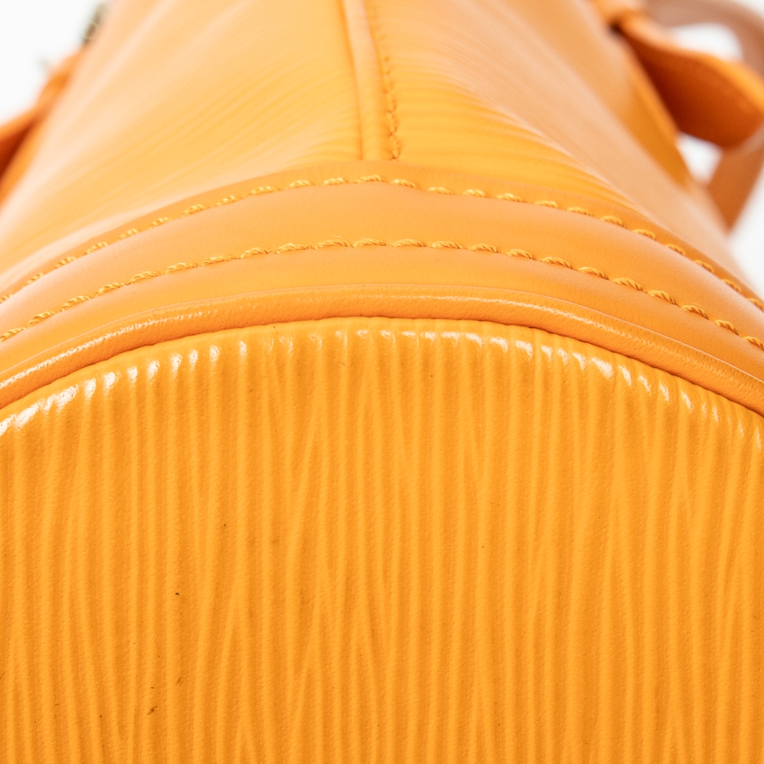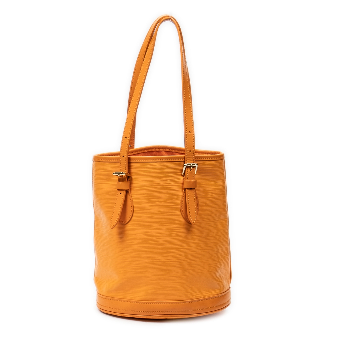 A vintage Louis Vuitton Mandarin Orange Calf Leather Bucket bag with a certificate of authenticity. Approximately 25cm height, 23cm width.
