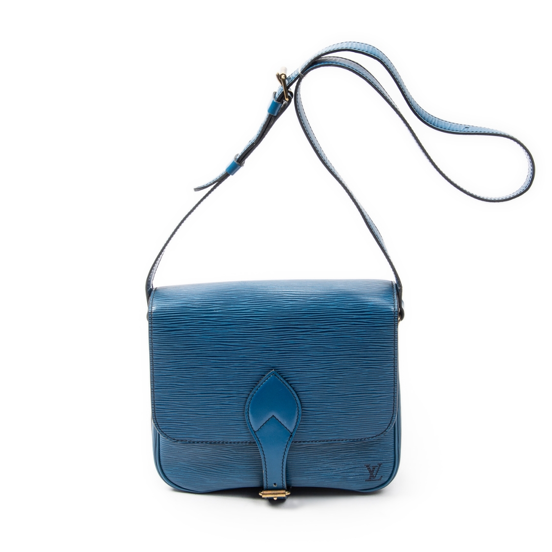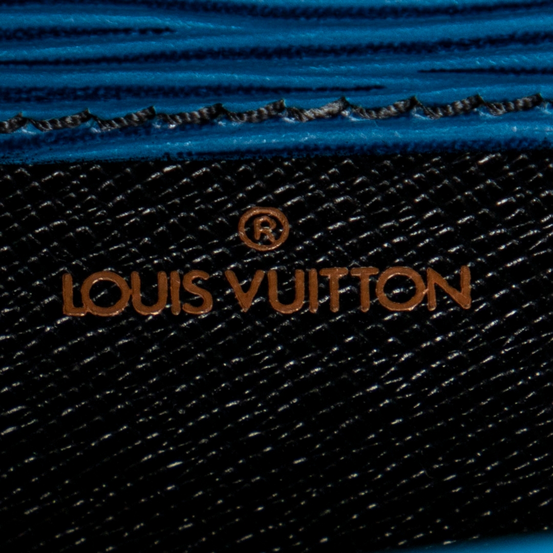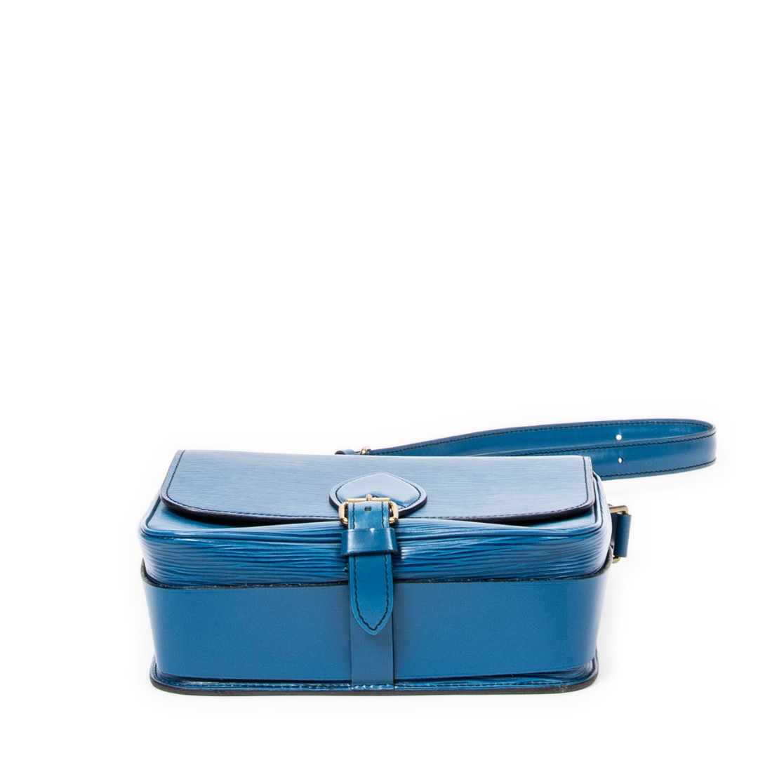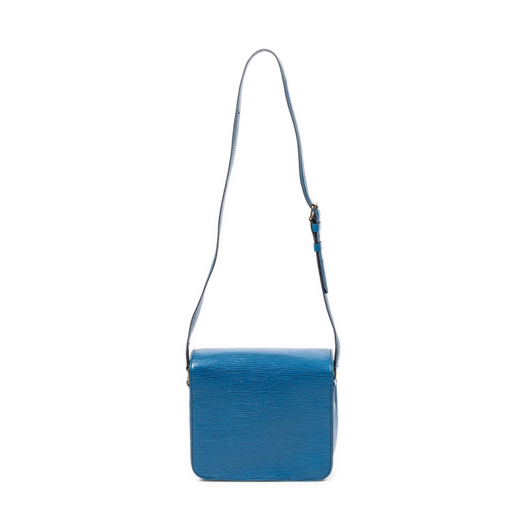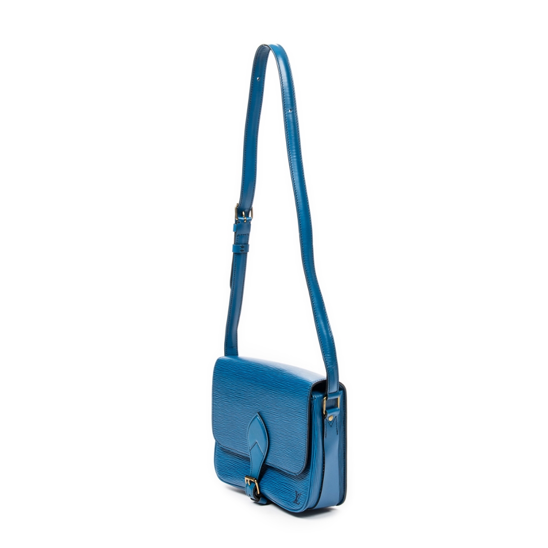A vintage Louis Vuitton Cartouchière bag crafted in striking blue calf leather, offering a compact and structured silhouette with a distinctive refined edge. The design features a front flap with a buckle fastening, accented by contrasting black stitching that highlights its clean lines and craftsmanship. An adjustable shoulder strap and gold-tone hardware complete the piece, while its dimensions of approximately 20cm in height and 22cm in width make it ideal for carrying everyday essentials.