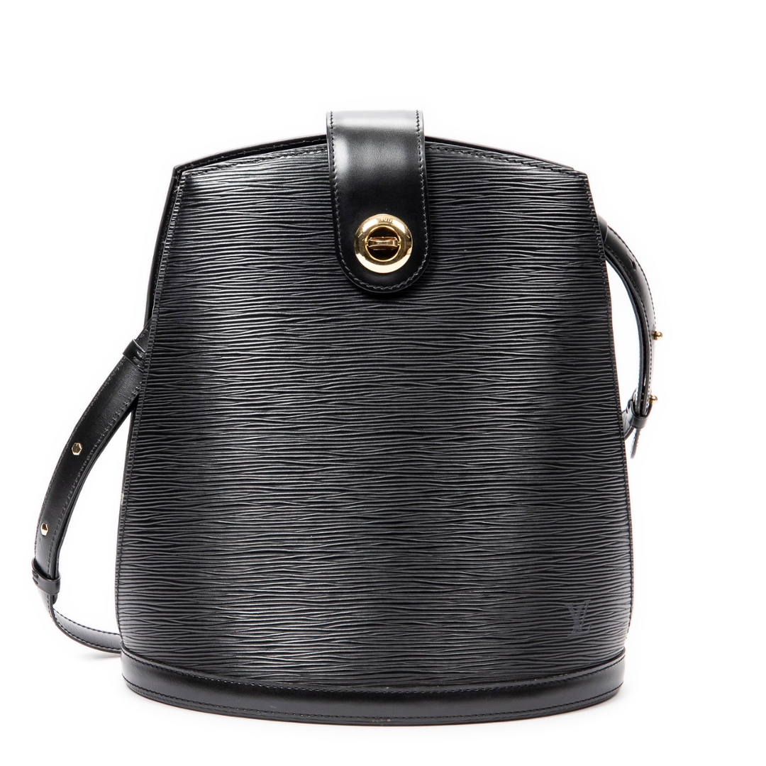 A vintage Louis Vuitton Cluny bag crafted from black calf leather, featuring the brand’s signature textured finish and a structured bucket-style silhouette. The elegant design is complemented by a distinctive top flap with a gold-tone turn-lock closure, creating a refined and timeless aesthetic suited to both day and evening wear.