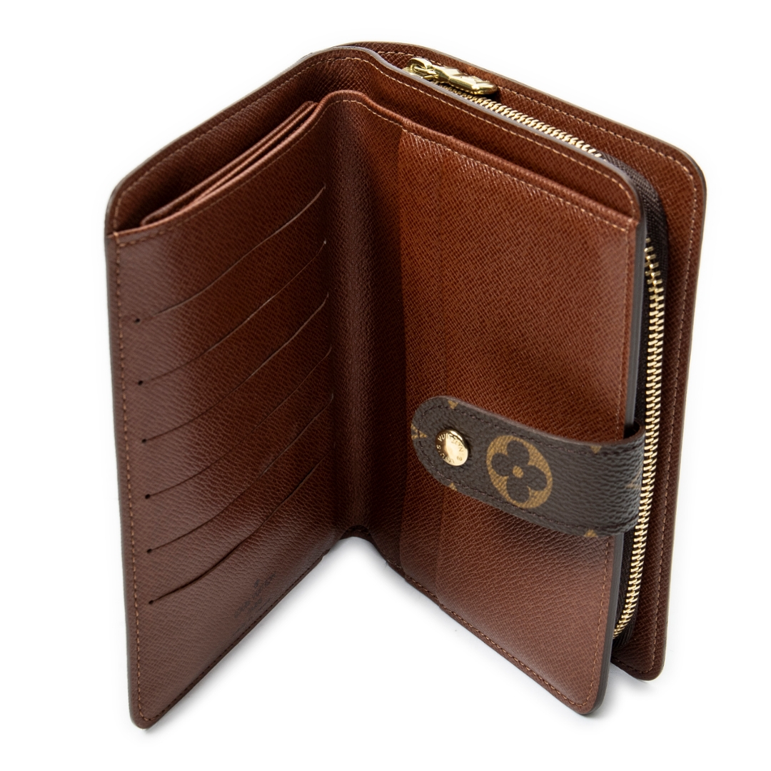 A vintage Louis Vuitton Compact Zip Wallet crafted in the iconic brown Monogram coated canvas, offering a refined and highly practical accessory for everyday organisation. The compact silhouette is both elegant and functional, featuring a secure press-stud fastening that opens to a well-arranged interior. Measuring approximately 15cm in height and 11cm in width, it provides a convenient size for daily use while maintaining a classic Louis Vuitton aesthetic.