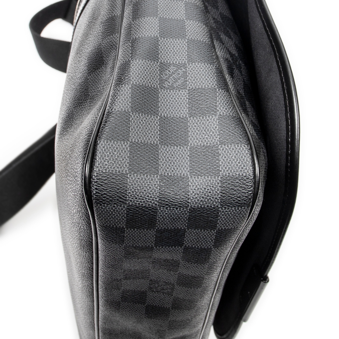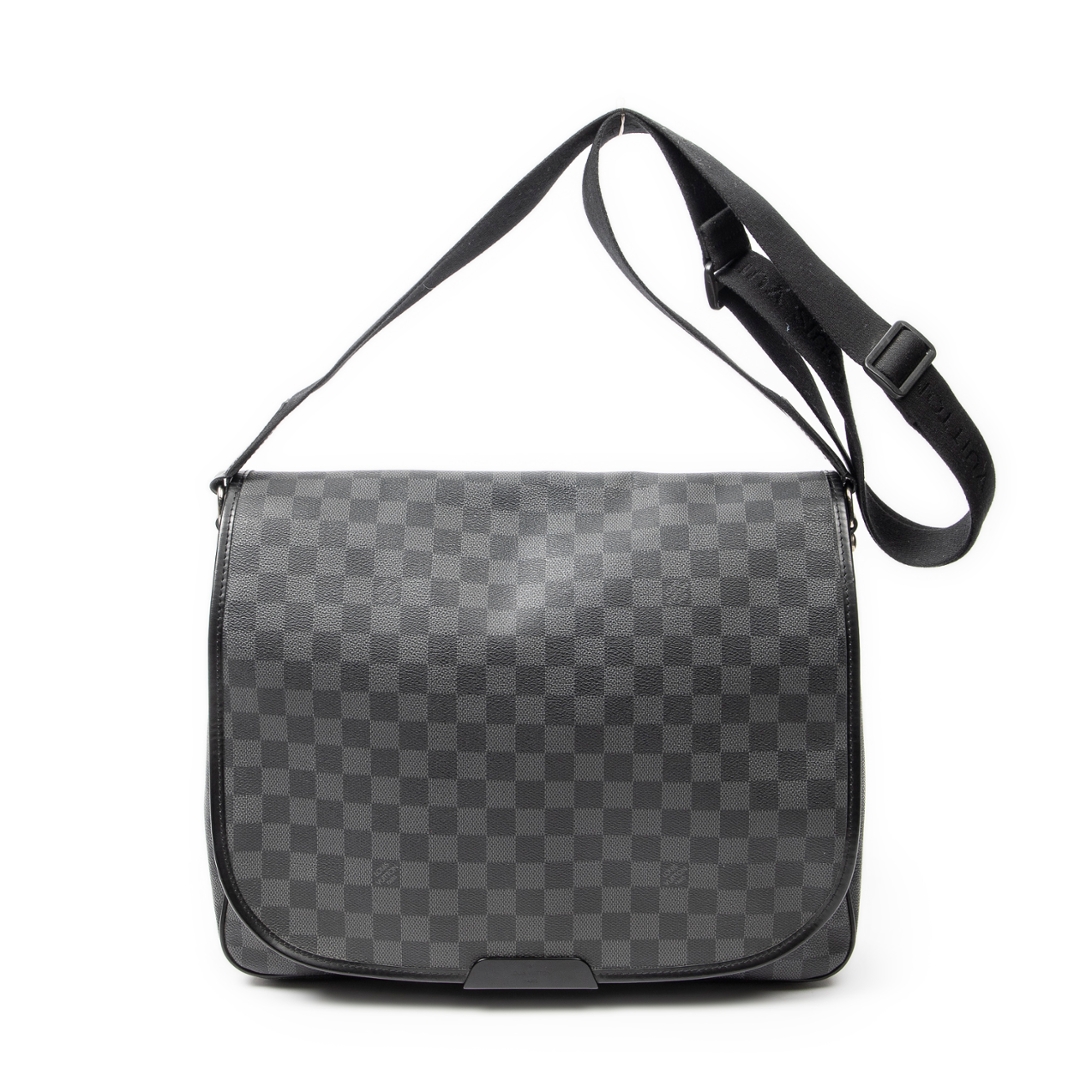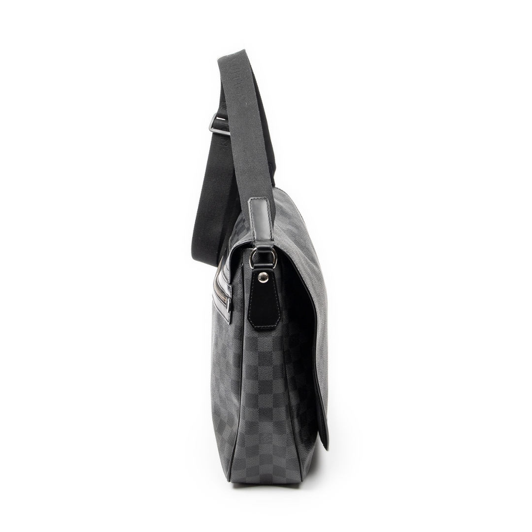 A vintage Louis Vuitton Daniel bag crafted from black and grey coated canvas in the signature Damier pattern, offering a sleek and contemporary take on classic Louis Vuitton design. The structured messenger silhouette is complemented by tonal leather trim and a wide adjustable strap, creating a refined yet practical everyday piece.