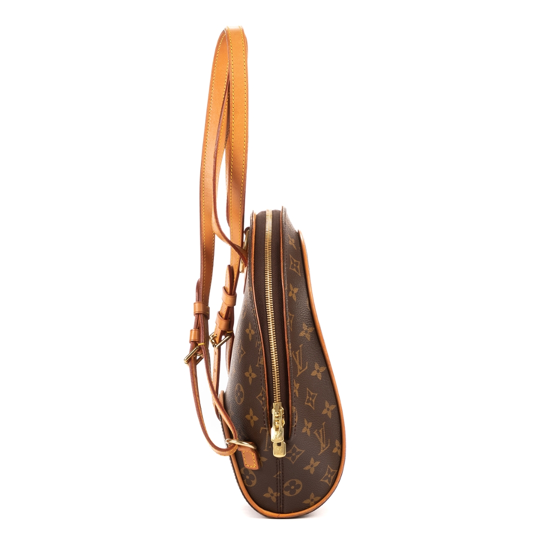 A vintage Louis Vuitton Ellipse Sac A Dos backpack crafted in the house’s iconic brown coated canvas, featuring the classic monogram pattern with natural leather trim and refined gold-tone hardware. The distinctive curved silhouette, inspired by the Ellipse line, gives this piece a unique and instantly recognisable profile within the Louis Vuitton collection.