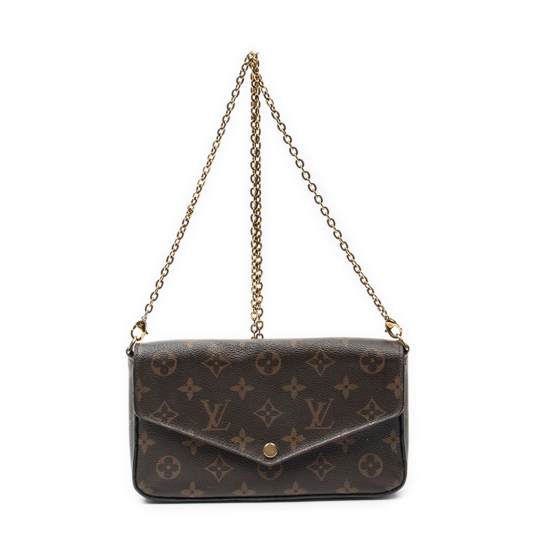 A vintage Louis Vuitton Félicie Pochette bag crafted in the iconic brown coated canvas, showcasing the signature monogram pattern with a sleek envelope-style silhouette. Finished with gold-tone hardware and a detachable chain strap, this refined piece offers both elegance and versatility within a compact design.