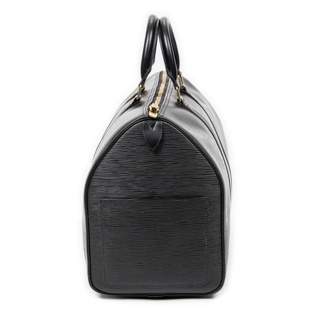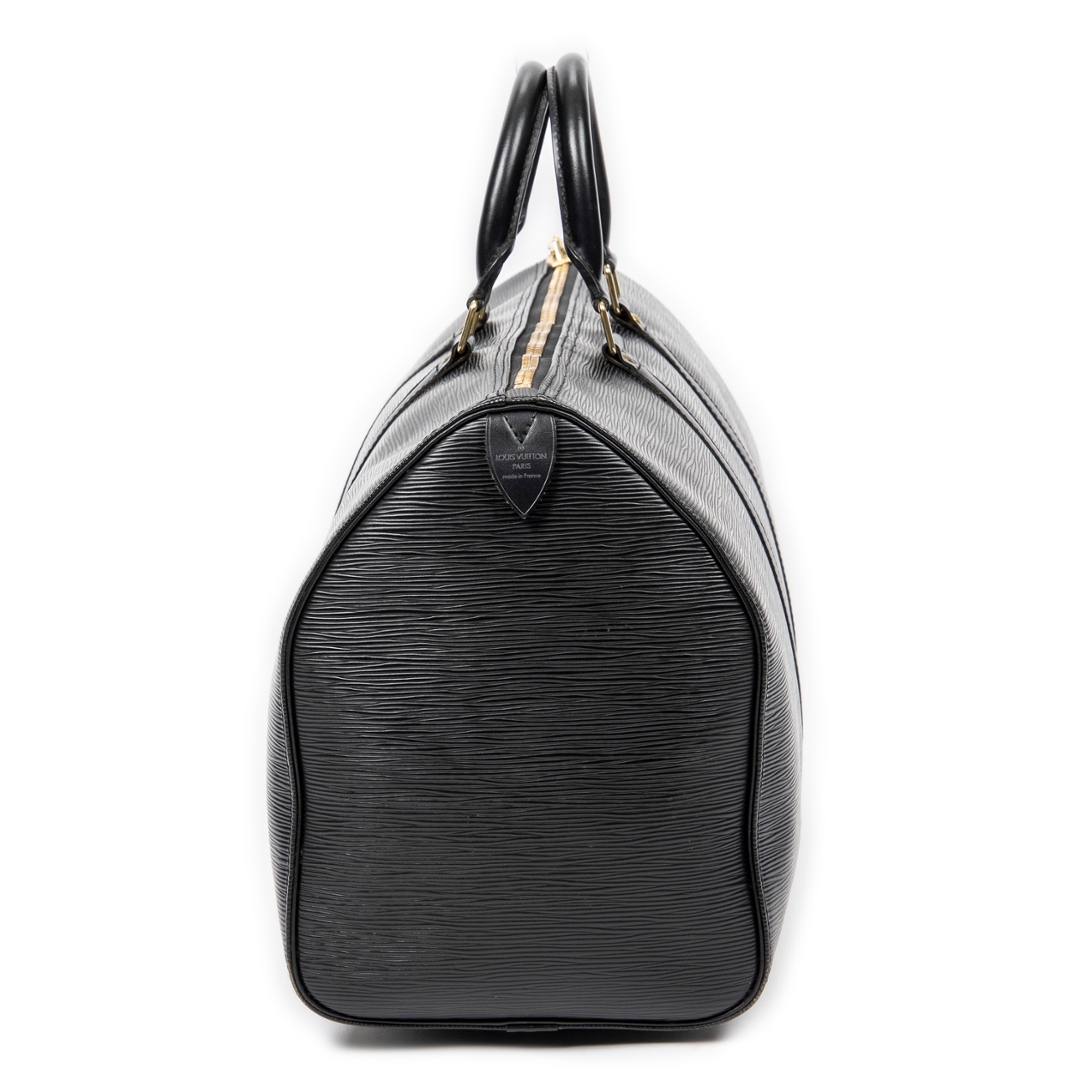 A vintage Louis Vuitton Keepall bag crafted in black calf leather, showcasing a refined interpretation of the house’s iconic travel silhouette. The textured leather exterior is complemented by matching rolled handles, structured strap detailing, and gold-tone hardware, delivering a sleek and understated aesthetic that reflects Louis Vuitton’s heritage of luxury craftsmanship.