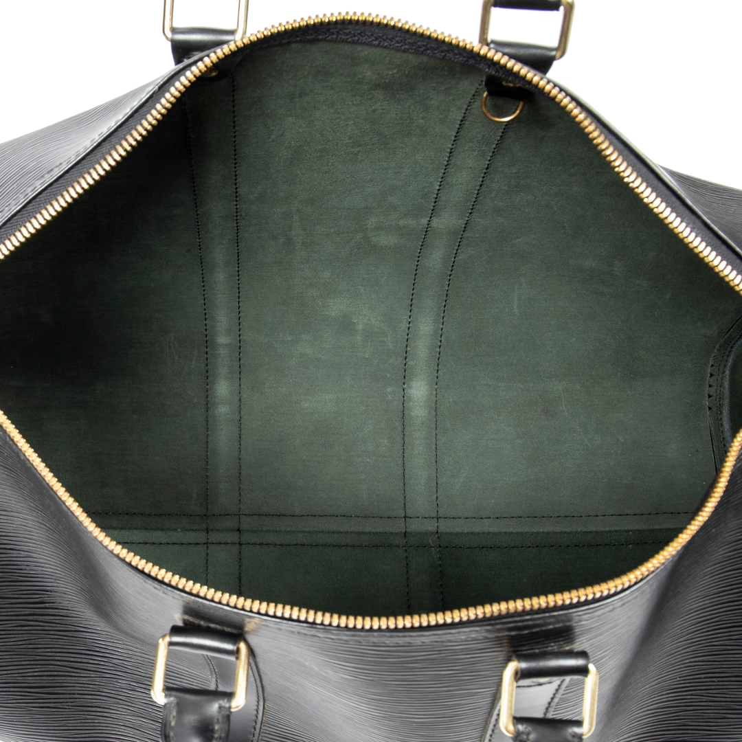 Complete with a certificate of authenticity, this black leather Keepall represents a timeless and highly sought-after Louis Vuitton travel piece with enduring appeal.