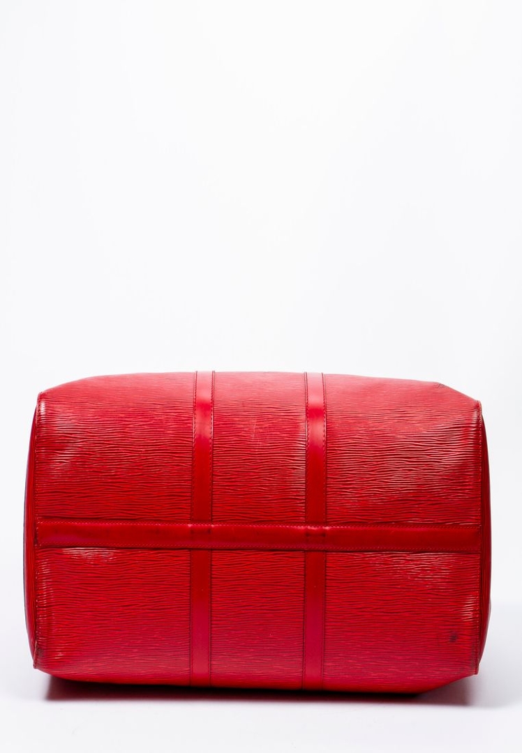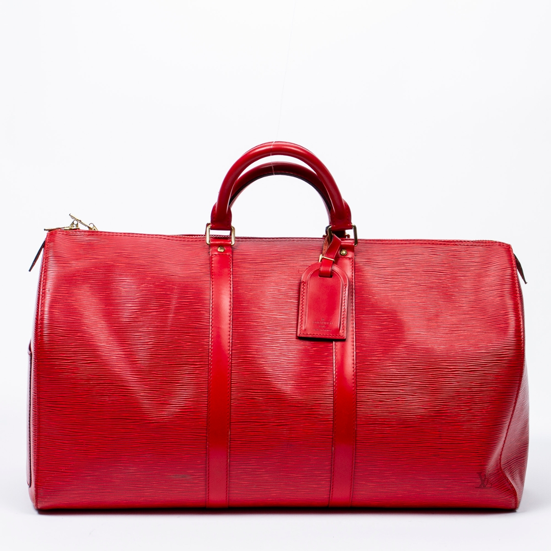 A vintage Louis Vuitton red calf leather Keepall bag with a certificate of authenticity. Approximately 29cm height, 52cm width.