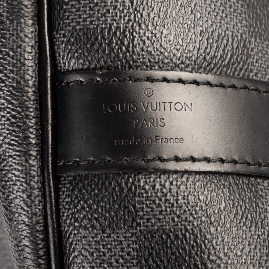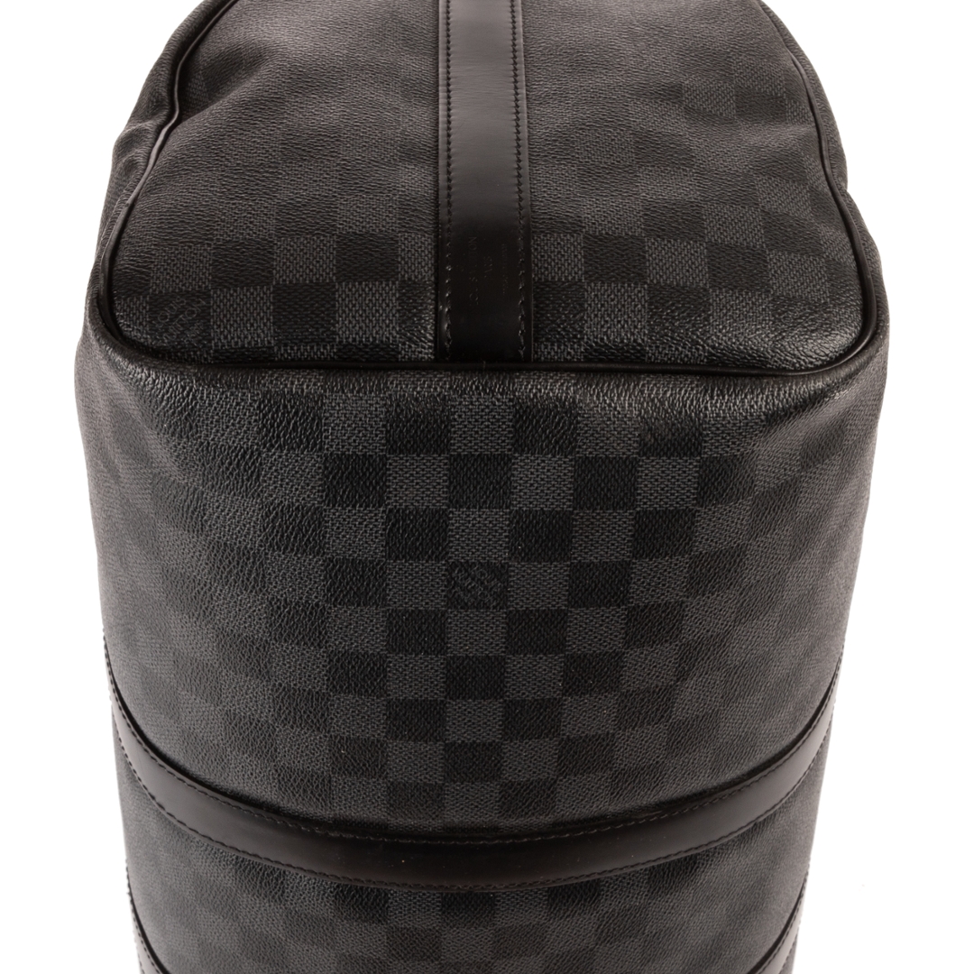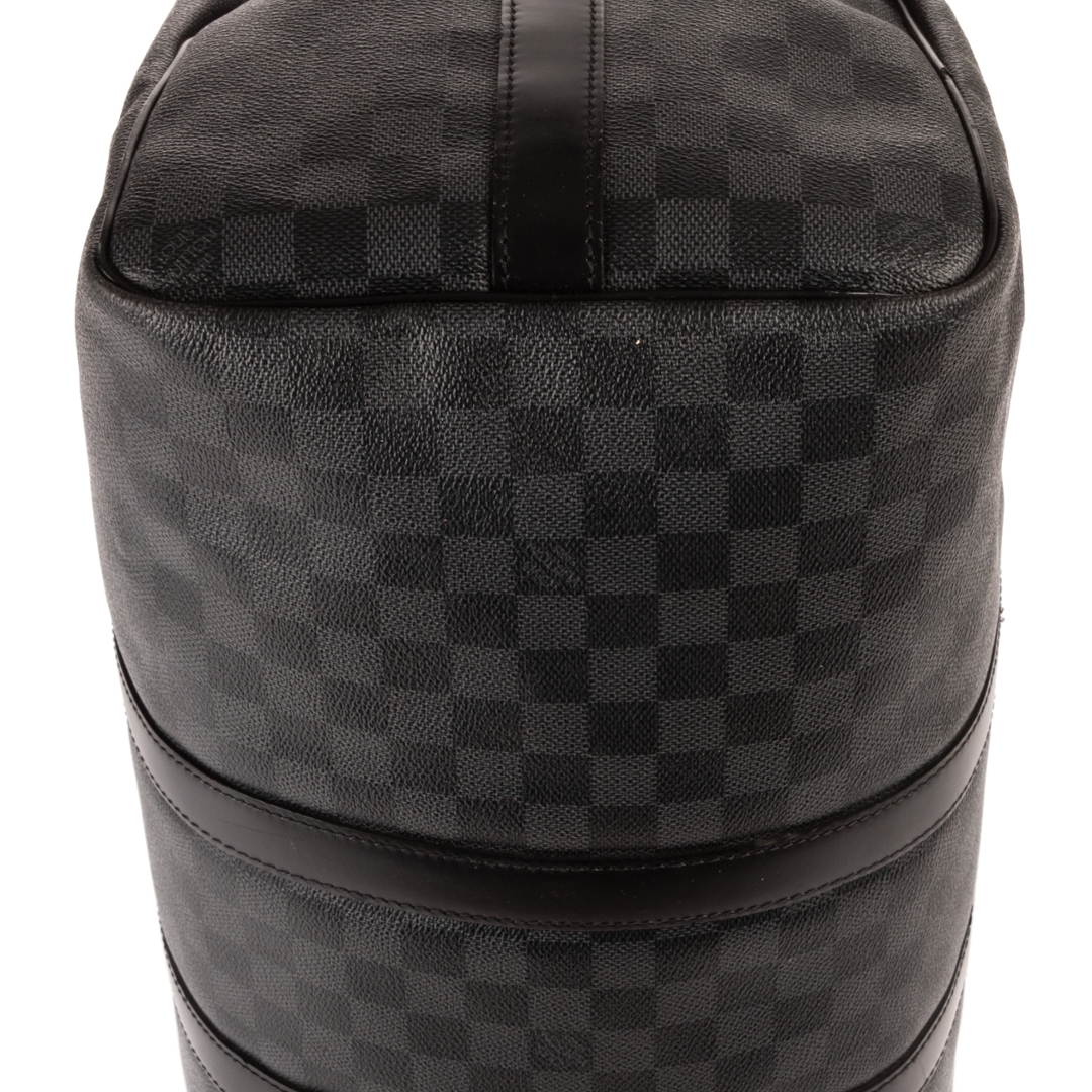 A vintage Louis Vuitton Damier Graphite coated canvas Keepall Bandoulière bag, presenting a contemporary take on the house’s iconic travel design. Crafted in the sleek black and grey Damier Graphite pattern with matching leather trims, rolled handles, and silver-tone hardware, this piece offers a refined and modern aesthetic while maintaining classic Louis Vuitton appeal.