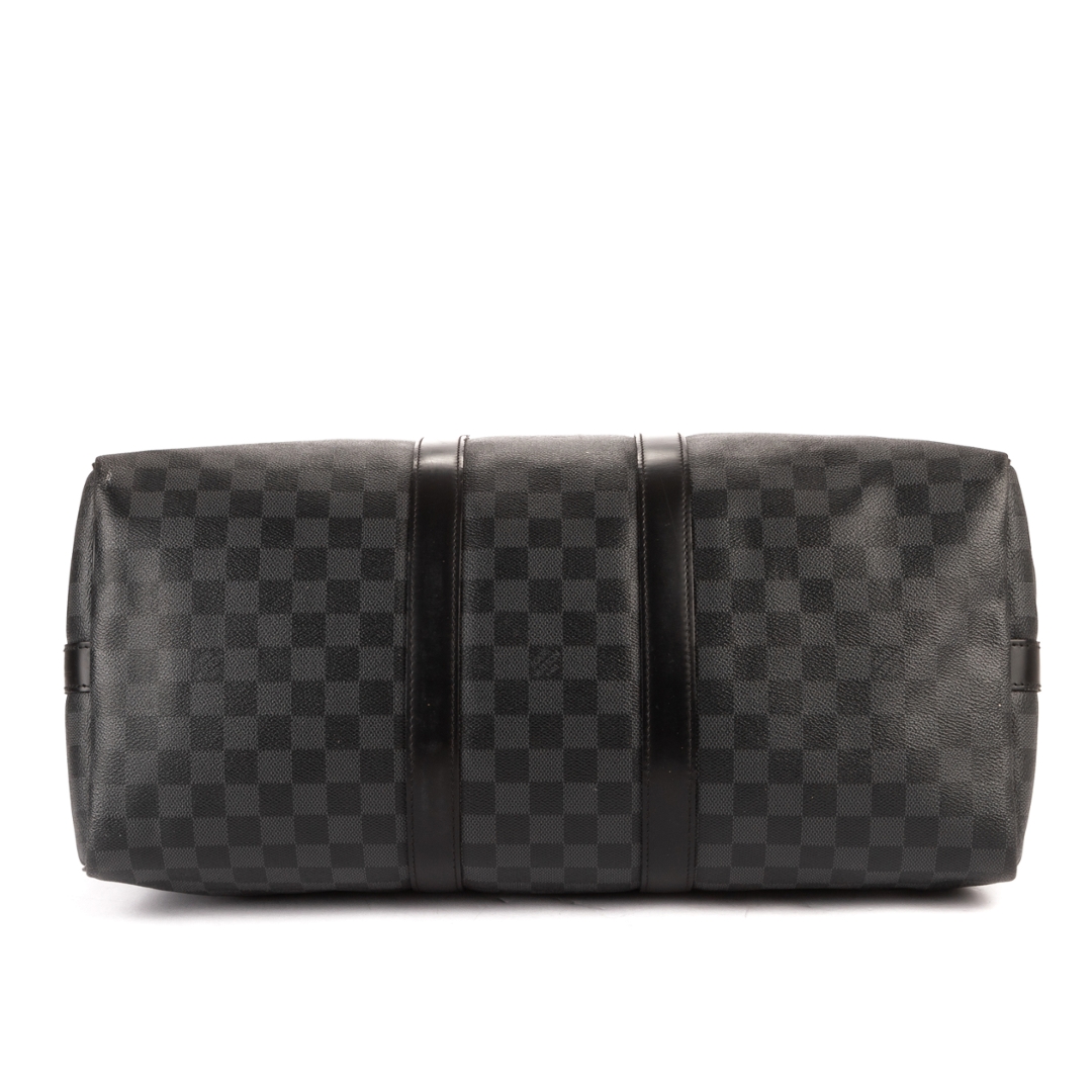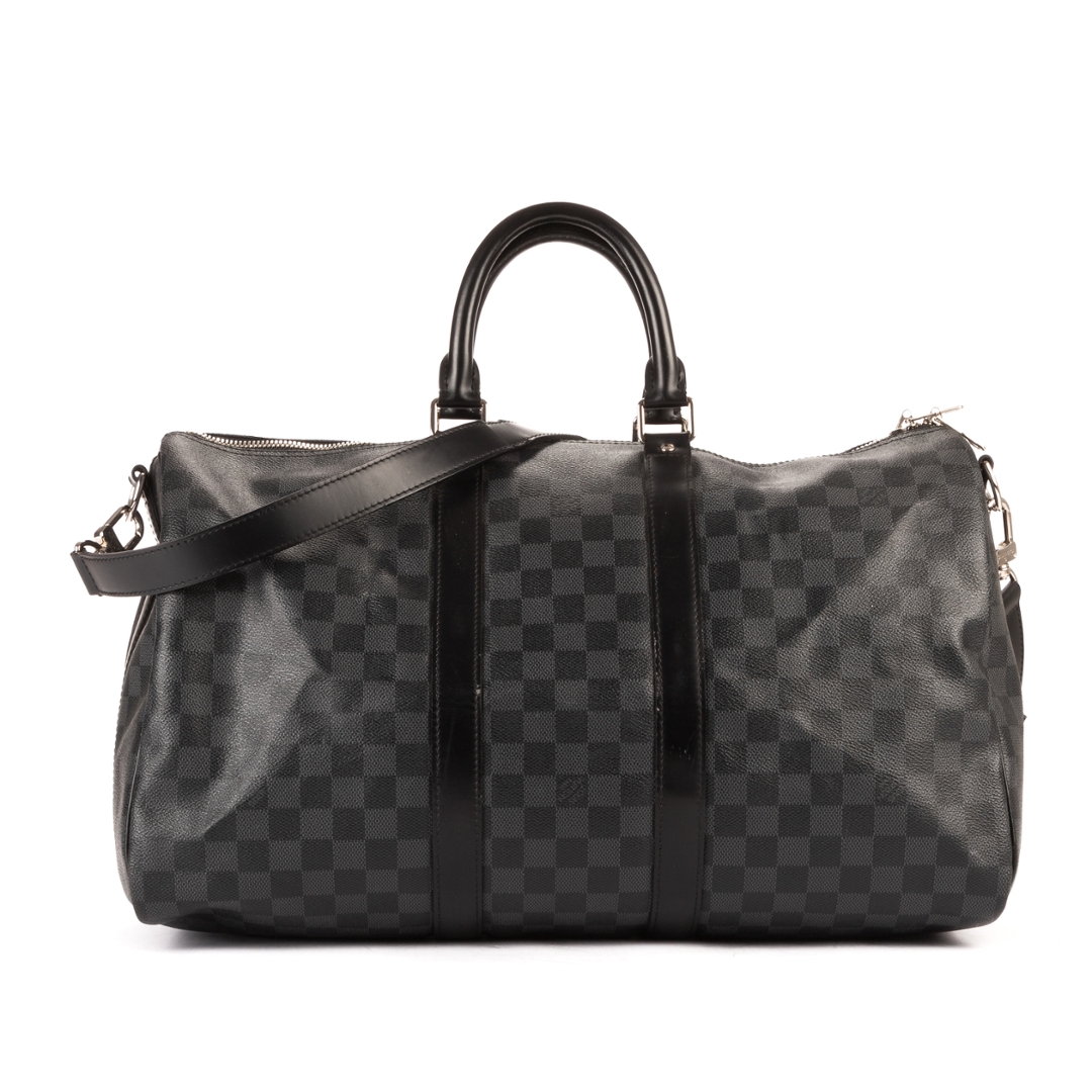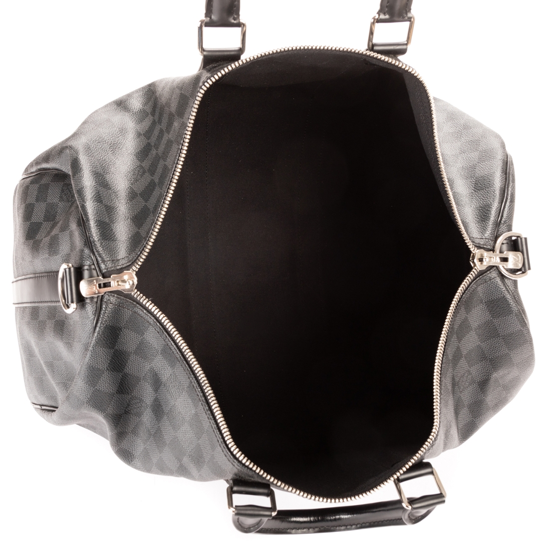 A vintage Louis Vuitton Damier Graphite coated canvas Keepall Bandoulière bag, presenting a contemporary take on the house’s iconic travel design. Crafted in the sleek black and grey Damier Graphite pattern with matching leather trims, rolled handles, and silver-tone hardware, this piece offers a refined and modern aesthetic while maintaining classic Louis Vuitton appeal.