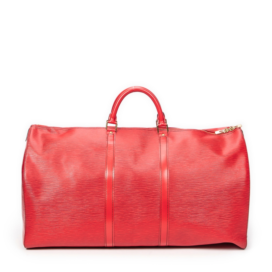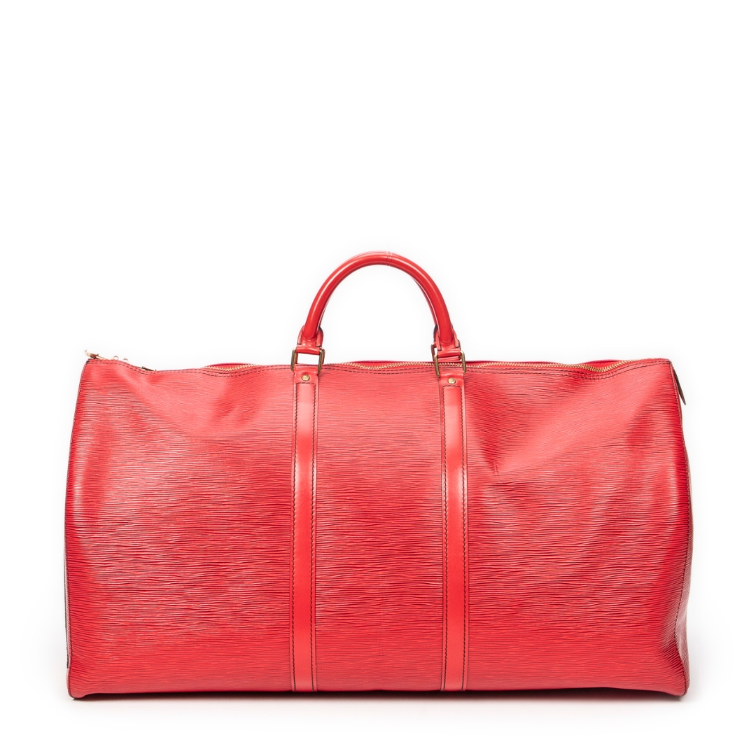 A vintage Louis Vuitton Keepall bag crafted in striking red calf leather, featuring the house’s signature textured finish and distinctive black contrast stitching. This bold interpretation of the classic travel silhouette is complemented by matching rolled handles and gold-tone hardware, delivering a statement piece that blends heritage design with a contemporary edge.
