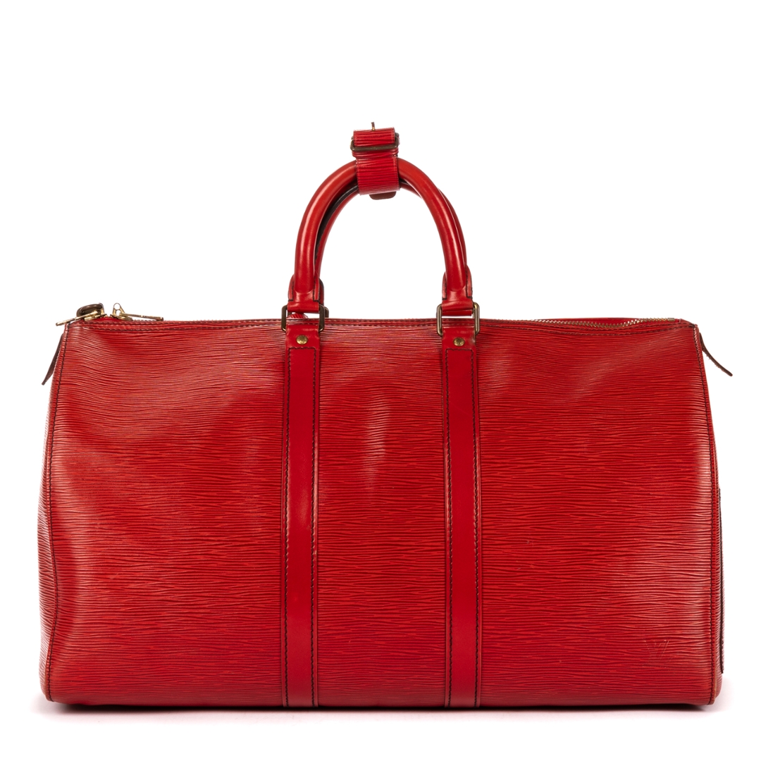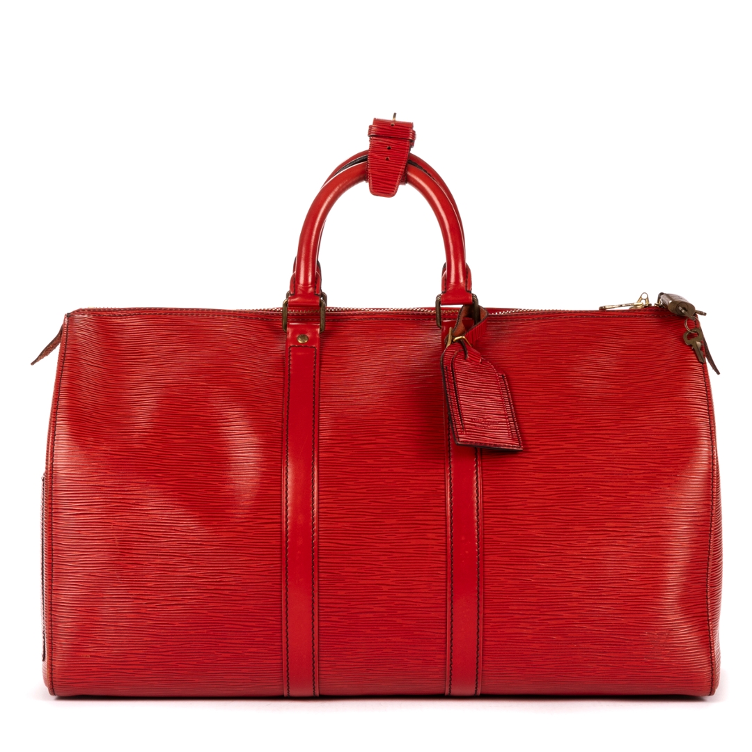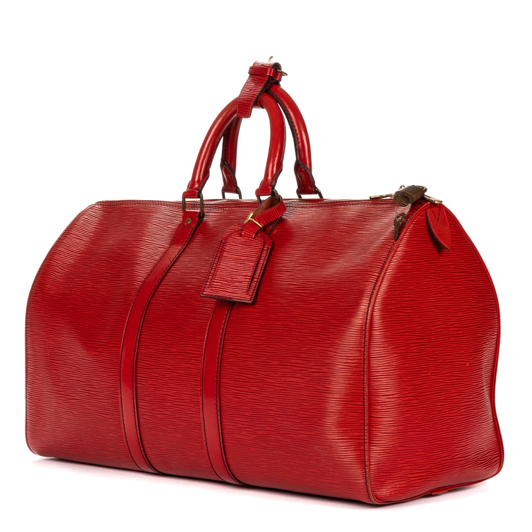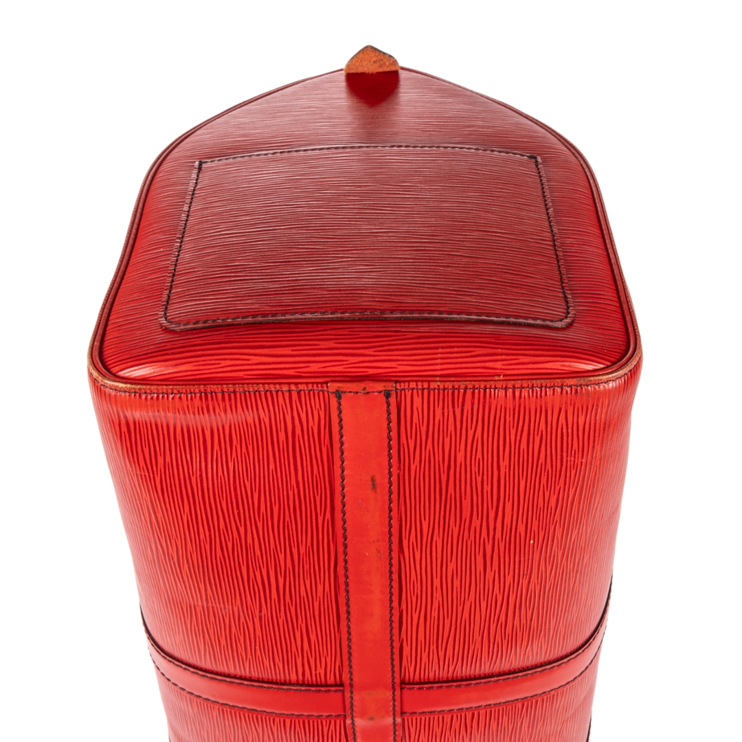 A vintage Louis Vuitton red calf leather Keepall Black Stitchings bag with a certificate of authenticity, Approximately 27cm height, 47cm width.