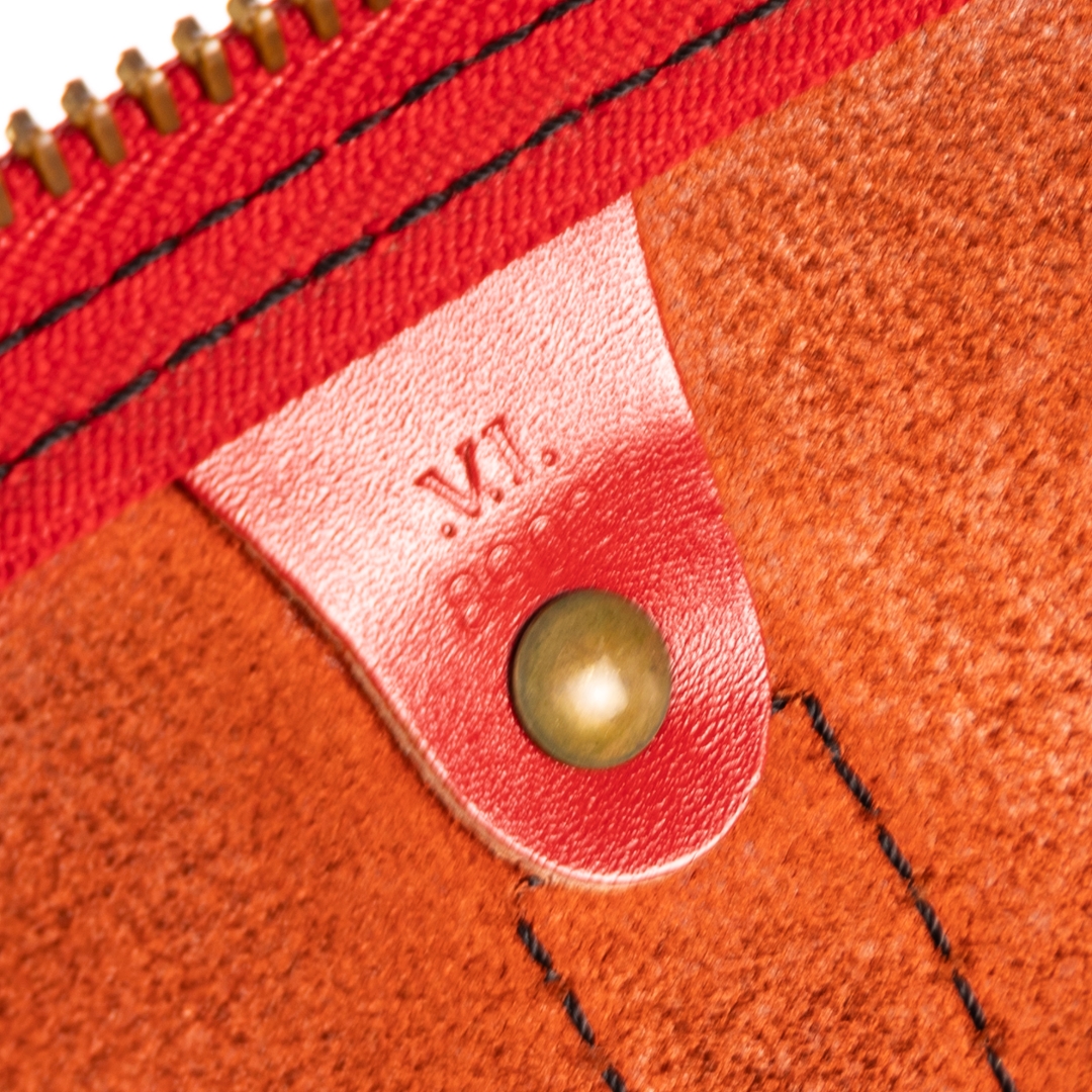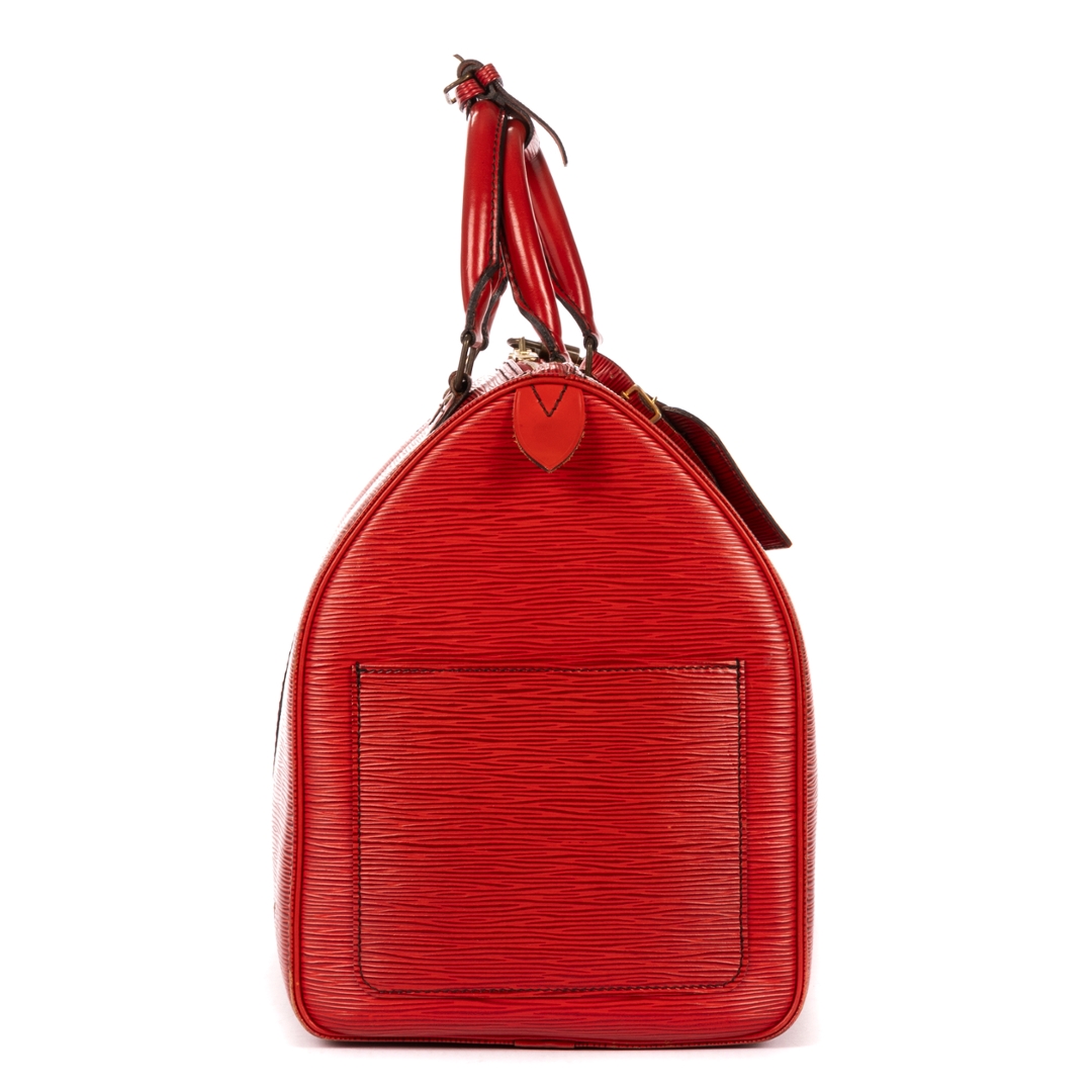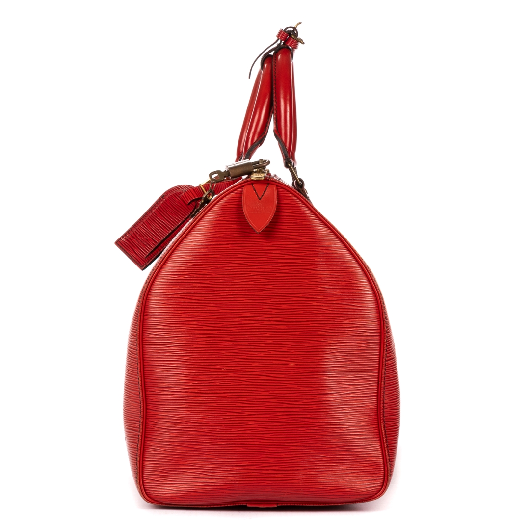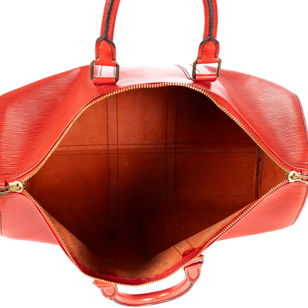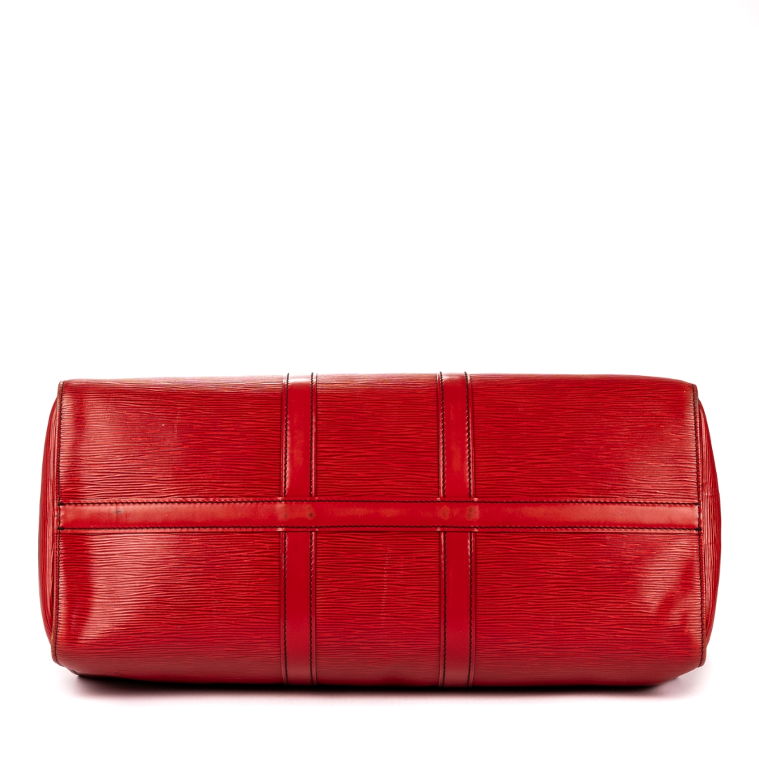 A vintage Louis Vuitton red calf leather Keepall Black Stitchings bag with a certificate of authenticity, Approximately 27cm height, 47cm width.